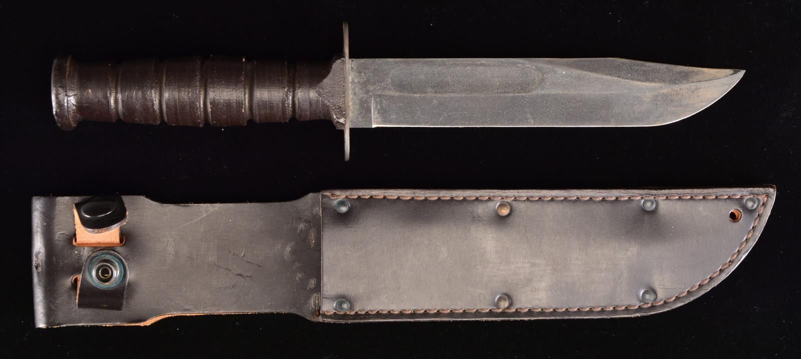 KNIFE. Blade is marked on left ricasso w/ “US CAMILLUS N.Y.”. Knife has dark gray phosphate finish, leather washer handle & straight cross guard. Unmarked brown leather sheath assembled w/ split rivets. CONDITION: metal parts of knife retain 80% phosphate type finish w/ light wear & scratches. Blade & false edge have been sharpened. Scabbard has tight stitching, very light wear & scuffing. (02-13852/RW). $100-200.
