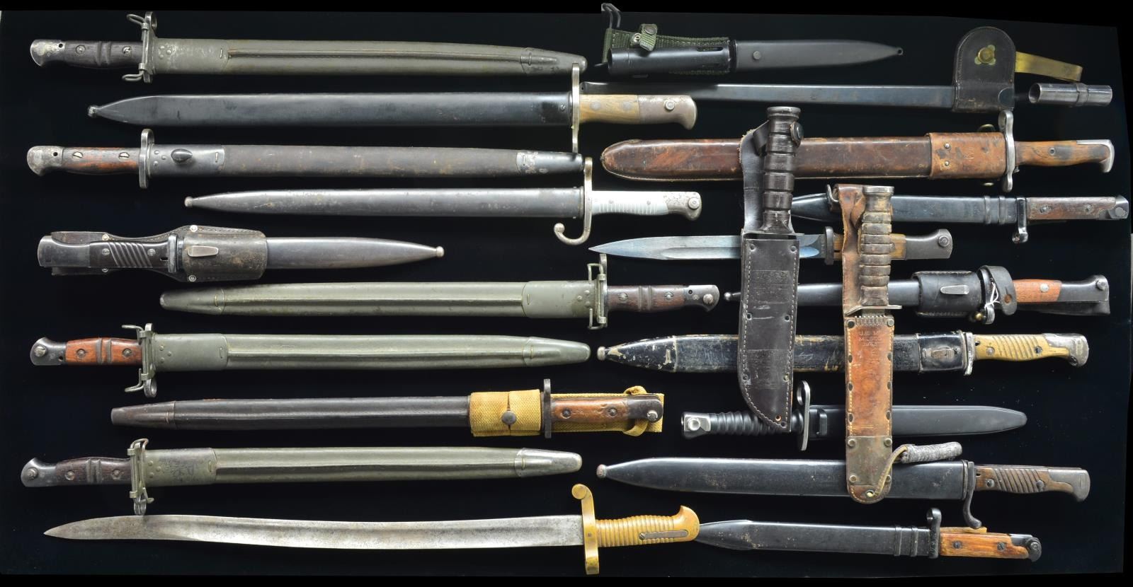 1) Collins & Co. M1862 Zouave bayo. 2) US Cadet Rifle M1873 with scabbard & frog. 3) US Model 1905 "1909" dated w/ RIA 1921 leather covered scabbard. 4) US M3 fighting knife w/ 1943 date Milsco leather scabbard. 5) Vietnam Era Cammilus fighting knife. 6) Remington US 1913/17 bayo w/ scabbard. 7) 3 Remington 1917 bayos w/ scabbards. 8) 2 English 1907 w/ out quillion w/ scabbards (1 w/ frog). 9) English 1888 Mark II bayo. 10) English No. 9 MK 1 w/ scabbard. 11) Belgian 1965 FAL w/ scabbard. 12) 2 Russian M1940 Tokarev bayos w/ scabbard. 13) Mauser German 1898/05 w/ scabbard. 14) M1908/05 converted to fighting knife w/ scabbard. 15) Argentine 1891 w/ scabbard. 16) 2 German K98 bayos (1 w/ matching scabbard & frog). 17) Yogo M48 w/ scabbard & frog. 18) Swiss 1911 pioneer sawback w/ scabbard. (02-14095/ZAL). $600-1,000.