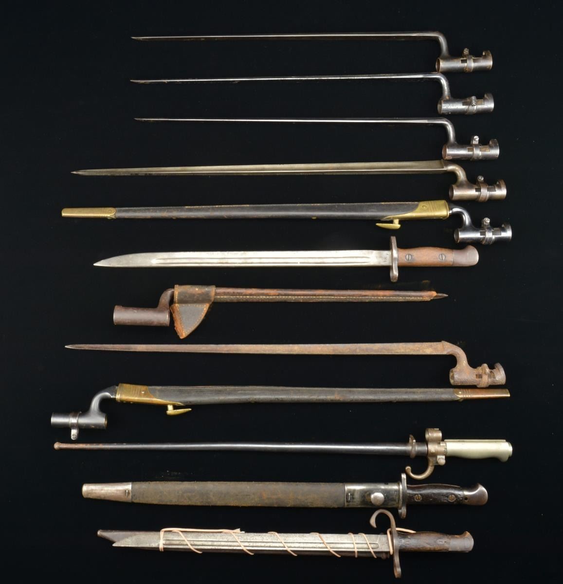 This varied lot of bayonets includes 3 M1873 45-70 bayonets w/ a blued finish, all w/ no scabbards. / 1 P1876 Martini Henry bayonet w/ blued socket & original scabbard. / 1 P1876 Martini Henry bayonet w/ traces of blue on the socket, no scabbard. / 1 Excavated P1876 Martini Henry bayonet, no scabbard. / 1 P1895 Martini Enfield bayonet & scabbard. / 1 M1816 US bayonet & partial scabbard. / 1 Japanese Arisaka bayonet & scabbard from the Kokura Arsenal. / 1 British P1907 bayonet & scabbard. / 1 British P1907 bayonet, no scabbard. CONDITION: all bayonets show light to moderate wear except as noted. (02-14098/BF). $600-900.