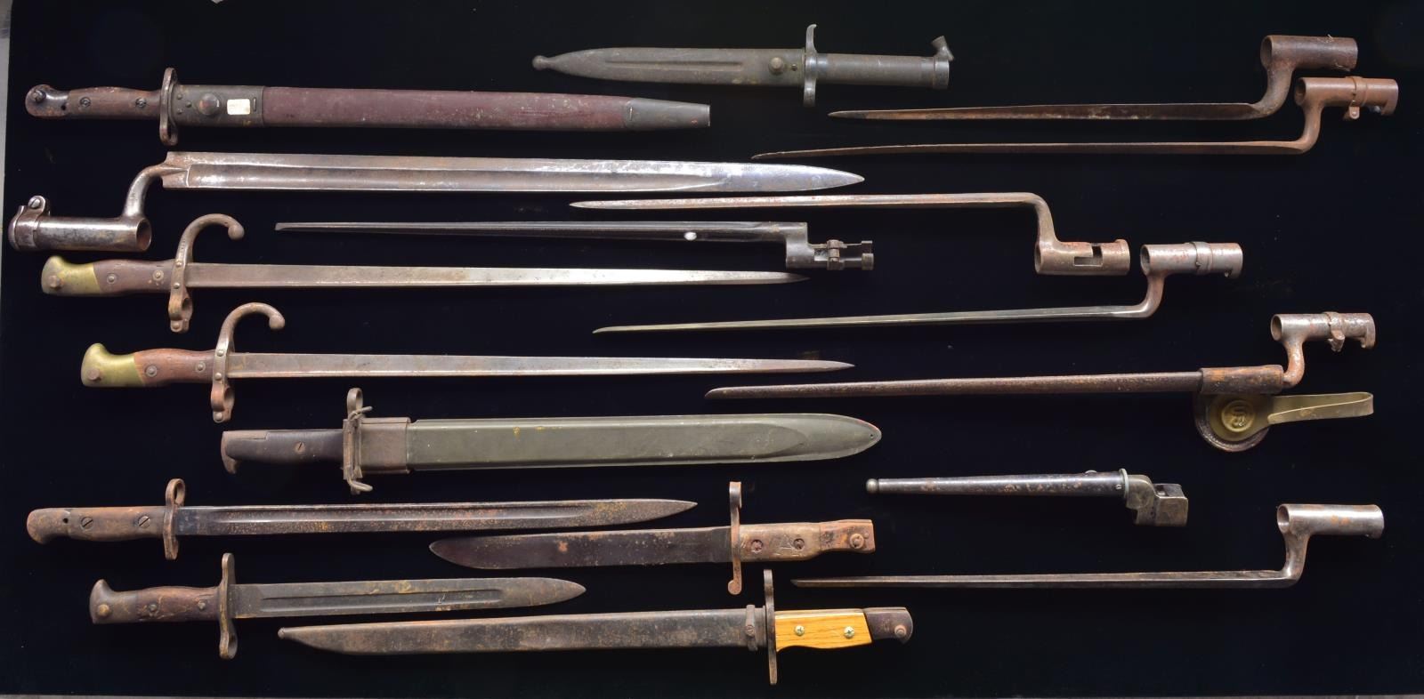 This varied lot of bayonets includes 1 M1849 Austrian Jager carbine bayonet, no scabbard. / 2 French M1874 Gras bayonet, no scabbard. / 1 US M1816 bayonet, no scabbard. / 1 US M1795 bayonet, no scabbard. / 1 US M1808 bayonet, no scabbard. / 2 US M1855 bayonets, no scabbards. / 1 US M1873 bayonet & scabbard. / 1 Russian M1891 Mosin Nagant bayonet, no scabbard. / 1 British No. 4 MKI bayonet & scabbard. / 1 British P1907 bayonet & scabbard. / 1 Arisaka bayonet & scabbard, grips replaced. / 1 British P1907 bayonet, no scabbard. / 1 US M1942 bayonet & scabbard. / 1 Swedish M1896 bayonet & scabbard. / 1 US M1892 Krag Jorgenson bayonet, no scabbard. / 1 US M1905/10 Ross rifle bayonet featuring US ordinance stamps on the grip, no scabbard. / 1 Reproduction US Civil War belt buckle. CONDITION: bayonets generally show moderate wear. Most have some degree of oxidation. Bayonets are complete except as noted. (02-14182/BF). $500-800.