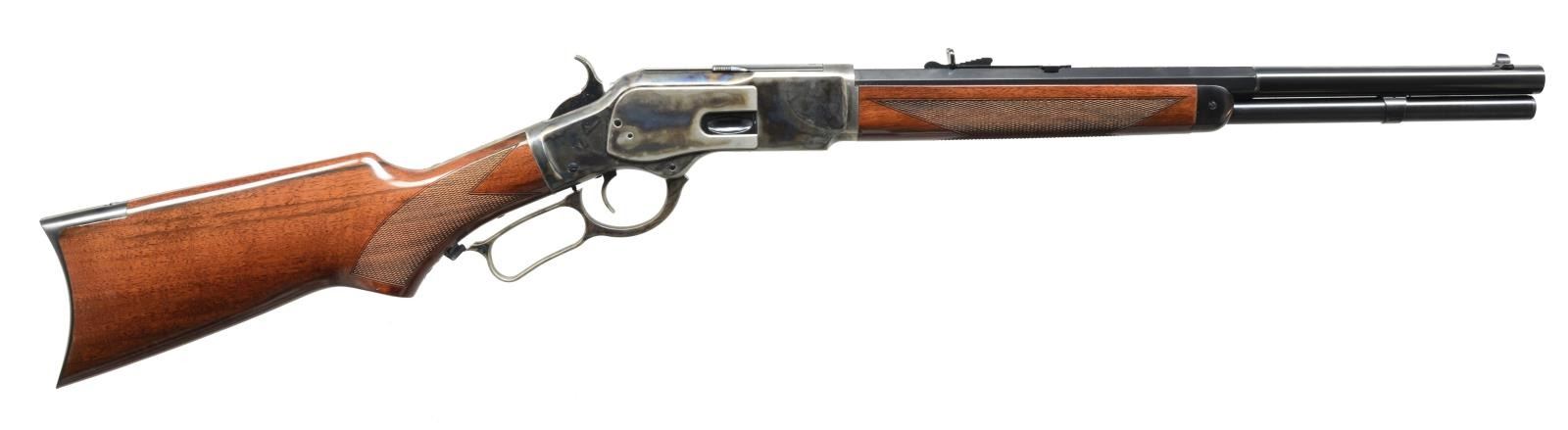 BRUSH POPPER LEVER ACTION RIFLE. Cal. 45 Colt. S# W21760. Bbl. 18" oct. to rnd. Blade front sight w/ elevator adj. rear sight. Full length mag. Case colored 3rd Model action. Checkered walnut rifle forearm & pistol grip stock w/ crescent steel buttplate. Mfg. in Italy by Uberti. UNATTACHED ACCESSORIES: original box & shipping carton. CONDITION: near new retaining over 99% wood & metal finish. Near excellent bore. (20-4132/DS). MODERN. $800-1,200.