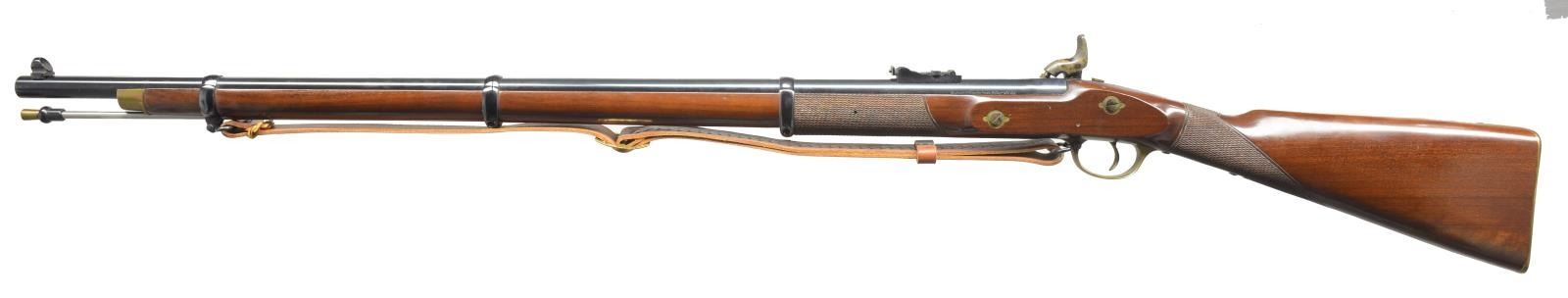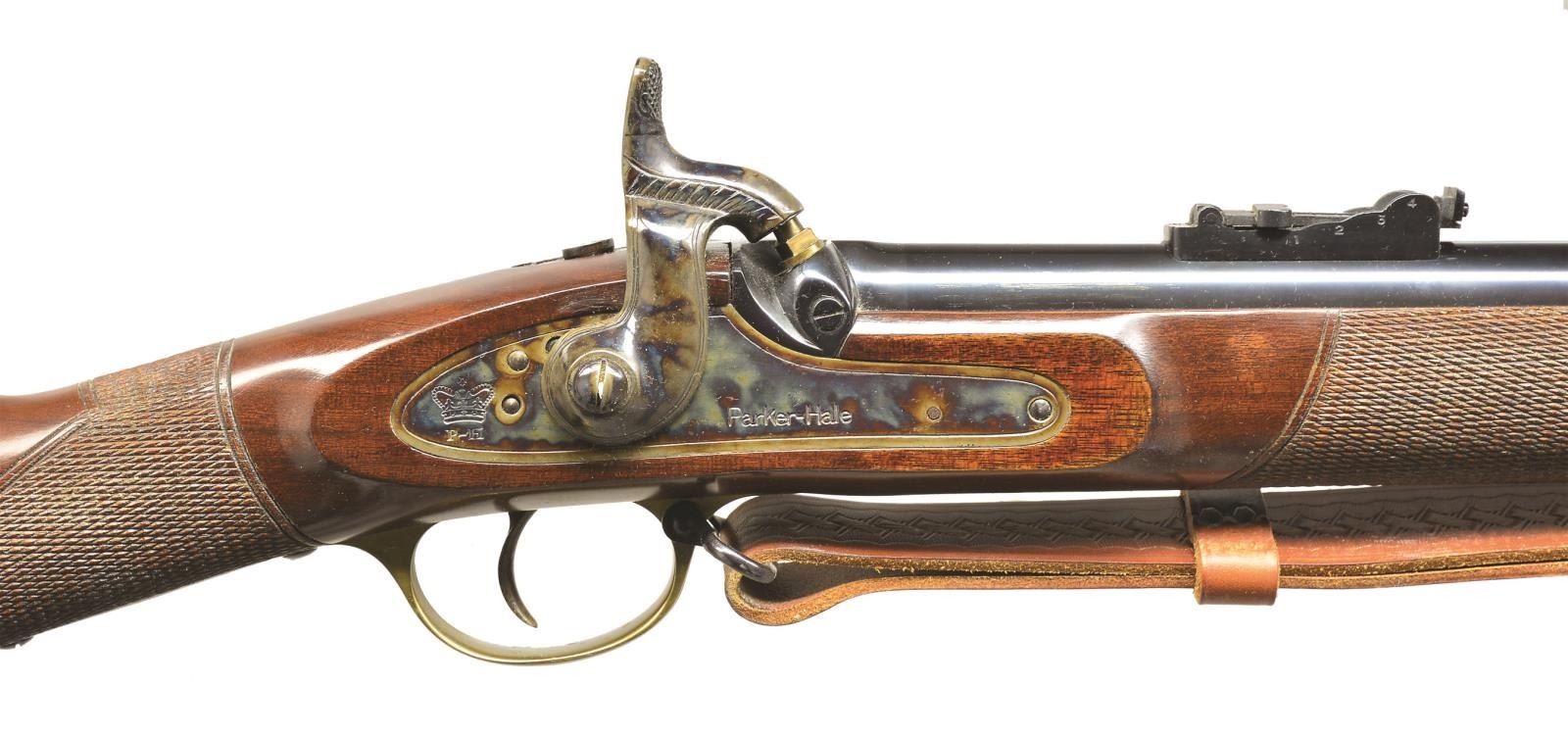 Cal. 451. S# 922. Bbl. 36" w/ covered post front sight & 1,000 yd. graduated leaf rear sight. Case colored lock & hammer marked "PARKER-HALE" w/ crown over "V" behind hammer. Military style 3 band target rifle. Walnut stock w/ checkered wrist & forearm having brass fittings. Brass tipped iron ramrod w/ muzzle guide. Fitted w/ military style sling & swivels. English Mfg. & proof marks. CONDITION: appears unused, retaining over 99% metal finish. Stock shows a few very sm. handling marks. Bright near excellent bore. (01-17833/DS). ANTIQUE. $700-1,000.