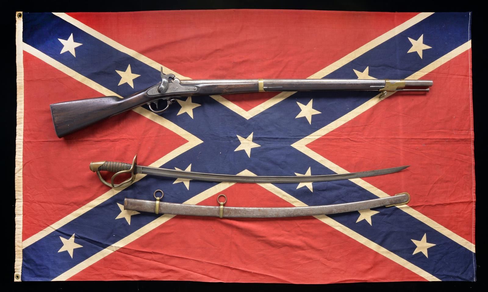 1) Fine reproduction Palmetto Armory marked lockplate w/ 33" smooth bore 69 cal. bbl., 49" overall. Mounted w/ two brass bands, SC surcharged buttplate. CONDITION: very good to fine overall, good action & bore. 2) Reproduction Ames light cavalry saber, dated 1861, complete w/ scabbard. CONDITION: very good to fine overall. 3) Reproduction printed 3 x 5’ Confederate battle flag CONDITION: generally good. PROVENANCE: From the Estate of Ronald A. Katchuk. (01-17935/JS). ANTIQUE. $300-400.
