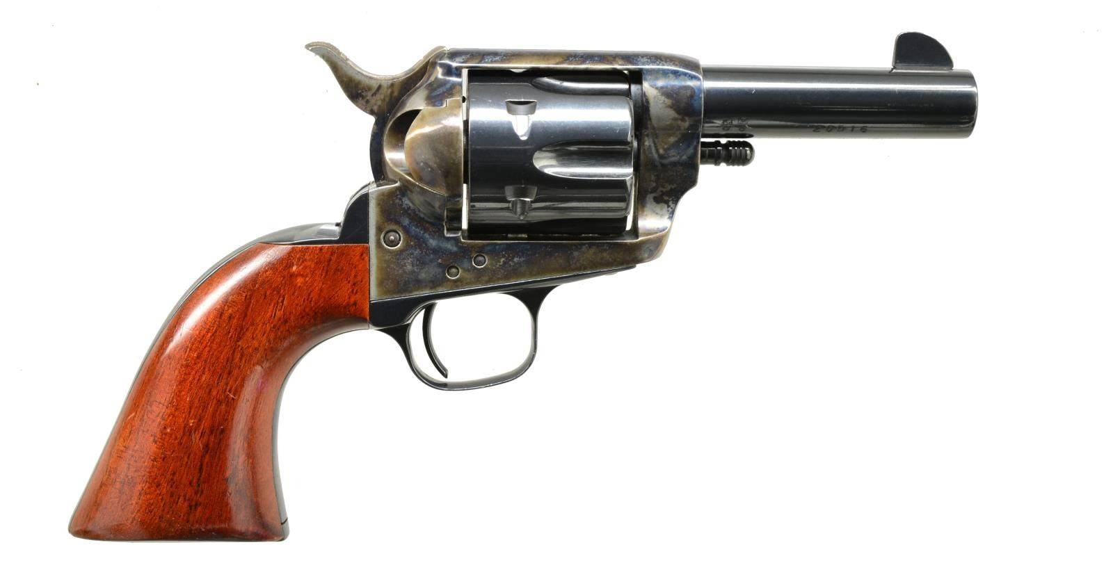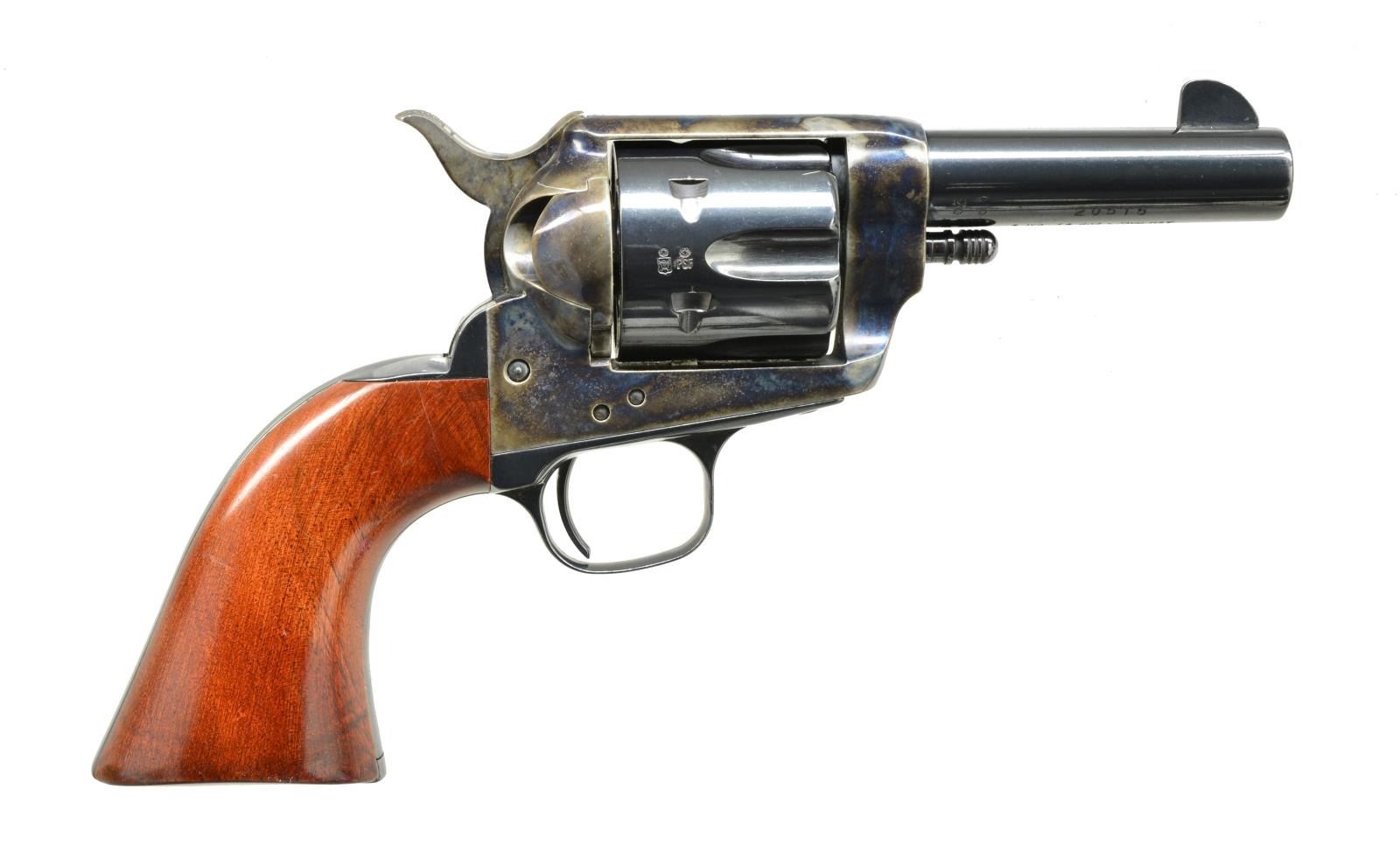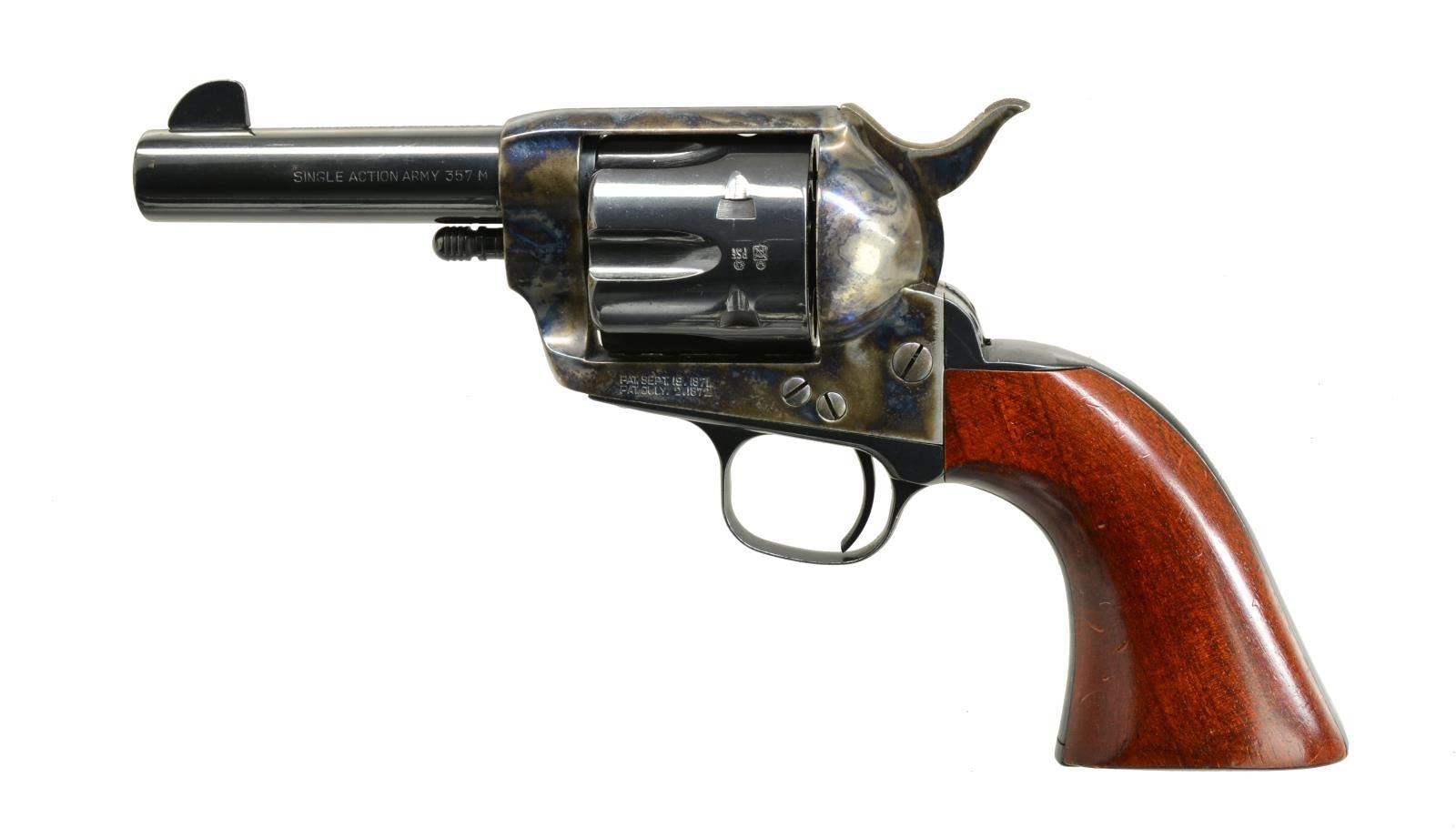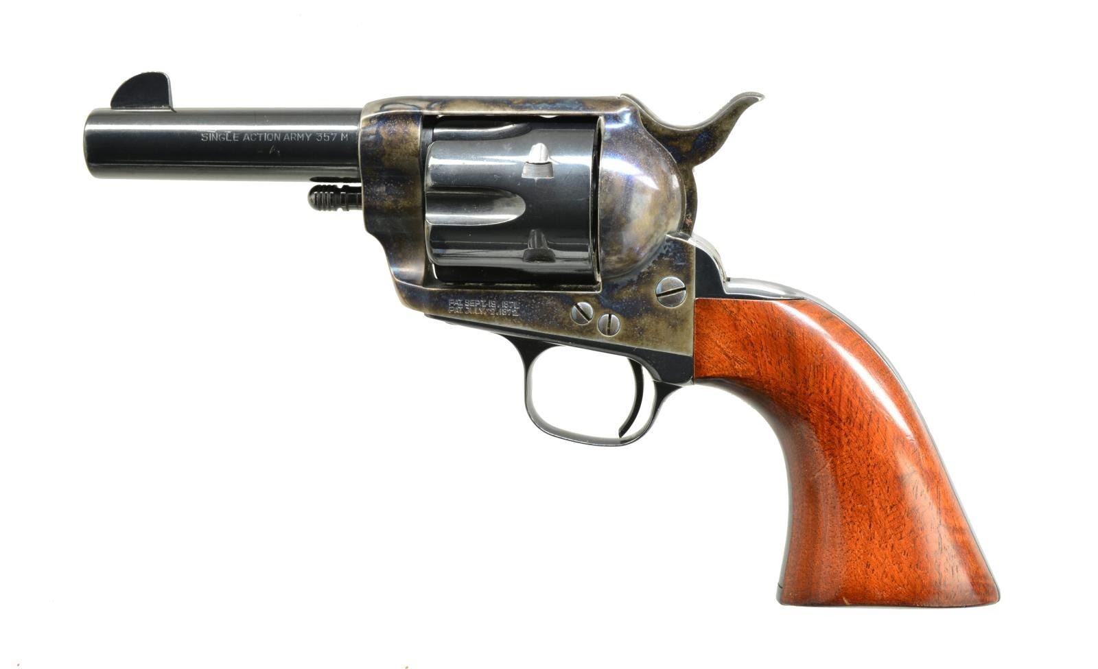 REVOLVERS. ALL: cal. 357 Mag. Bbls. 3 1/2" w/ blade front sights. Made w/out ejectors. 6 Shot fluted cyls. Blue finish w/ case colored hammers & triggers. 1 Piece walnut grips. Mfg. in Italy. 1) S# SA20516. CONDITION: 98% bbl. & cyl. blue. Frame retains 95% case colors showing spots of surface corrosion. Grips show scattered scratches & marks. Bright bore w/ strong rifling. (20-3825/DS) 2) S# SA20515. CONDITION: bbl. & action retain 98% blue showing sm. marks. Frame retains 98% case colors showing spots of freckling. Grips show scratches & marks. Bright bore w/ strong rifling. (20-3830/DS). ALL MODERN. $600-800.