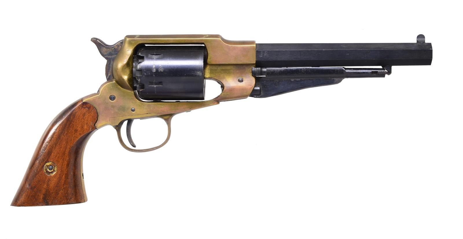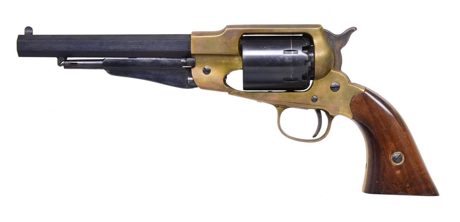 Cal. 36. S# 616. Bbl. 6 1/2" oct. 6 Shot rnd. cyl. Blue finish w/ brass frame & trigger guard. 2 Piece hardwood grips. Italian mfg. CONDITION: 90% blue showing cyl. drag line. Brass is acquiring a dark tarnish. Grips show scattered handling marks. Good mechanics. Bright bore retains strong rifling. (01-18178/DS). ANTIQUE. $50-100.