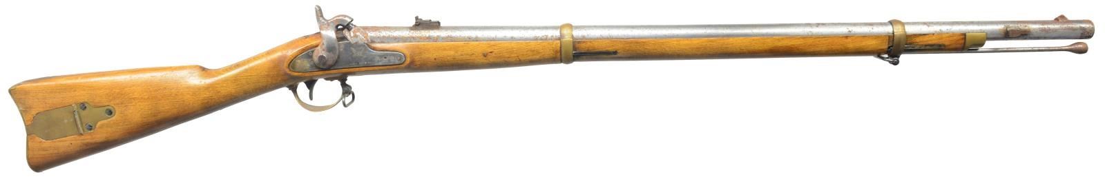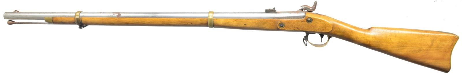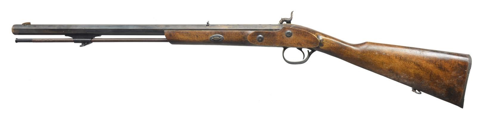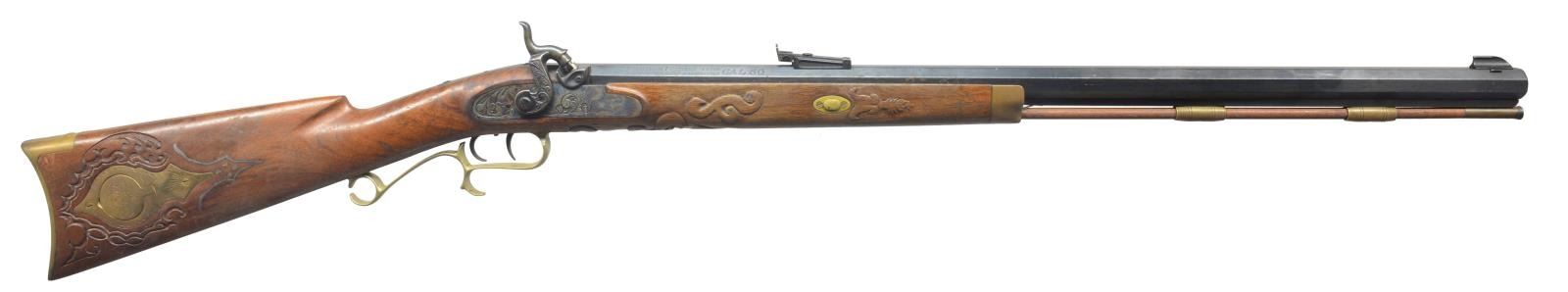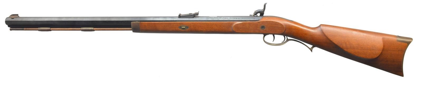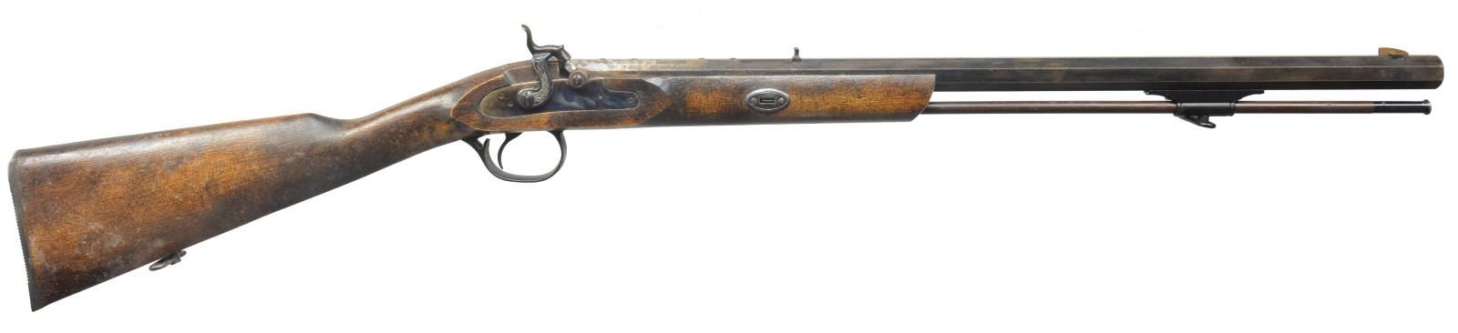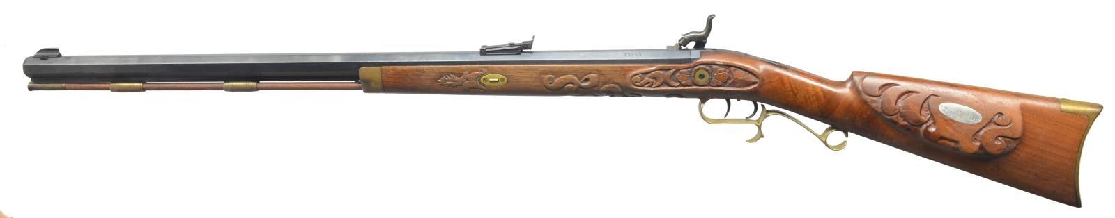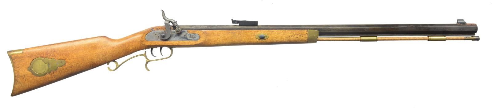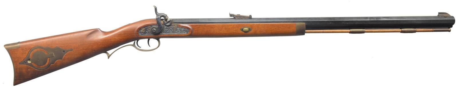 1) ARMSPORT HAWKEN. Cal. 50. S# 5102/218812. Bbl. 29" oct. w/ blade front sight & adj. rear. Engraved case colored lock. Dbl. set triggers. Key fastened 1/2 length cheekpiece walnut stock. Brass fittings include circular patch box, buttplate, trigger guard, nose cap along w/ key & sideplate escutcheons. Brass tip hardwood ramrod held on iron under rib by 2 brass pipes. CONDTION: bbl. retains 90% blue showing scattered spots of red rust. Stock shows light scattered spots of hand wear & marks. Brass to pleasing patina. Bore is bright w/ sharp rifling. (01-17385/DS). 2) CVA HAWKEN. Cal 54. S# 89 661641. Bbl. 28" oct. w/ bead front sight & adj. rear sight. Case colored lock. Dbl. set triggers. Key fastened 1/2 length cheekpiece hardwood stock w/ brass fittings. Brass tip hardwood ramrod held on iron under wood by 2 brass pipes. CONDITION: bbl. has mottled gray/brown appearance from cold blue w/ areas of red rust by front sight. Stock shows scattered handling marks. Bore retains sound rifling showing red rust by muzzle. (01-17386/DS). 3) THOMPSON/CENTER HAWKEN. Cal. 50. S# 27153. Bbl. 29" oct. w/ bead front sight & adj. rear. Engraved case colored lock & hammer. Dbl. set triggers. Key fastened 1/2 length cheekpiece walnut stock. Stock has extensive added deep relieve hand carving in forearm & butt areas. Cheekpiece has silver oval name plate marked "PAT SCOLLIN/73". Brass fittings include circular lid patch box, buttplate, trigger guard, nose cap & escutcheons. Patch box has added hand engraving depiction a charging buffalo. Brass tip hardwood ramrod held on by iron underrib by 2 brass pipes. CONDITION: bbl. retains 80% blue showing spots of red rust. Stock has worn finish. Bore is bright w/ sound rifling. (01-17387/DS). 4) NAVY ARMS ZOUAVE. Cal. 58. S# 29080. Bbl. 33" rnd. w/ bayonet lug, blade front sight & 3 leaf Military rear sight. Bbl., lock & hammer are finished in the white. Top of bbl. marked "ANTONIO ZOLI MADE IN ITALY". Lock has American Eagle over "NAVY ARMS CO.". Band fastened full length hardwood stock w/ brass patch box & fittings. Tulip tip iron ramrod. CONDITION: bbl., lock & hammer show scattered red rust & pitting. Stock shows scattered scratches & mildew spots. Bore shows spots of pitting. (01-17389/DS). 5) TRADITIONS DEERHUNTER. Cal. 50. S# 14-13-051547-95. Bbl. 24" oct. w/ brass blade front sight & fixed v notch rear. Bbl. is drilled for scope attachment. Case colored lock & hammer, plain trigger. Key fastened 1/2 length hardwood stock w/ rubber buttplate, sling swivels & plastic trigger guard. Iron tipped fiberglass cleaning rod held by a single pipe. Made in Spain. CONDITION: bbl. has mottled blue/brown appearance from cold blue w/ rust in breech area. Stock shows handling marks & mildew spots. Bore retains intact rifling & rust near muzzle. (01-17393/DS). ALL ANTIQUE. $500-800.
