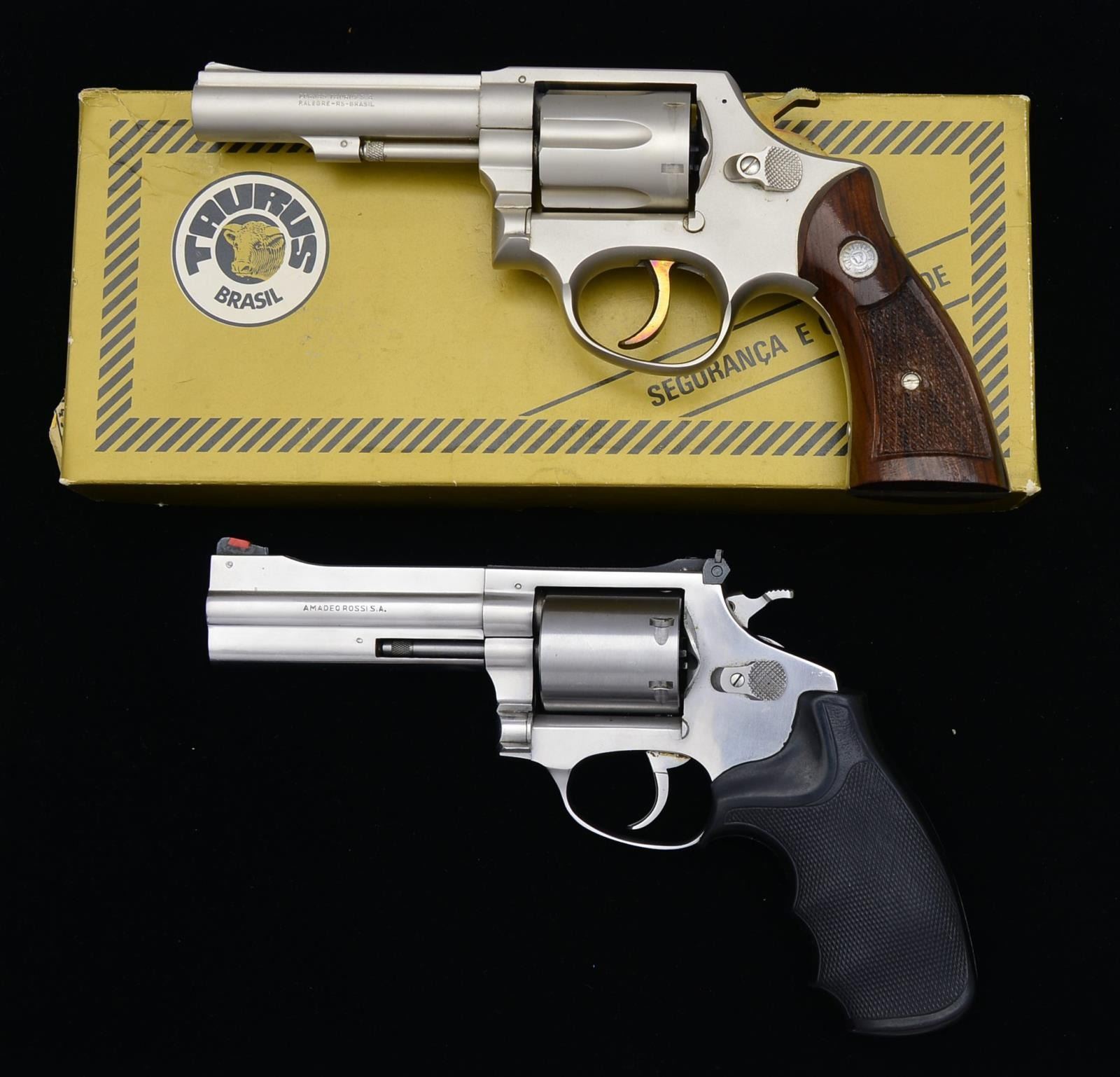 1) TAURUS 941. Cal. 22 Mag. S# BS42990. Bbl. 4”. Blued finish. Adj. rear sight. Smooth trigger. Stippled rubber 2 piece grips. CONDITION: overall near excellent w/ a few very minor light handling marks & light cyl. dragline. Very good bore w/ distinct rifling. (20-3746/ZAL). 2) ROSSI MODEL 711. Cal. 357 Mag. S# F027059. Bbl. 4” ribbed w/ full lug. Pinned front sight & bbl. Adj. rear sight. Checkered beavertail hammer, serrated trigger & non fluted cyl. Checkered 2 piece finger groove rubber grips. CONDITION: overall very good w/ some light handling marks & cyl. Dragline. Near excellent bright shiny bore w/ distinct rifling. (20-3747/ZAL). 3) TAURUS MODEL 82. Cal. 38 Spl. S# 1514540. Bbl. 4” ribbed w/ serrated ramp front sight, notched frame rear sight, straw finished serrated trigger & hammer. Satin nickel finish. 2 Piece checkered walnut grips. UNATTACHED ACCESSORIES: factory box. CONDITION: overall near excellent w/ light cyl. Dragline & a few light handling marks. Very good bright bore w/ distinct sharp rifling. (20-3749/ZAL). ALL MODERN. $800-1,200.