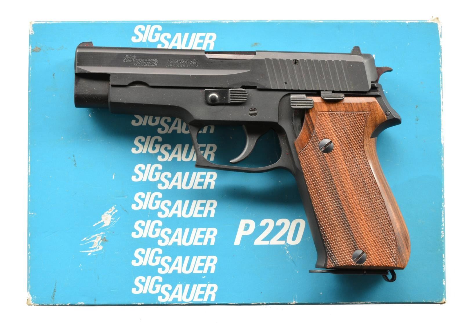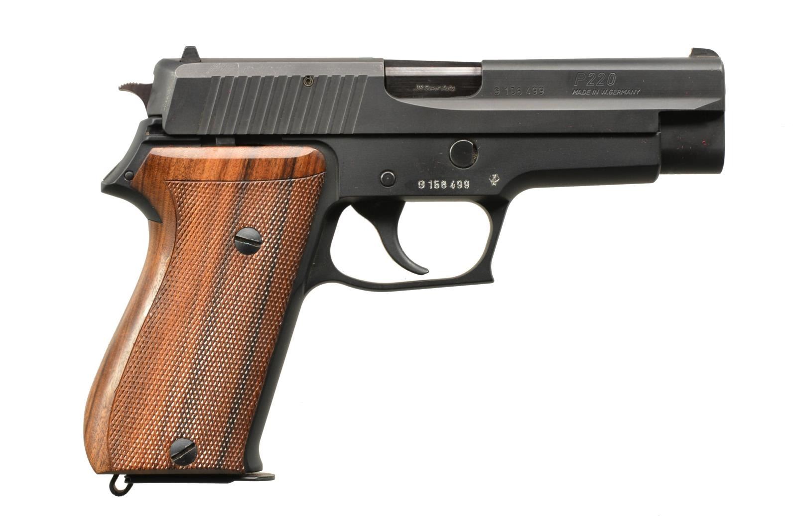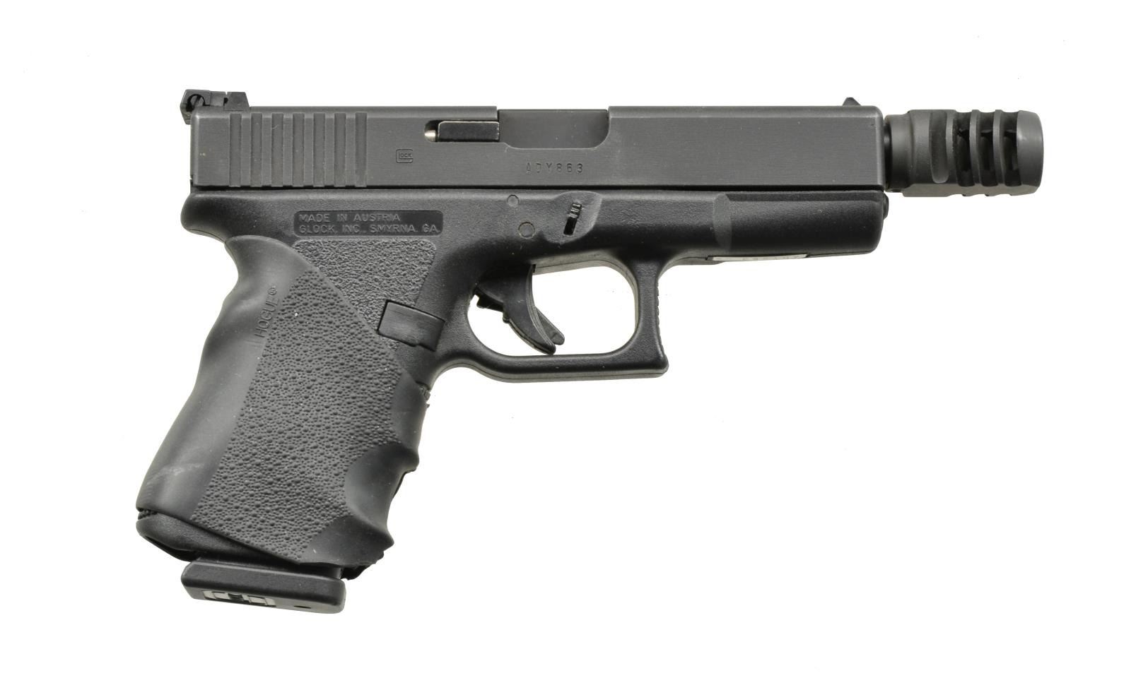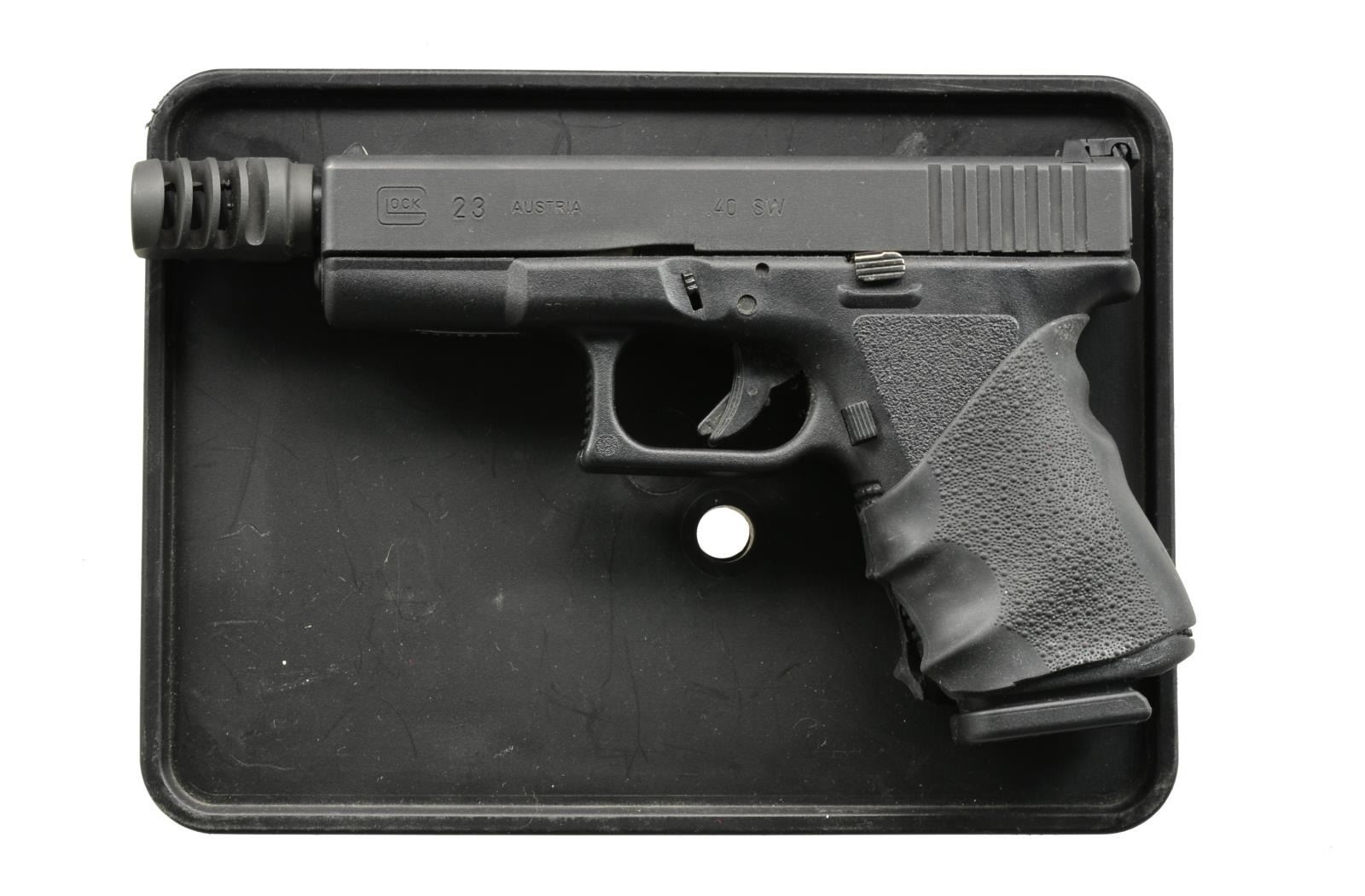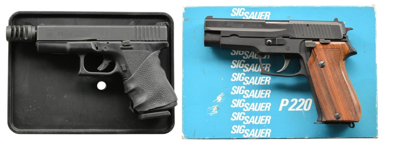 1) Cal. 40 S&W. S# ADY863US. Bbl. 4 1/2". The Glock model 23 is a 40 S&W compact variant of the popular 9mm used world wide. Polymer frame w/ matte black slide. Front sight white dot polymer blade, rear sight adj. "U". Aftermarket threaded bbl. w/ lone wolf muzzle break. Hogue wraparound grip cover. Serrated slide rear. Checkered trigger guard. MAGS: 1-22 rd., 3-13 rd., 1-10 rd., (all Glock manufacture). UNATTACHED ACCESSORIES: factory storage case. 2 Mag. loaders. CONDITION: finish coverage is complete w/ only a few light rub marks. Bbl. finish lightly thinning in areas of mechanical interface. Hogue grip split at the bottom, which may be a style & or fitting choice. Shiny bbl. w/ strong rifling. Fire control mechanism appears to function correctly when cycled by hand. (20-977/JZ). 2) Cal. 38 SUPER AUTO. S# G156499. Bbl. 4 1/2". Matte black finish w/ 2 piece wood wraparound grips. Traditional dbl. action semi-auto w/ decocker. Fixed blade front sight w/ white dot, rear notch sight w/ single white dot. European style bottom mag. release. UNATTACHED ACCESSORIES: original box containing owner's manual & test target. MAGS: 2 factory 9-rd. steel. CONDITION: finish is complete & devoid of any major scratches. Bbl. is bright w/ well pronounced rifling. Checkered wooden grips have no obvious flaws. Fire control mechanism appears to function normally when cycled by hand. (20-1141/JZ). BOTH MODERN. $700-1,100.