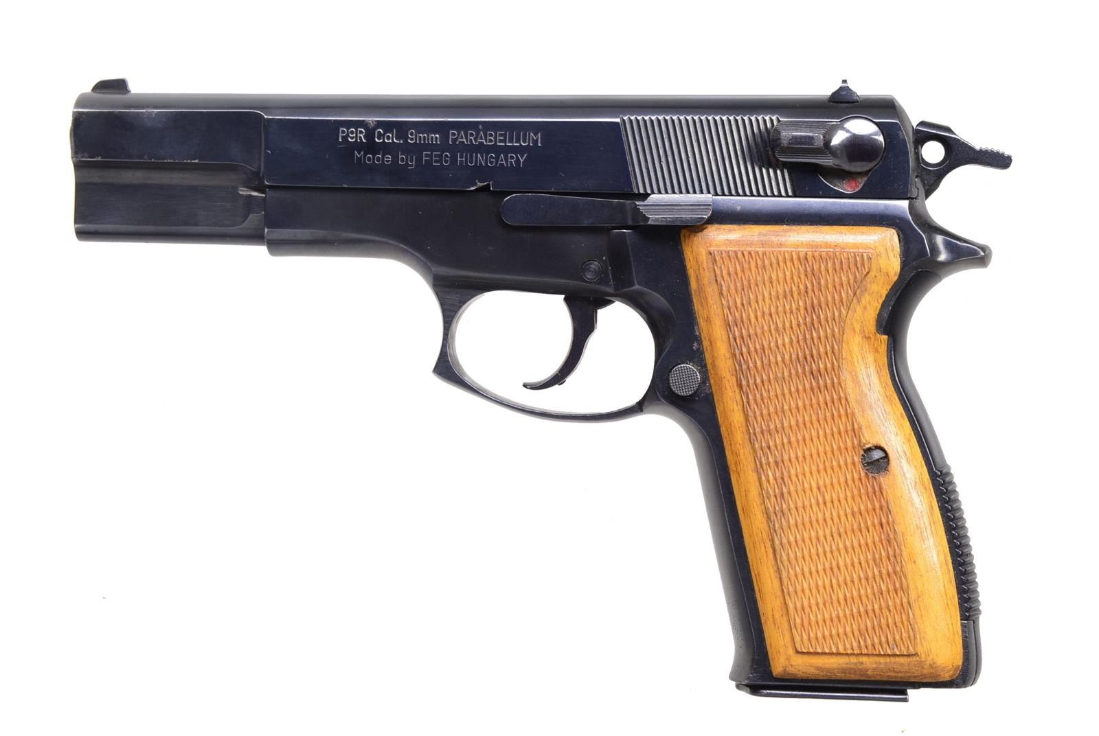 Cal. 9mm Para. (9mm Luger). S# R53959. Bbl. 4 3/4". Mfg. in Hungary as based on Browning Hi Power w/ slight modifications; thumb safety on slide, hooked trigger guard, spur hammer & DA functioning. Fixed sights. Border checkered hardwood grips. CAI import marked. MAGS: 1 very good 13 rd. CONDITION: occasional spot of cleaned oxidation appearing mostly on slide. Balance w/ overall very good appearance mixed w/ slight high point thinning also on slide. Near excellent bore & grips. (20-1980/NW). MODERN. $250-400.