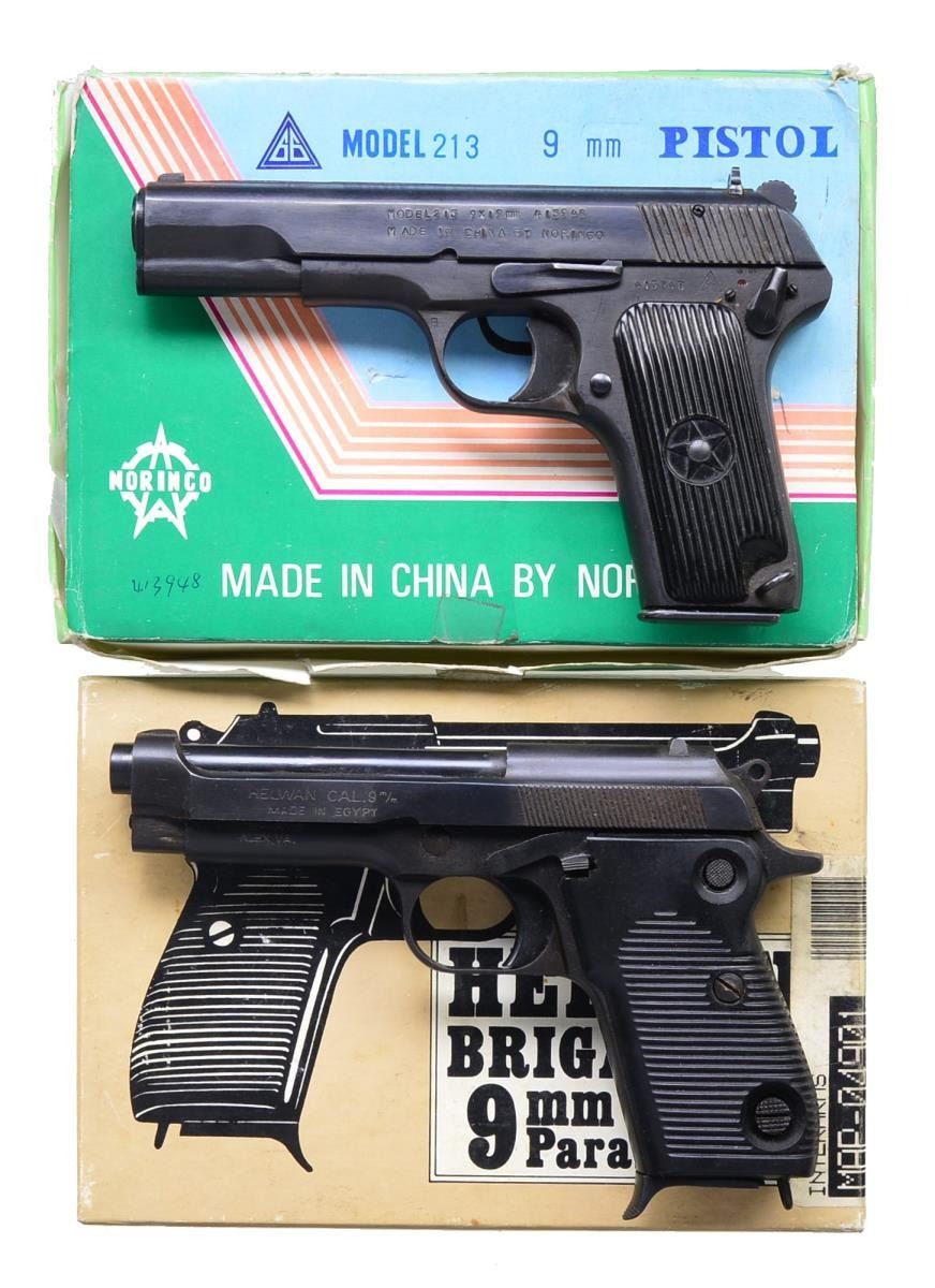 ALL: cal. 9x19 (9mm Para). 1) HELWAN BRIGADIER. S# 10692629. Bbl. 4 5/8". Blade front sight w/ fixed square notch rear sight. Blue finish. 1 Piece synthetic grips. Imported by Interarms, mfg. in Egypt. MAGS: 1 detachable 8 rd. UNATTACHED ACCESSORIES: original 2 piece box containing instruction manual & cleaning rod. CONDITION: as new in box. Bright near excellent bore. (20-2672/DS). 2) NORINCO 213. S# 413948. Bbl. 4 1/2". Blade front sight w/ fixed U notch rear sight. Blue finish. 2 Piece synthetic grips. Mfg. in China & imported by Sport Arms, Miami, FL. MAGS: 1 detachable 8 rd. UNATTACHED ACCESSORIES: foam lined box containing cleaning rod. CONDITION: over 95% blue showing scattered spots of surface corrosion & rust. Bright bore w/ sharp rifling. (20-2834/DS). ALL MODERN. $400-600.