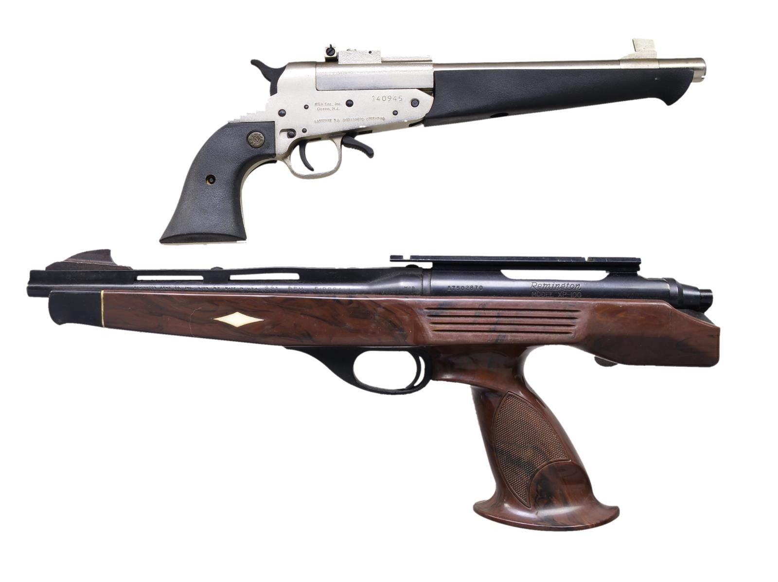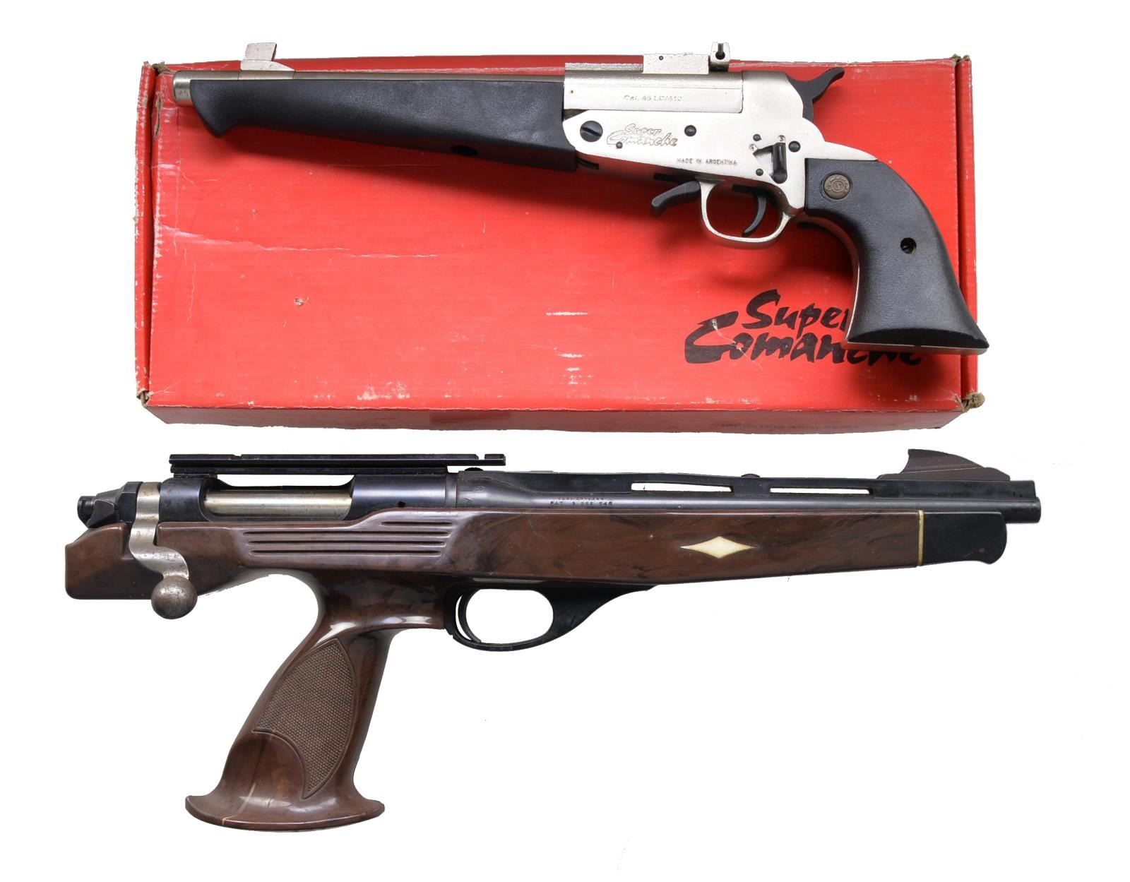 1) REMINGTON MODEL XP-100. Cal. 221 Rem. Fireball. S# A7502870. Bbl. 10 1/2" w/ nylon rib & blade front sight. Mfg. Aug. 1977. Rear sight is removed. Action is fitted w/1 piece Weaver scope base. Blue finish. 1 Piece stock of Zytel nylon w/ diamond pattern inlays in forearm. CONDITION: over 90% metal finish. Dog leg bolt handle & bolt body show scattered surface corrosion. Stock shows handling marks & light wear. Bright bore retains strong rifling. (20-2685/DS). 2) COMANCHE SUPER COMANCHE. Cal. 45 LC/410 Ga. S# 140945. Bbl. 10" including choke; square blade front sight & adj. rear. Satin nickel w/ blued controls plus synthetic forend & grips. Mfg. 2008 in Argentina w/ RSA import mark. UNATTACHED ACCESSORIES: factory box & packaging including extra choke & test shot shell. CONDITION: all aspects near excellent including bore. (20-2695/NW). BOTH MODERN. $650-900.