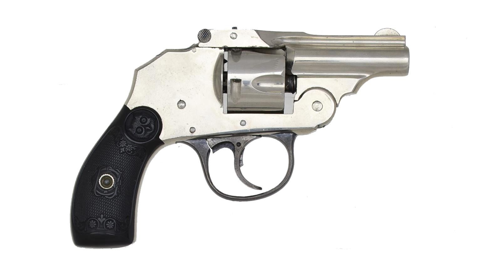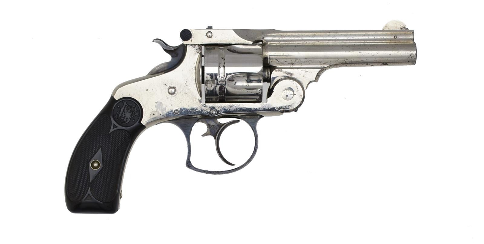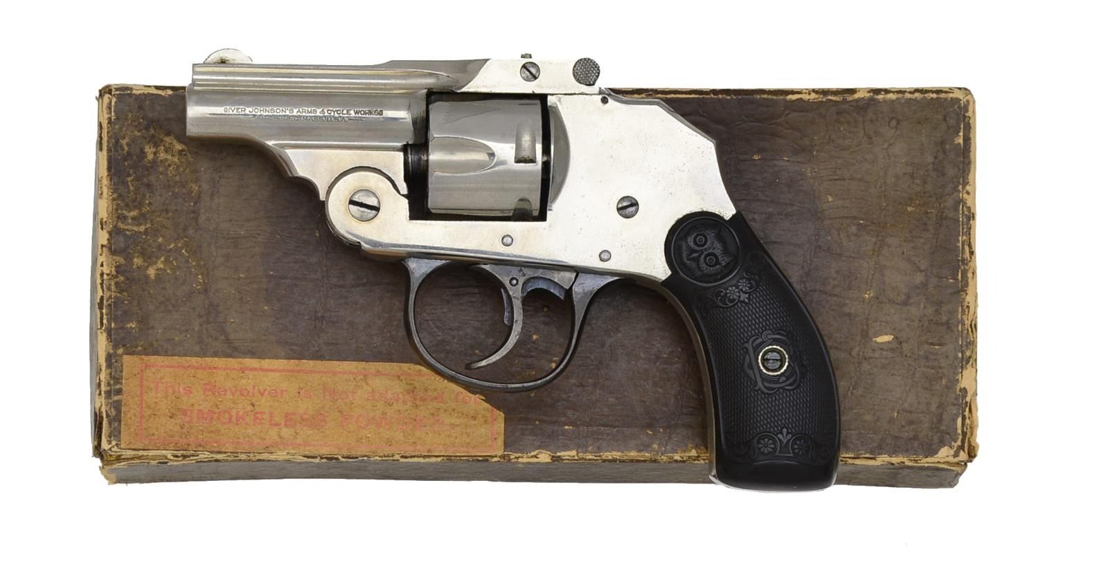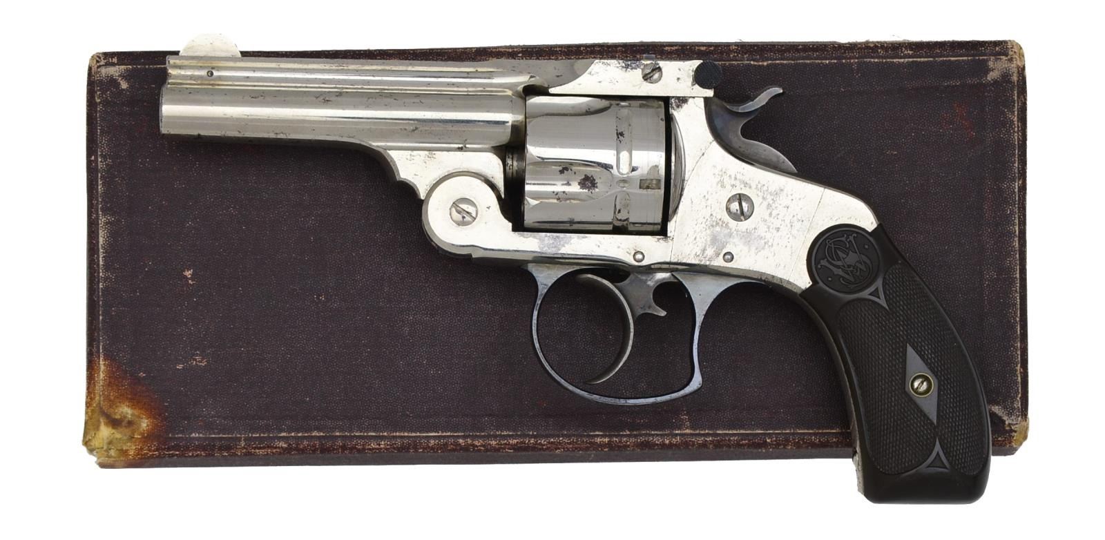 1) IVER JOHNSON 32 SAFETY AUTOMATIC HAMMERLESS. Cal. 32 S&W. S# 45763. Bbl. 2" w/ rib & semi circular sight. 5 Shot fluted cyl. Top break DAO hammerless action w/ nickel finish. Blued trigger guard w/ case colored hammer. 2 Piece checkered hard rubber owl's head grips. UNATTACHED ACCESSORIES: 1 piece box. Box is tattered w/ torn corners. CONDITION: 95% nickel showing sm. handling marks. Trigger guard & trigger retains 70% lightly faded finish. Grips show light wear. Bright bore retains strong rifling showing sm. spots of pitting near muzzle. (20-3653/DS). 2) SMITH & WESSON 38 DA FIRST MODEL. Cal. 38 S&W. S# 1704. Bbl. 3 1/4" w/ rib & semi circular sight. 5 Shot fluted cyl. Nickel finished top break action w/ blued trigger having case colored hammer & trigger. 2 Piece checkered hard rubber grips. UNATTACHED ACCESSORIES: 1 piece box containing a S&W 20 yard bullseye target & S&W caution pamphlet. CONDITION: 70% nickel finish showing spots of raised & peeling finish & scattered corrosion. Grips show light wear. Bore retains largely intact rifling w/ scattered pitting. (20-3849/DS). ALL CURIO. $600-900.