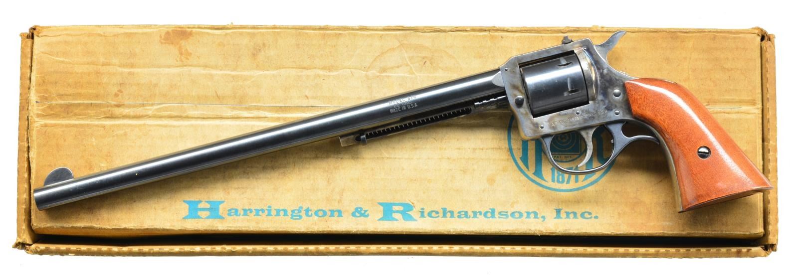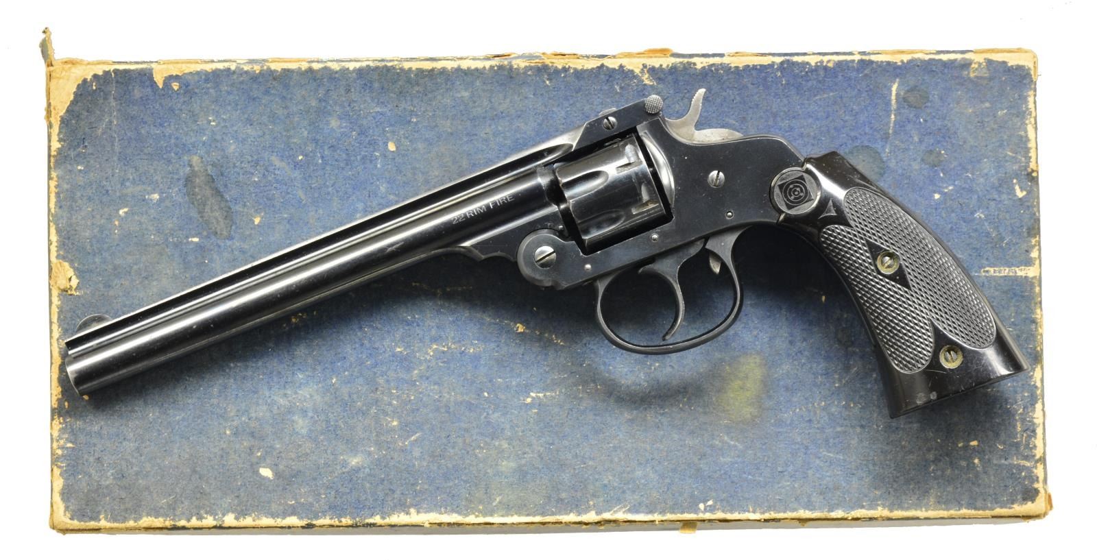 1) MODEL 676 CONVERTIBLE. Cal. 22 LR. S# AP88563. Bbl. 12". Mfg. 1975-1980 in various bbl. lengths. Very desirable 12" bbl. & smooth 1 piece stained hard wood grip. Originally convertible; missing Mag. cyl. Matching numbered non fluted LR cyl. Vivid case colors on ejector housing, frame & trigger. Blued trigger guard, cyl. & bbl. Nickel plated hammer. UNATTACHED ACCESSORIES: fair, oil stained & tattered original box w/ instruction manual & original $84.95 Sporting Goods price tag. CONDITION: all aspects near excellent appearing new. (20-2365/NW). MODERN. 2) MODEL PRIMIER. Cal. 22 RF. S# 470793. Bbl. 6". Mfg. 1905-1941 (blued finish); sixth variation w/ cal. on left side of bbl., no patent dates & Massachusetts spelled out in bbl. address (1916-1924). Border checkered black plastic grips w/ target logo & retained by 2 screws. Matching numbered bbl., extractor & 7 rd. fluted cyl. Automatic cyl. stop, blued trigger plus case colored hammer & bbl. latch. UNATTACHED ACCESSORIES: dark blue vintage 2 piece box marked Model 922. Frayed on edges & opposite corners of top broken; bottom intact. CONDITION: very good overall appearance w/ occasional faint spot of pinprick oxidation. Occasional sm. scratch & slight thinning at muzzle. Good plus grips w/ occasional sm. mark & couple of sm. chips at butt. Very good bore. PROVENANCE: The Estate of Richard Willman. (20-2367/NW). CURIO. $450-600.