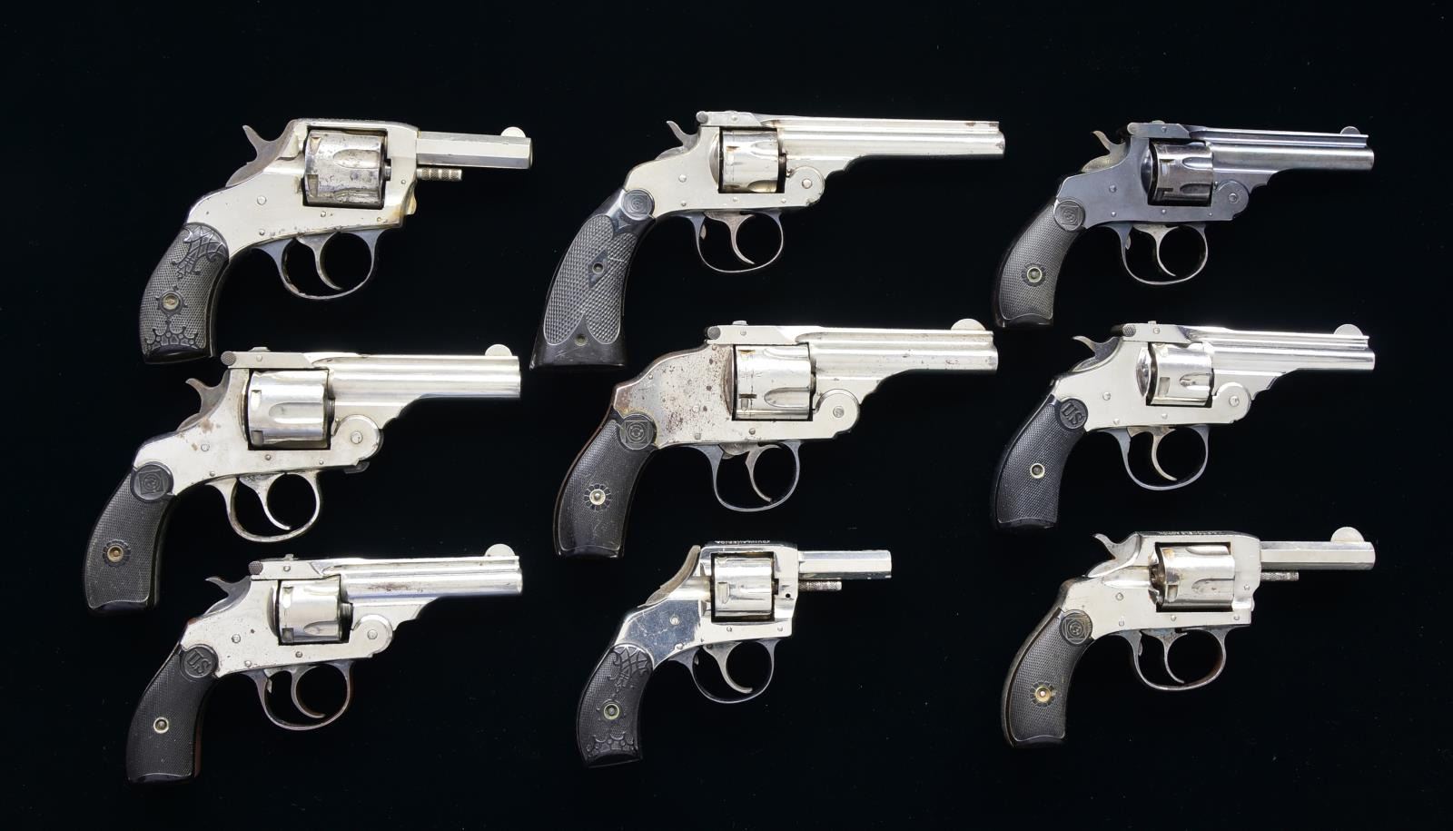 REVOLVERS. 1) HARRINGTON & RICHARDSON YOUNG AMERICA. Cal. 32 S&W. S# 180167. Bbl. 2" oct. 5 Shot fluted cyl. DA only solid frame action w/ blued trigger guard & spurless hammer. 2 Piece checkered hard rubber grips. CONDITION: over 90% metal finish showing light handling marks. Very good grips. Bore retains strong rifling showing sm. spots of pitting. Sound mechanics. Cyl. pin latch & front sight are missing. (20-2001/DS). 2) U.S. REVOLVER COMPANY TOP BREAK. Cal. 32 S&W. S# 47884. Bbl. 3 1/8" w/ rib having semi circular front sight & U notch rear sight. 5 Shot fluted cyl. w/ auto ejection. Nickel finish w/ blued trigger guard having case colored hammer & trigger. 2 Piece checkered hard rubber grips. CONDITION: 80% Nickel. Grips show light wear. Bore retains strong rifling. Good mechanics. (20-2002/DS). 3) U.S. REVOLVER COMPANY TOP BREAK. Cal. 32 S&W. S# 28149. Bbl. 3 1/8" w/ rib having semi circular front sight & U notch rear sight. 5 Shot fluted cyl. w/ auto ejection. Nickel finish w/ blued trigger guard having case colored hammer & trigger. 2 Piece checkered hard rubber grips. CONDITION: 98% metal finish. Very good grips. Bright bore w/ strong rifling. Sound mechanics. (20-2004/DS). 4) HARRINGTON & RICHARDSON PREMIER AUTO EJECTING TOP BREAK. Cal. 22 RF. S# 150843. Bbl. 3 1/8" w/ rib having semi circular front sight & U notch rear sight. 7 Shot fluted cyl. Blue finish w/ case colored hammer & trigger. 2 Piece checkered hard rubber grips. CONDITION: 80% lightly faded blue showing spots of corrosion on cyl. Grips show moderate wear. Bore shows spots of pitting. Good mechanics. (20-2009/DS) 5) HARRINGTON & RICHARDSON PREMIER AUTO EJECTING TOP BREAK. Cal. 32 S&W. S# 546. Bbl. 4" w/ rib. 5 Shot fluted cyl. Nickel finish w/ case colored hammer & trigger. 2 Piece checkered hard rubber extension grips. CONDITION: 75% nickel showing spots of corrosion. Grips have chips & cracks along backstrap. Dark pitted bore. Good mechanics. (20-2011/DS) 6) HARRINGTON & RICHARDSON 1905 SOLID FRAME. Cal. 32 S&W. S# 58451. Bbl. 2 1/2" oct. w/ semi circular sight. 5 Shot fluted cyl. Nickel finish. 2 Piece checkered hard rubber grips. CONDITION: 60% nickel showing spots of corrosion. Grips show moderate wear. Pitted bore. Action functions in DA mode only. (20-2031/DS) 7) HARRINGTON & RICHARDSON THE AMERICAN. Cal. 32 S&W. S# 5868. Bbl. 2 1/2" oct. Semi circular front sight. 6 Shot fluted cyl. Solid frame action w/ nickel finish, blued trigger guard having case colored hammer & trigger. 2 Piece checkered hard rubber grips. CONDITION: 70% nickel showing spots of pitting, scratches & sm. dents. Grips show light wear. Bore retains sound rifling showing sm. spots of corrosion. Firing return spring has collapsed & hammer does not hold in cocked position. (20-2033/DS). 8) HARRINGTON & RICHARDSON LARGE FRAME HAMMERLESS TOP BREAK. Cal. 38 S&W. S# 273. Bbl. 3 3/8" w/ rib, semi circular front sight & U notch rear sight. 5 Shot fluted cyl. Nickel finished concealed hammer action. 2 Piece checkered hard rubber grips. CONDITION: 70% nickel showing spots of corrosion. Grips show wear & partially flattened checkering. Dark bore. Action functions fine, bbl. is loose on frame. (20-2077/DS). 9) HARRINGTON & RICHARDSON AUTO EJECTING TOP BREAK. Cal. 32 S&W. S# 538. Bbl. 3 3/8" w/ rib, semi circular front sight & V notch rear sight. 6 Shot fluted cyl. Nickel finish w/ case colored hammer. 2 Piece checkered hard rubber grips. CONDITION: 80% nickel showing spots of corrosion. Grips show light wear. Bore shows some very light pitting. Action functions in DA mode only. (20-2081/DS). ALL CURIO. $750-1,250.