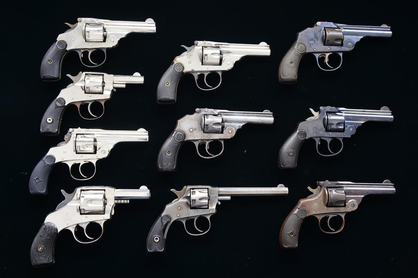 1) HOPKINS & ALLEN 32 TOP BREAK. Cal. 32 S&W. S# 1202. Bbl. 3" w/ rib & semicircular sight. 5 Shot fluted cyl. Nickel finished top break action w/ case hardened hammer having folding spur. 2 Piece checkered hard rubber grips. CONDITION: 98% renickeled finish. Grips show moderate wear. Good mechanics. Bore retains strong rifling showing sm. spots of pitting. (20-3752/DS). 2) HARRINGTON & RICHARDSON THE AMERICAN. Cal. 32 S&W. S# 3904 (under grips). Bbl. 2 1/2" oct. w/ blade sight. 6 Shot fluted cyl. Solid frame action w/ nickel finish having case colored hammer. 2 Piece checkered hard rubber grips. CONDITION: 90% nickel showing spots of corrosion. Grips show light wear. Good mechanics. Bore retains sound rifling showing spots of very light pitting. (20-3753/DS). 3) HOPKINS & ALLEN XL. Cal. 22 RF. S# 8887. Bbl. 4 1/2" oct. w/ semicircular sight. 7 Shot fluted cyl. Left side of action has hand engraved cowboy on a bucking bronc. 2 Piece checkered hard rubber grips. CONDITION: metal has gray appearance from wire wheel cleaning showing pitting. Grips are cracked & missing pieces. Good mechanics. Bore shows scattered pitting. (20-3755/DS). 4) US REVOLVER CO TOP BREAK. Cal. 32 S&W. S# 69712. Bbl. 3" w/ rib & semicircular sight. 5 Shot fluted cyl. Nickel finished top break action w/ blued trigger guard having case colored hammer & trigger. 2 Piece checkered hard rubber grips. CONDITION: over 95% metal finish showing light scratches. Grips show light wear. Good mechanics. Bright bore w/ strong rifling. (20-3756/DS). 5) IVER JOHNSON HAMMERLESS TOP BREAK. Cal. 32 S&W. S# 7741. Bbl. 3" w/ rib & semicircular sight. Blue finished top break action. 5 Shot fluted cyl. 2 Piece checkered hard rubber owl's head grips. CONDITION: a sm. amount of blue is retained in protected areas w/ balance fading to gray showing spots of pitting. Grips show moderate wear. Good mechanics. Bore shows spots of very light pitting. (20-3810/DS). 6) HOPKINS & ALLEN XL DA. Cal. 22 RF. S# 269. Bbl. 2 1/4" oct. w/ blade sight. 7 Shot fluted cyl. Nickel finished solid frame action w/ blued trigger guard having case colored hammer & trigger. 2 Piece checkered hard rubber grips. CONDITION: 95% nickel. Trigger guard has acquired a plum cast. Hammer & trigger have faded case colors. Very good grips. Good mechanics. Pitted bore. (20-3837/DS). 7) HARRINGTON & RICHARDSON TOP BREAK. Cal. 32 S&W. S# 459769. Bbl. 3" w/ rib & semicircular sight. Blue finished top break action. 2 Piece checkered hard rubber grips. CONDITION: over 90% blue showing spots of corrosion. Grips show moderate wear. Bright bore w/ strong rifling & good mechanics. (20-3935/DS). 8) HOPKINS & ALLEN 32 DA TOP BREAK. Cal. 32 S&W. S# 34537. Bbl. 3" w/ rib & semicircular sight. 5 Shot fluted cyl. Blue finished top break action. 2 Piece checkered hard rubber grips. CONDITION: bbl. retains 70% lightly faded blue showing spots of corrosion. Action & cyl. finish have faded to a mottled brown patina. Grips show light wear. Good mechanics. Bore shows scattered light pitting. (20-3940/DS). 9) US REVOLVER CO TOP BREAK. Cal. 32 S&W. S# 66666. Bbl. 3" w/ rib & semicircular sight. 5 Shot fluted cyl. Nickel finished top break action w/ blued trigger guard having case colored hammer & trigger. 2 Piece checkered hard rubber grips. CONDITION: 60% nickel showing areas of flaking & spots of blistered finish. Grips show moderate wear. Good mechanics. Pitted bore. (20-3941/DS). 10) IVER JOHNSON HAMMERLESS TOP BREAK. Cal. 32 S&W. S# 24027. Bbl. 3" w/ rib & semicircular sight. Blue finished DAO action. 2 Piece checkered hard rubber grips. CONDITION: 60% blue showing spots of flaking, sm. dents & surface corrosion. Grips show light wear. Good mechanics. Bore retains strong rifling. (20-3943/DS). ALL CURIO. $750-1,250.