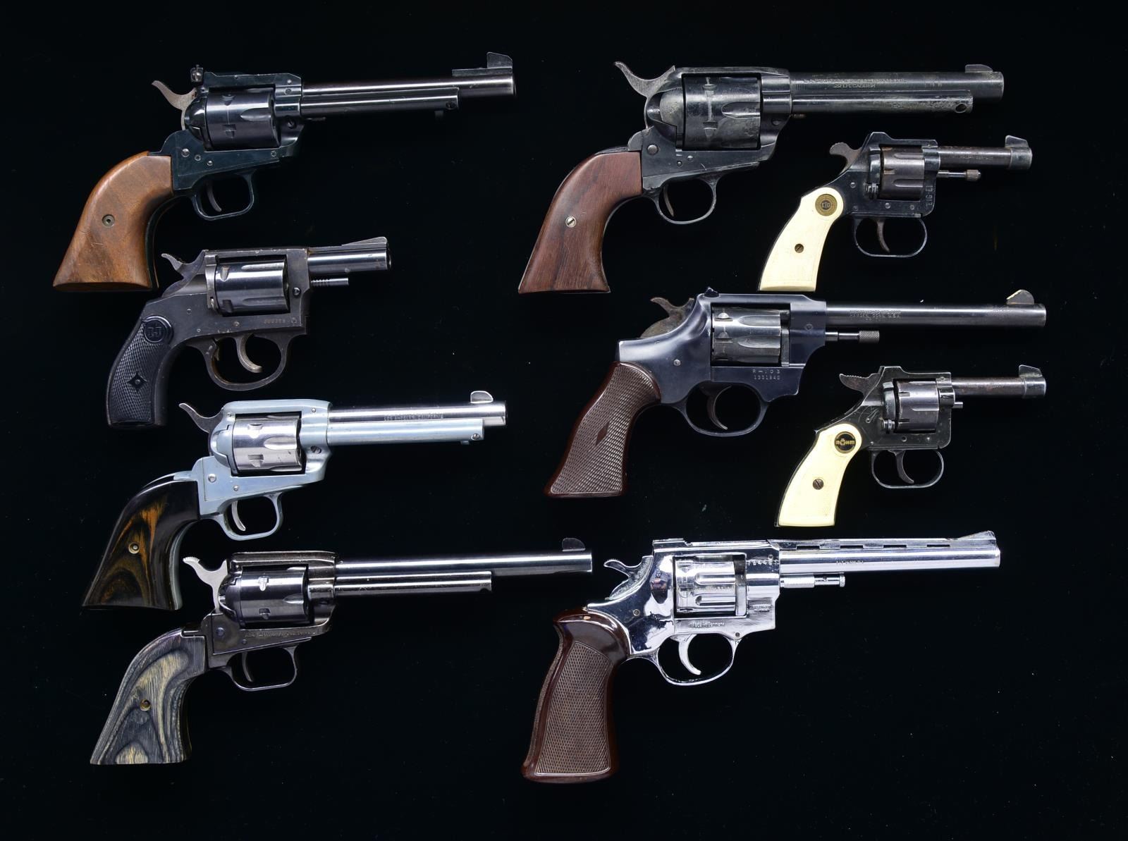 1) IVER JOHNSON DA. Cal. 38 Spl. S# J06029. Bbl. 2 1/4" w/ rib mounted ramp front sight. 5 Shot fluted cyl. Blue finished solid frame action w/ case colored hammer & trigger. 2 Piece checkered plastic grips. CONDITION: 70% metal finish. Grips show light wear w/ chips at bottom. Good mechanics. Bore retains intact rifling. (20-3791/DS). 2) EIG E1 DA. Cal. 22 Short. S# 117200. Bbl. 2 1/2" rnd. w/ blade sight. 6 Shot fluted cyl. Black finish. 2 Piece ivory colored checkered plastic grips. CONDITION: 70% metal finish showing surface rust & marks. Grips show light wear. Functioning action. Bore shows spots of pitting. (20-3797/DS). 3) ROHM MODEL RG10 DA. Cal. 22 S. S# 848914. Bbl. 2 1/2" rnd. w/ blade sight. 6 Shot fluted cyl. Blued action. 2 Piece ivory colored checkered plastic grips. CONDITION: 70% metal finish showing surface corrosion & scratches. Grips show light wear. Functioning action. Bore retains sound rifling. (20-3801/DS). 4) HERITAGE ROUGH RIDER. Cal. 22 LR. S# E34166. Bbl. 6 1/2" w/ blade front sight. 6 Shot fluted cyl. Alloy action w/ manual safety left of hammer. 2 Piece laminate wood grips. CONDITION: 90% finish. Good mechanics. Bright bore w/ strong rifling. (20-3826/DS). 5) MIW / DSC SAA. Cal. 22 Mag. S# 795720. Bbl. 5 1/2" w/ blade front sight & square notch adj. rear sight. 6 Shot fluted cyl. Alloy frame. 2 Piece hardwood grips. Mfg. in Germany. CONDITION: 70% metal finish. Grips show wear & handling marks. Sound action. Bore shows spots of pitting. (20-3852/DS). 6) JP SAUER & SOHN WESTERN SIX SHOOTER SA. Cal. 22 LR. S# A4697. Bbl. 5 1/2" w/ blade sight. 6 Shot fluted cyl. Alloy action. 2 Piece walnut grips. CONDITION: 50% metal finish. Grips are thinned & show heavy wear. Functioning action. Bore retains sound rifling. (20-3853/DS). 7) HIGH STANDARD R-103 SENTINEL. Cal. 22 LR. S# 1331840. Bbl. 6" w/ ramp front sight having added paint & square notch rear sight. 6 Shot fluted cyl. Alloy action. 1 Piece checkered plastic grip. CONDITION: 80% metal finish showing wear spots & corrosion. Grips show light wear. Sound mechanics. Bore retains good rifling. (20-3854/DS). 8) ARMINUS / FIE HW7 DA. Cal. 22 Mag. S# 784461. Bbl. 6" w/ VR & serrated ramp front sight. 8 Shot fluted swing out cyl. Chrome finish. 1 Piece checkered plastic grips. CONDITION: 90% chrome finish. Grips show light wear. Sound action. Bore retains sound rifling. (20-3856/DS). 9) HAWES MODEL 21. Cal. 22 Mag. S# 477522. Bbl. 4 3/4". 6 Shot fluted cyl. Alloy action. 2 Piece laminate grips. Mfg. in West Germany by H Schmidt Osttim / Rhom. CONDITION: Bbl. & cyl. retain 90% nickel showing spots of corrosion. Frame has faded gray appearance. Grips show light wear. Good mechanics. Bright bore w/ strong rifling. (20-3876/DS). ALL MODERN. $650-1,000.