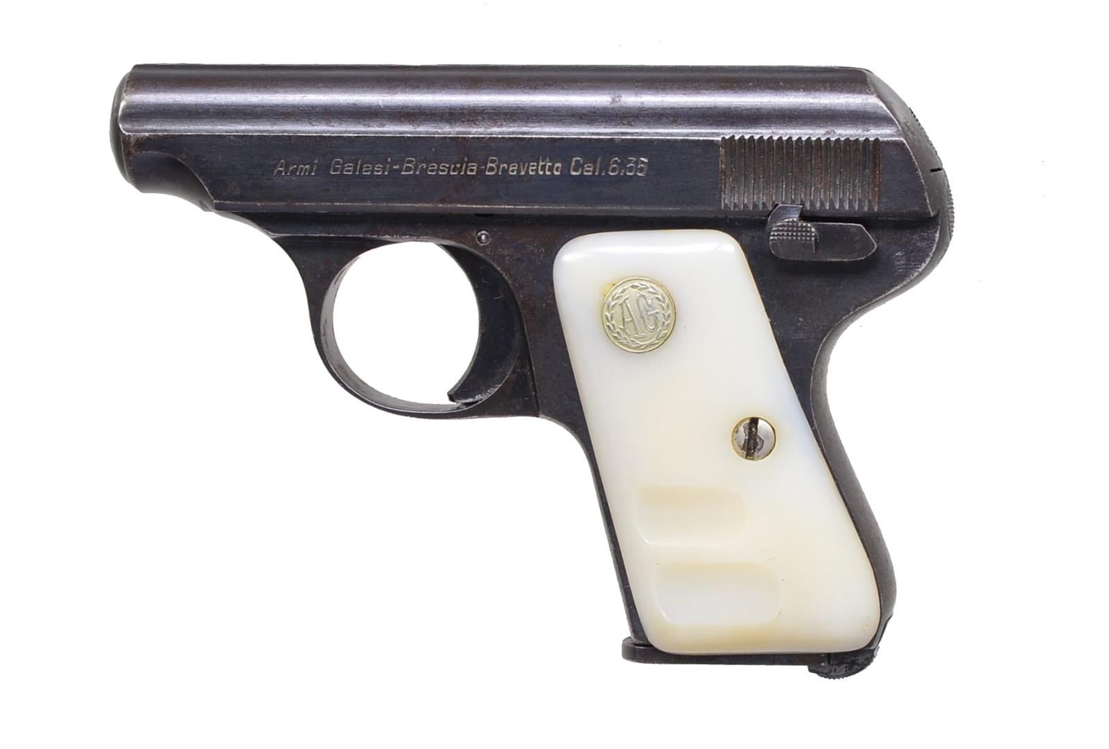 Cal. 6.35mm (25 ACP). S# 177283. Bbl. 2 3/8". Mfg. 1955 in Italy w/ blued finish & signature grooved simulated pearl grips. MAGS: 1 factory 7 rd. w/ light oxidation. CONDITION: good general appearance w/ scattered light to medium oxidation. Very good grips. Fair bore w/ light pitting. (20-1455/NW). CURIO. $150-225.