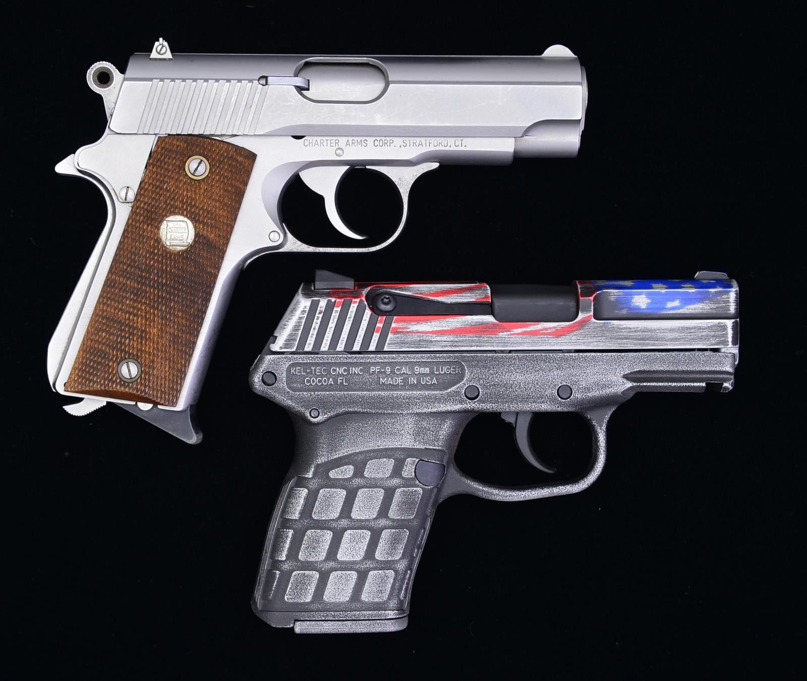 1) CHARTER ARMS MODEL 79K. Cal. 380 ACP. S# C000758. Bbl. 3 1/2”. Compact stainless steel design very similar to that of the time honored Colt 1911. Stainless frame & slide. Fixed blade front sight w/ drift adj. rear sight. Traditional DA mechanism. Left side safety. Serrated slide. Bottom European style mag. release. Checkered wood grips w/ Charter Arms medallions. MAGS: 1-7 rd. CONDITION: slide & frame finish exhibits scattered scratches typically associated w/ holstering. Left grip has notably darker appearance. Shiny bore w/ good rifling. (20-3765/JZ). 2) KEL TEC PF-9. Cal. 9mm Luger. S# RBE57A. Bbl. 3”. Attractive custom Cerakote stone wash finish w/ American flag on slide. DAO fire control mechanism. 3 Dot sights. Left side mag. release. Accessory rail below bbl. In front of trigger guard. Rear slide serrations. MAGS: 1-7 rd. CONDITION: according to notes from a previous service, many parts are newly replaced including frame, trigger assembly, hammer assembly & trigger bar, while the bbl., hammer block & follower were factory updated. Shiny bore w/ good rifling. (20-3906/JZ). BOTH MODERN. $400-700.
