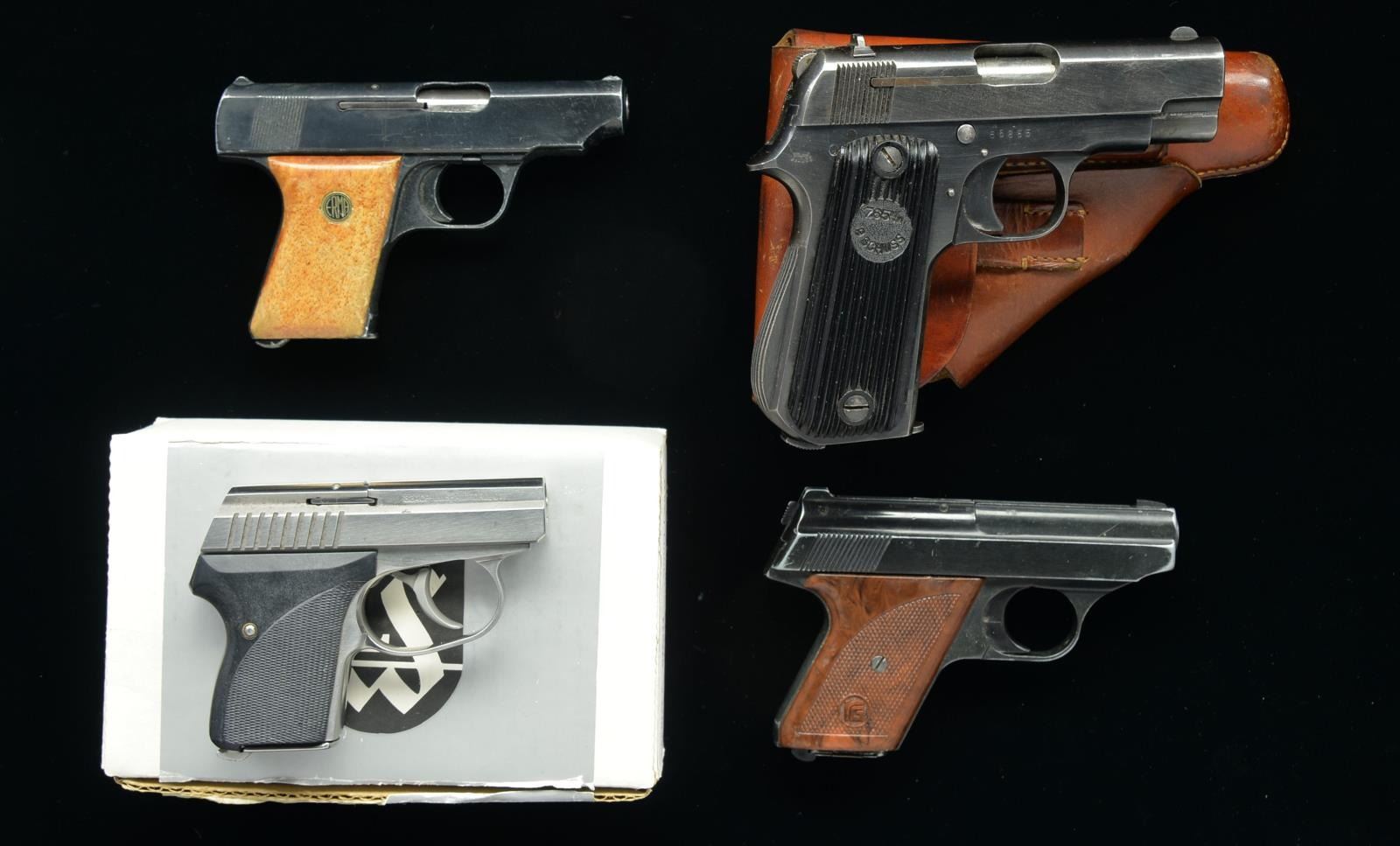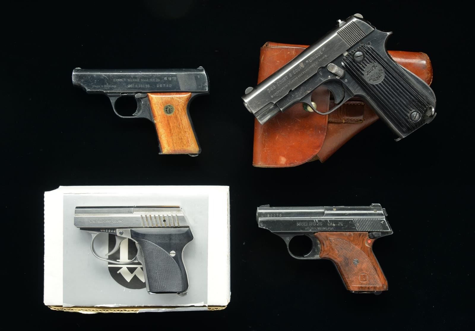 1) ERMA MODEL EP. 25. Cal. 6.35mm (25 ACP). S# 06742. Bbl. 2 1/2". Mfg. 1968 w/ black finish plus smooth hardwood grips & Erma medallions. Matching numbered slide. Frame mounted & mag. safeties. MAGS: 4 near excellent 6 rd. CONDITION: good general appearance w/ light marks throughout including on grips. Very good bore. (20-2359/NW). CURIO. 2) UNIQUE KRIEGSMODELL. Cal. 7.65mm (32 ACP). S# 65855. Bbl. 3/4". Mfg. WWII era as used during German occupation of France. Right rear of frame has eagle "WaA020". Frame & mag. safeties. Slide marked "9COUPS". Vertically grooved synthetic grips have "9 SCHUSS". German designed external hammer. Last of wartime models. MAGS: 2 good 9 rd. UNATTACHED ACCESSORIES: brown double flap holster w/ stud & strap retention plus mag. pouch on front having marks indicating use by shorter magazine pistol. Top of sm. flap marked "D.R.G.M." over crossed rifles over "Akah" Single wide loop on back; very good overall. CONDITION: good plus general appearance w/ slight high point wear & scattered marks. Very good grips & bore. (20-2360/NW). CURIO. 3) SEECAMP MODEL LWS 32. Cal. 32 ACP. S# 045944. Bbl. 2.06". Mfg. in Milford CT. (now relocated in Southwick MA.). Polished stainless w/ checkered black synthetic grips. Considered by most the ultimate in concealed pocket carry firearms. Designed for Winchester Silvertip ammo only. Mag. safety only plus DAO functioning. MAGS: 1 factory marked; polished stainless 6 rd. UNATTACHED ACCESSORIES: original box & packaging. CONDITION: overall near excellent appearance including grips. Bore has machine marks throughout in addition to rifling. (20-2366/NW). MODERN. 4) RG MODEL 26. Cal. 25 ACP. S# U090376. Bbl. 2 5/8". Alloy construction w/ black finish. Mottled brown checkered plastic grips w/ RG logo. MAGS: 1 fair 6 rd. w/ mfg. copper base & prior owner scratch marks on left side of body. Protrudes slightly at butt likely due to missing proper base. CONDITION: generally good appearance w/ light scratches & high point wear. Fair to good bore w/ light cleaned pitting. PROVENANCE: The Estate of Richard Willman. (20-2369/NW). MODERN. $750-1,000.