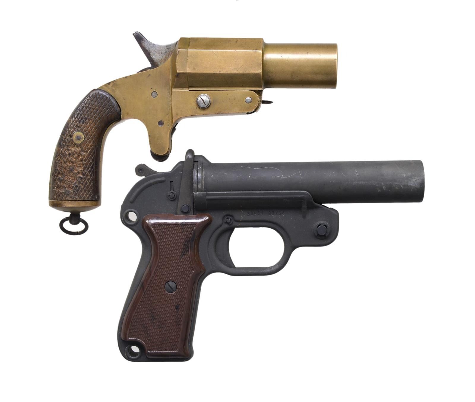BOTH: cal. 26.5mm. 1) FRENCH MODEL 1917. S# 257 (18). Bbl. 4". Exterior unmarked except for slightly curved line under "V". Bbl. & frame w/ unusual S#'s coming together when read from 2 directions. All brass construction except for screws, latch, hammer, trigger & lanyard loop. Checkered walnut grips. CONDITION: numerous light marks on exterior w/ slightly gouged lower section of right grip. Very good bore w/ almost unused appearance. (02-13862/NW). 2) GECO SIGNAL. S# 30351. Bbl. 6". Matte black finish w/ checkered black plastic grips. Stamped sheet metal construction. Mfg. 08/64. CONDITION: very good overall w/ light scratches & rub marks. Near excellent grips. Good bore exhibiting slight use. (02-13863/NW). NON-GUN. $200-300.