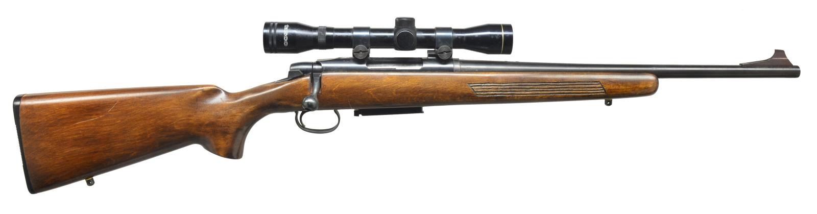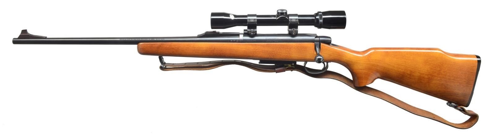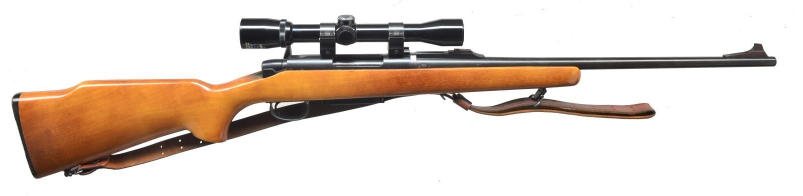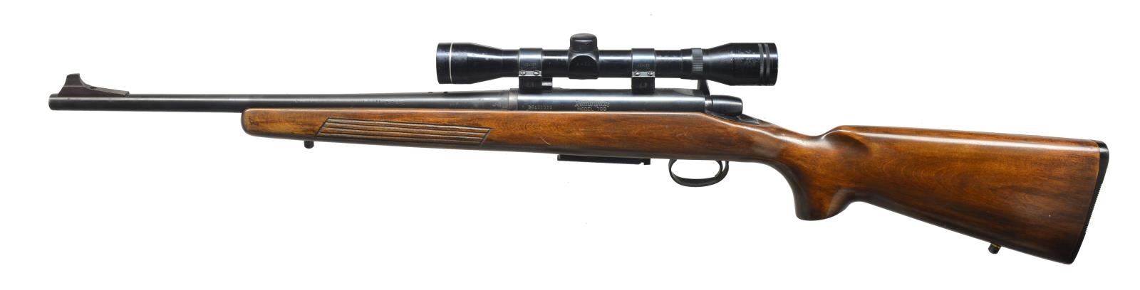 1) 788 CARBINE. Cal. 243 Win. S# B6121375. Bbl. 18". Ramp mounted blade front sight, rear sight is removed. Tasco 4x32 gloss finished scope w/ duplex reticle on Weaver mts. Straight comb hardwood carbine stock w/ original buttplate having added swivel bases. Forearm has rectangles added straight line carving. MAGS: 1 detachable 3 rd. CONDITION: over 95% blue showing muzzle wear. Stock shows scattered scratches & marks. Bright bore w/ strong rifling. Scope has good optics. (20-2620/DS). 2) 788 LEFT HAND. Cal. 6mm Rem. S# A6156346. Bbl. 22" w/ ramp mounted blade front sight & base only for rear sight. Swift Mark I 4x32 gloss finished scope w/ duplex reticle on Weaver mts. Monte Carlo pistol grip stock w/ buttplate. Leather sling on aftermarket QD swivels. MAGS: 1 detachable 3 rd. mag. CONDITION: 98% blue. Stock has very good original finish showing a couple of sm. marks. Bright bore w/ sharp rifling. Scope has clear optics. (20-2871/DS). ALL MODERN. $600-900.