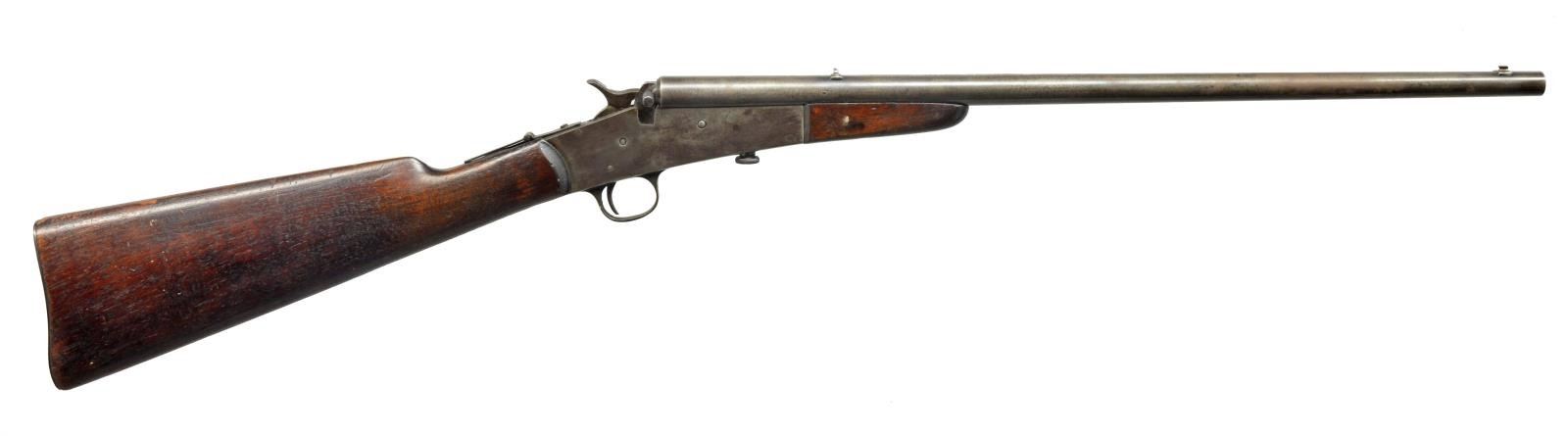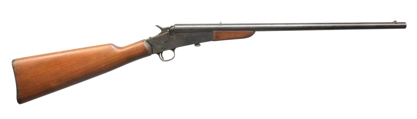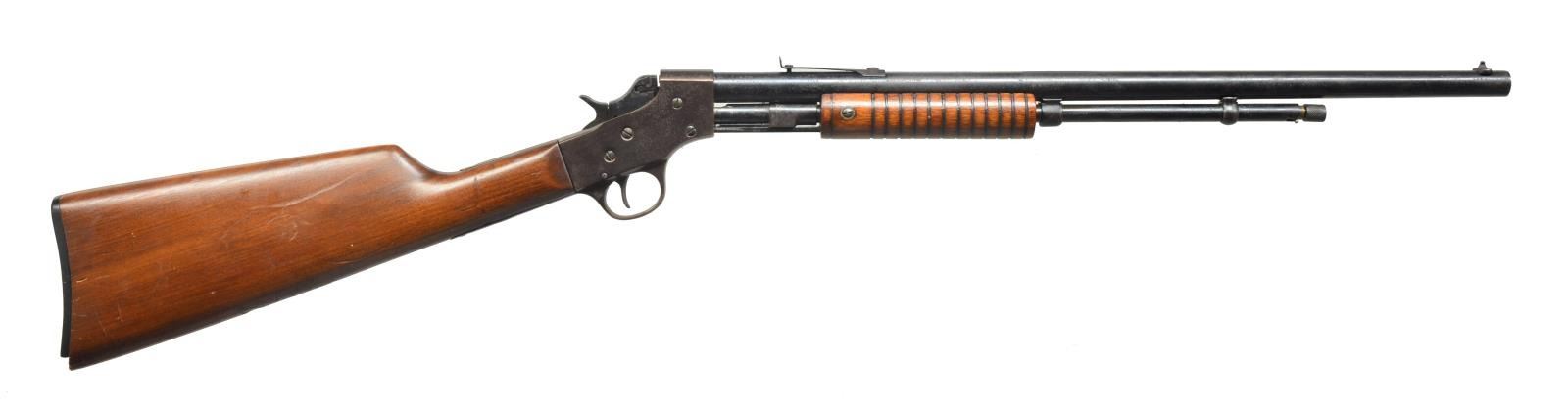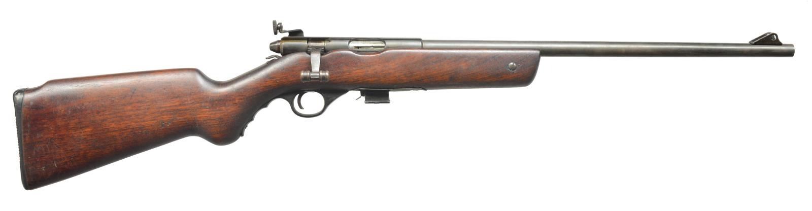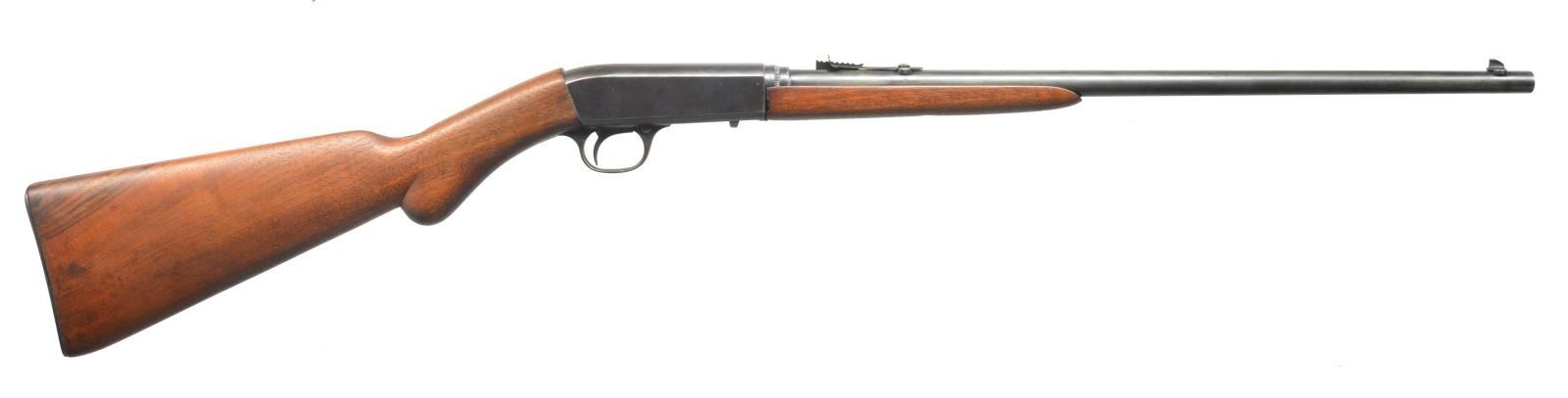1) STEVENS VISIBLE LOADER. Cal. 22 LR. S# N614. Bbl. 20" rnd. bbl. Dovetail bead front sight & screw on adj. rear sight. 13 Ring forend. Uncheckered straight grip stock w/ checkered black hard rubber buttplate. CONDITION: bbl. has restored blue w/ faint film of fine rust. Receiver has been blued to a maroon to bronze color. Receiver also has some fine surface pitting. Forend has original finish w/ hand worn patina. Stock has original finish w/ numerous nicks & dents. Toe of buttplate is missing. Action on gun does not work very well. Bore is dark w/ pits. (20-3460/BT). 2) FN AUTO 22. Cal. 22 LR. S# 117351. Bbl. 19 1/2" rnd. bbl. Dovetail bead front sight & dovetail w/ screw on adj. rear sight. Uncheckered forend. Uncheckered rnd. knob pistol grip. Steel smooth buttplate. CONDITION: bbl. retains original blue w/ lg. spot of surface oxidation on left side. Receiver retains original blue toning w/ brown patina & wear on sharp edges. Forend has a hand worn patina finish. Buttstock has a hand worn patina finish w/ crack behind tang of trigger guard. Bore is good. (20-3462/BT). 3) REMINGTON NO. 6. Cal. 22 S, L, LR. S# S272495. Bbl. 20" rnd. bbl. Dovetail bead front sight & dovetail fixed blade rear sight. Uncheckered forend. Uncheckered straight grip stock w/ steel Remington buttplate. Stock has matching S# stamped behind trigger guard. CONDITION: bbl. has original blue blending w/ silver patina near front sight & thinning over chamber. Receiver has darkening original case colors w/ wear on sharp edges. Forend has hand worn finish w/ a minor grain crack running through screw. Buttstock has cleaned finish darkening around buttplate. Minor grain crack behind top tang. Bore is dark w/ some scattered pits. (20-3463/BT). 4) MOSSBERG 142-A. Cal. 22 S, LR. NSN. Bbl. 18" rnd. bbl. Screw on front sight w/ vertical sides & no rear bbl. sight. Receiver is grooved. Left rear of receiver has adj. peep sight. Uncheckered stock. Rnd. knob pistol grip w/ black serrated hard rubber buttplate. Left side of stock has attached sling swivels. MAGS: 3-7 rd. mags. CONDITION: bbl. retains thinning original blue w/ areas of fine surface oxidation. Receiver has thinning original blue. Stock has original finish w/ numerous handling marks. Bore is dark w/ a few minor pits. (20-3614/BT). 5) REMINGTON NO. 6. Cal. 22 S, L, LR. S# S51104. Bbl. 20" rnd. bbl. Dovetail bead front sight & dovetail fixed blade rear sight. Top tang has flip up peep sight. Uncheckered forend. Uncheckered straight grip stock w/ steel buttplate. Stock has matching S# stamped behind trigger guard tang. Left side of receiver marked “PATENTED JULY 22, 1902”. CONDITION: bbl. has traces of original blue mixing w/ fine surface rust. Receiver has traces of darkening original case colors. Forend has hand worn patina finish. Buttstock has hand worn patina finish w/ nicks & scratches as well as a sm. chip missing left side of trigger guard tang. Sm. grain crack running behind tang. Bore is dark w/ scattered pitting. (20-3615/BT). ALL MODERN. $800-1,200.