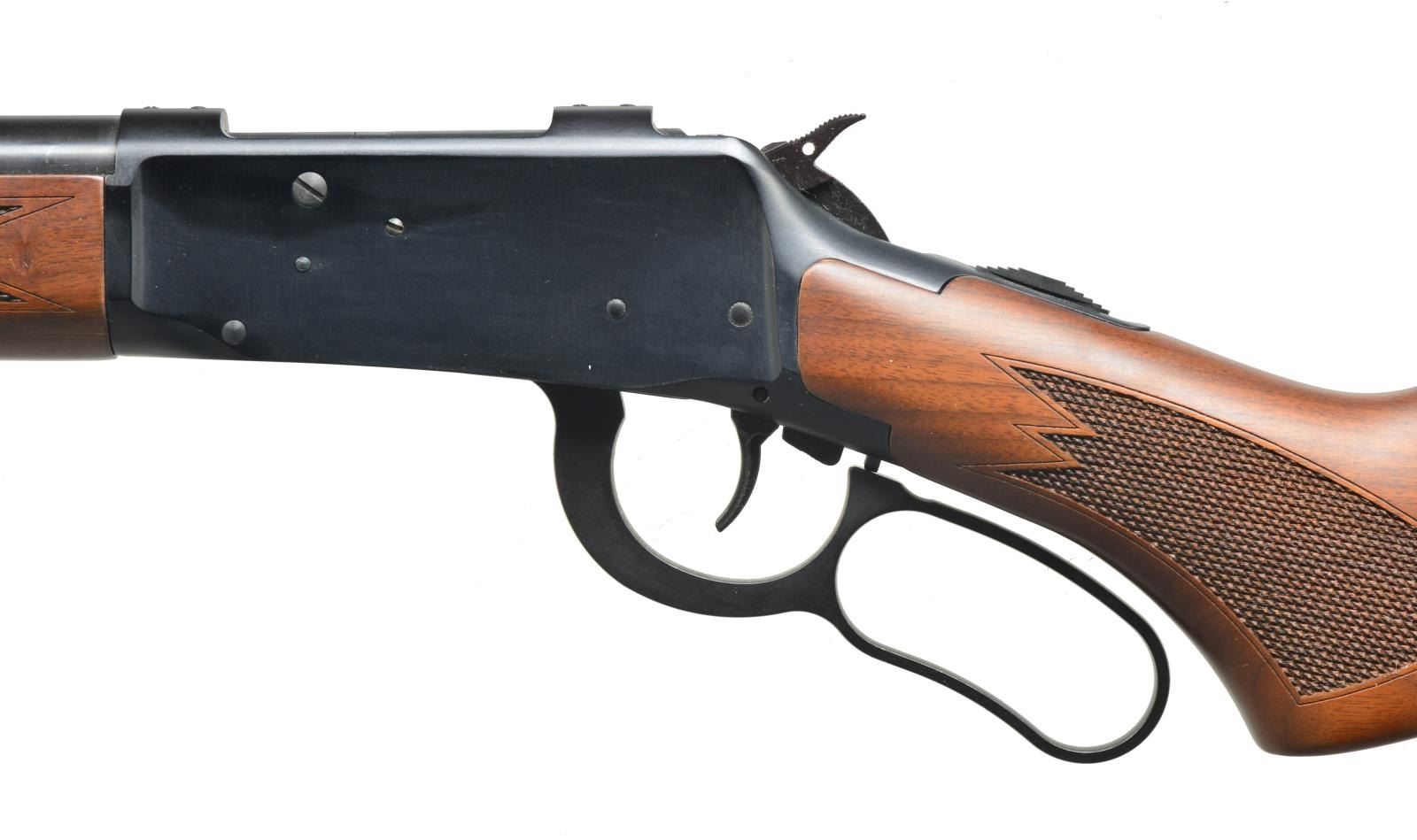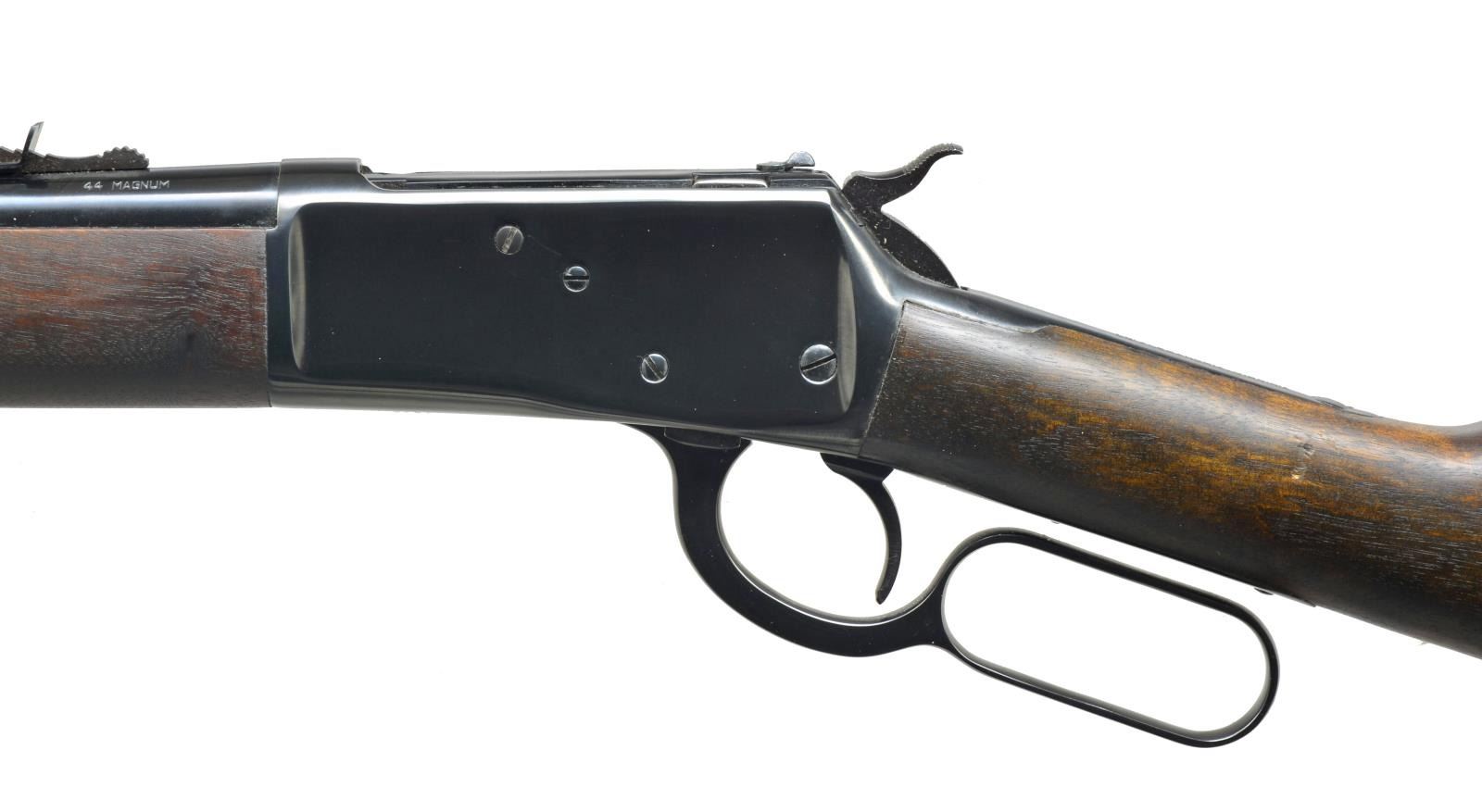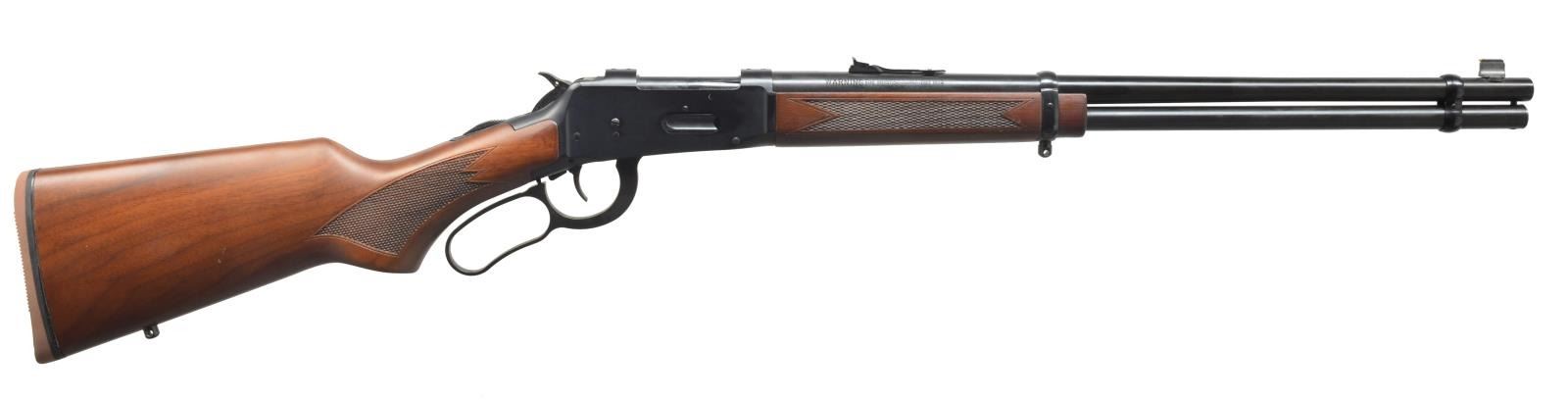 1) ROSSI 92 SRC. Cal. 38 Spl. / 357 Mag. S# K045374. Bbl. 20" w/ pinned fastened blade front sight & elevator adj. sporting rear sight. Full length mag. Matte black finished action w/ saddle ring on left side. Carbine style hardwood forearm & stock w/ steel carbine buttplate. CONDITION: over 90% blue. Wood has lightly worn finish showing scattered light marks. Bright bore w/ strong rifling. (20-3446/DS). 2) MOSSBERG MODEL 464. Cal 30-30. S# LA071191. Bbl. 20" w/ bead front sight & adj. U notch rear sight. Full length mag. Black finished action drilled for scope attachment featuring sliding top tang safety. Checkered walnut forearm & pistol grip stock w/ original rifle pad & swivel bases. CONDITION: over 98% wood & metal finish. Bright bore retains near excellent rifling. (20-3455/DS). 3) ROSSI M92 PUMA. Cal. 44 Mag. S# M130304. Bbl. 20" w/ sporting sights. Full length tubular mag. Blue finished action w/ manual safety on bolt. Hardwood carbine forearm & straight grip stock w/ crescent steel buttplate. CONDITION: 98% metal finish. Stock shows scattered sm. marks. Bright bore w/ strong rifling. (20-3467/DS). ALL MODERN. $700-1,000.