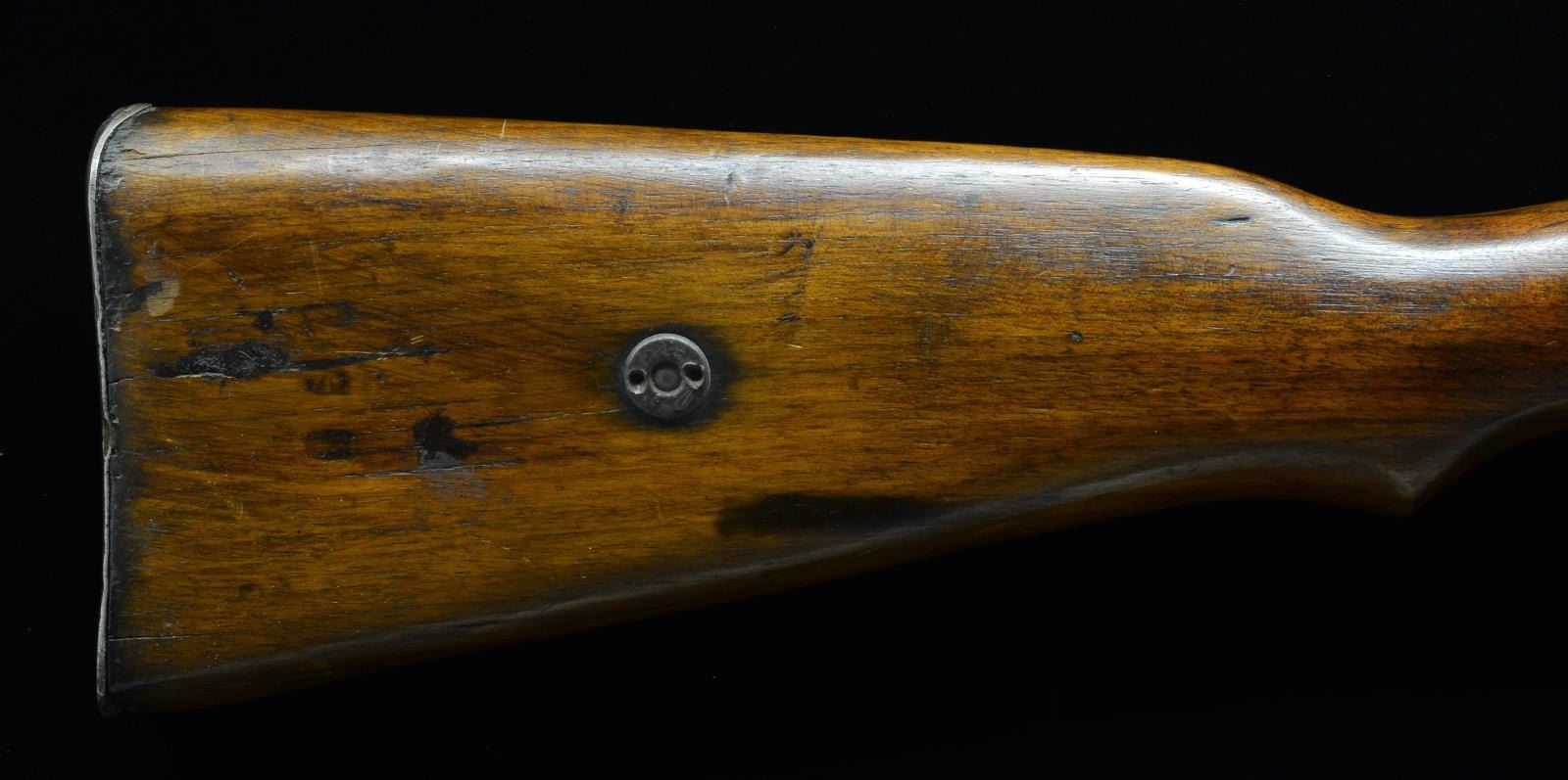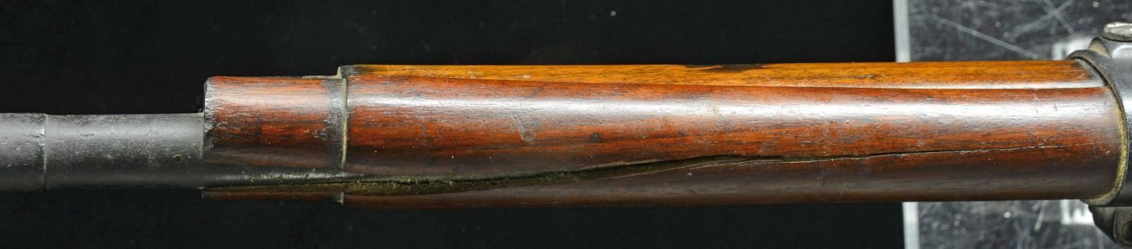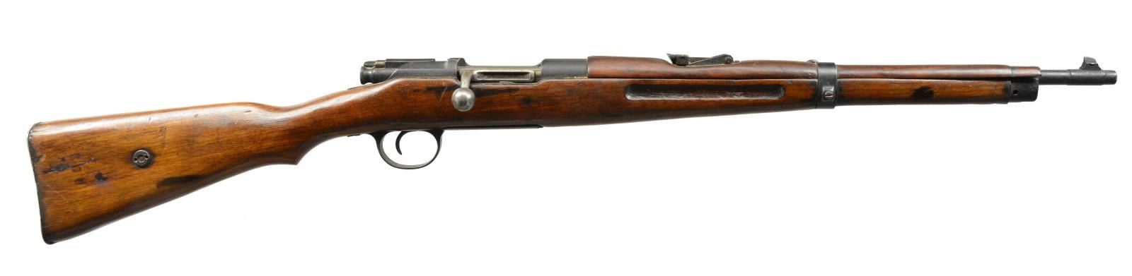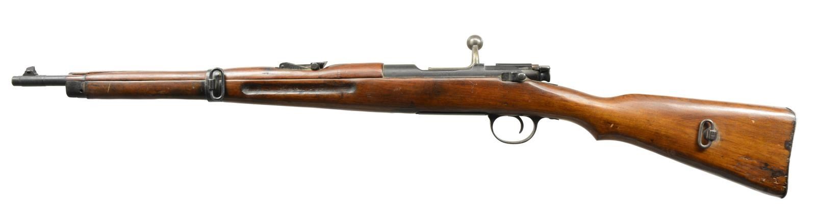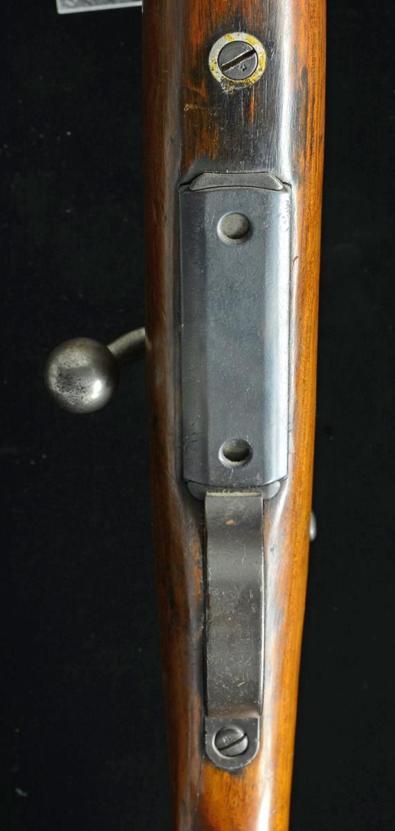 1) STEYR GREEK MANNLICHER SCHOENAUER 1903/14. Cal. 6.5mm Greek. S# 8648B. Bbl. 20.5". Band fastened Barleycorn front sight w/ 200-1800m leaf rear sight. Receiver has Greek crest over "Y:1903" on front ring. Left side of receiver marked "STEYR 1912". Standard turned bolt action w/ detachable rotary mag. Band fastened full length stock w/ finger grooved forearm & steel buttplate having walnut handguard. CONDITION: metal has faded to dark patina w/ spots of pitting. Sanded & refinished stock shows wear & handling marks. Handguard has long crack extending from tip. Front stock band & cleaning rod are not present. Dark bore w/ lightly worn rifling. (20-2305/DS). CURIO. 2) CZ M98 SPORTING. Cal. 30-06. S# 31387 (under wood line). Bbl. 24 1/2" custom sporter bbl. w/ out sights having hand stamped cal. marking. 2.5x20 Bushnell Banner gloss finished scope w/ standard crosshairs on Weaver mts. M98 action w/ right side sliding safety & hinged floorplate w/ lever in front of trigger guard bow. Left side of action marked "CZ MADE IN YUGOSLAVIA". Polished bolt w/ non matching S# "78773". Monte Carlo cheekpiece sporter stock w/ hand checkering, plastic buttplate & swivels w/ leather sling. Stock is adapted to this action having filler in front of floorplate. CONDITION: over 90% lightly faded blue showing scratches & marks on trigger guard. Stock is broken & repaired at wrist having lightly worn finish w/ scattered scratches & marks. Bore has worn rifling. (20-2319/DS). MODERN. $500-700.