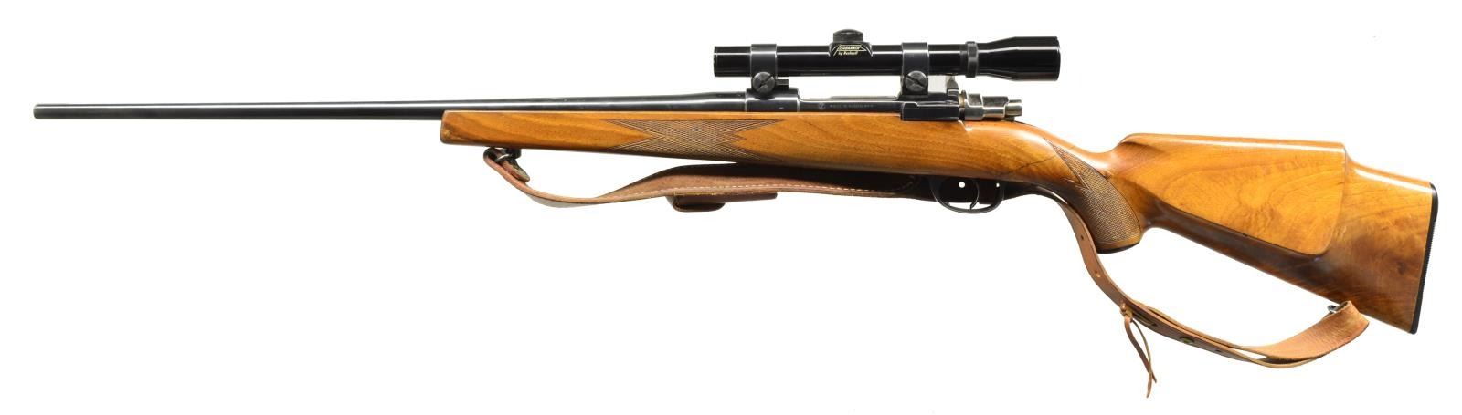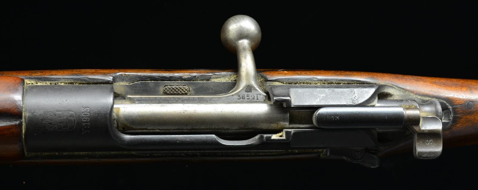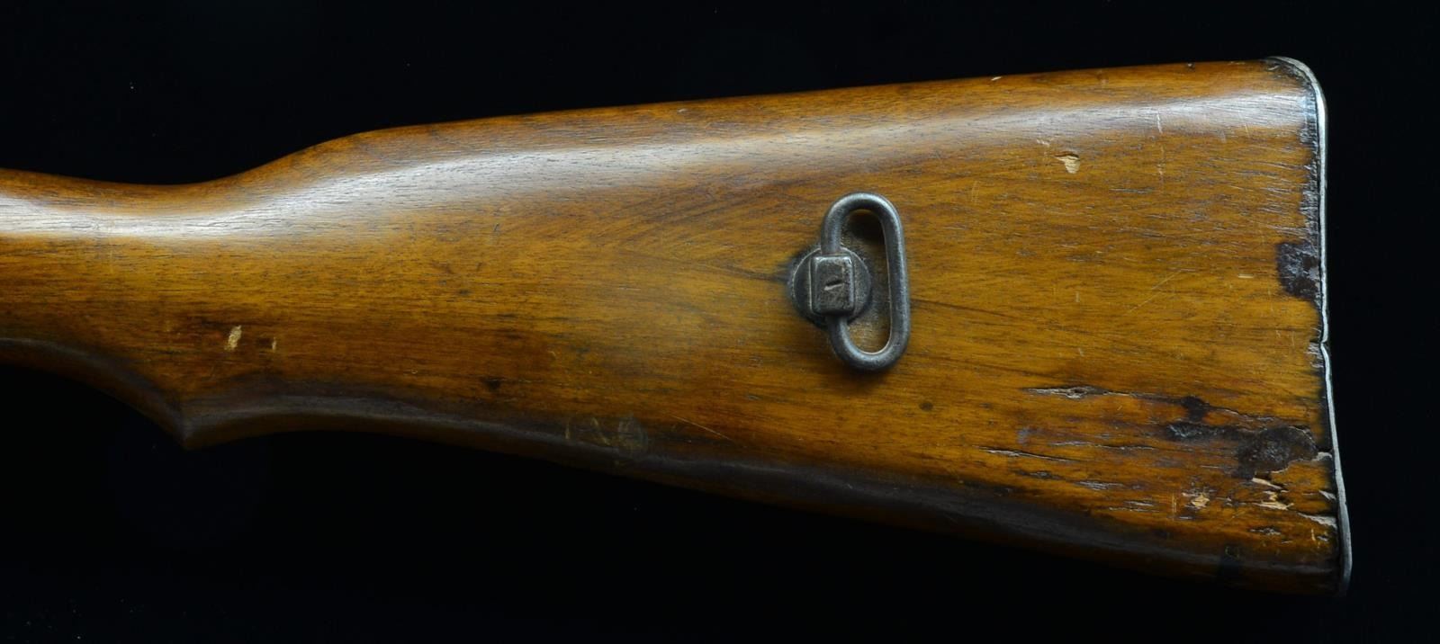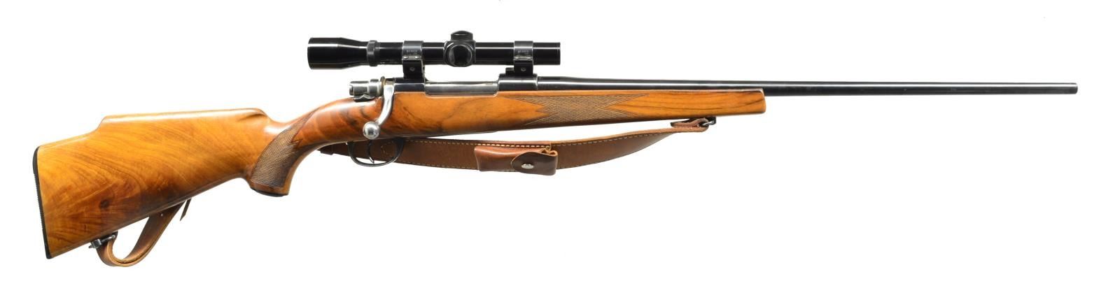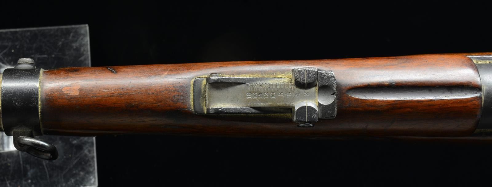 1) STEYR GREEK MANNLICHER SCHOENAUER 1903/14. Cal. 6.5mm Greek. S# 8648B. Bbl. 20.5". Band fastened Barleycorn front sight w/ 200-1800m leaf rear sight. Receiver has Greek crest over "Y:1903" on front ring. Left side of receiver marked "STEYR 1912". Standard turned bolt action w/ detachable rotary mag. Band fastened full length stock w/ finger grooved forearm & steel buttplate having walnut handguard. CONDITION: metal has faded to dark patina w/ spots of pitting. Sanded & refinished stock shows wear & handling marks. Handguard has long crack extending from tip. Front stock band & cleaning rod are not present. Dark bore w/ lightly worn rifling. (20-2305/DS). CURIO. 2) CZ M98 SPORTING. Cal. 30-06. S# 31387 (under wood line). Bbl. 24 1/2" custom sporter bbl. w/ out sights having hand stamped cal. marking. 2.5x20 Bushnell Banner gloss finished scope w/ standard crosshairs on Weaver mts. M98 action w/ right side sliding safety & hinged floorplate w/ lever in front of trigger guard bow. Left side of action marked "CZ MADE IN YUGOSLAVIA". Polished bolt w/ non matching S# "78773". Monte Carlo cheekpiece sporter stock w/ hand checkering, plastic buttplate & swivels w/ leather sling. Stock is adapted to this action having filler in front of floorplate. CONDITION: over 90% lightly faded blue showing scratches & marks on trigger guard. Stock is broken & repaired at wrist having lightly worn finish w/ scattered scratches & marks. Bore has worn rifling. (20-2319/DS). MODERN. $500-700.