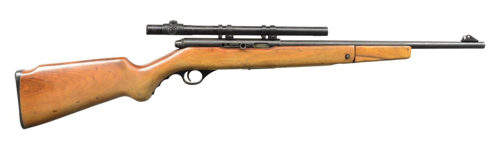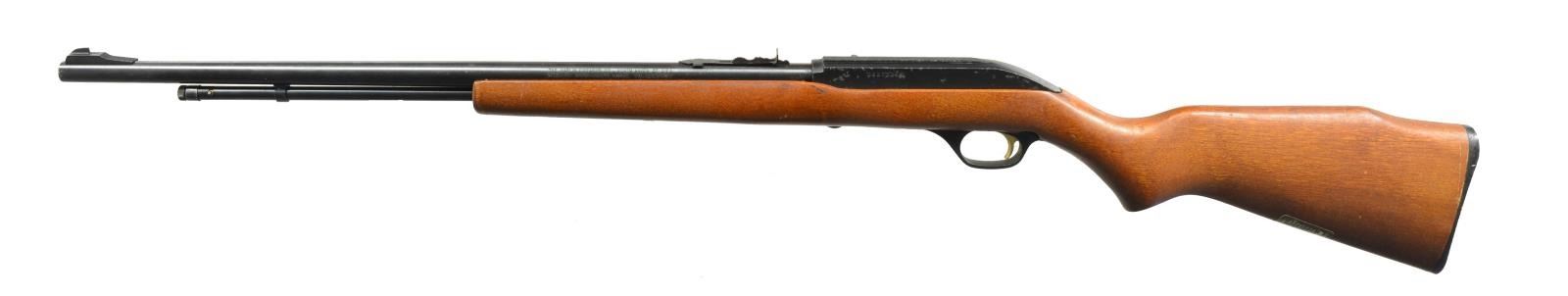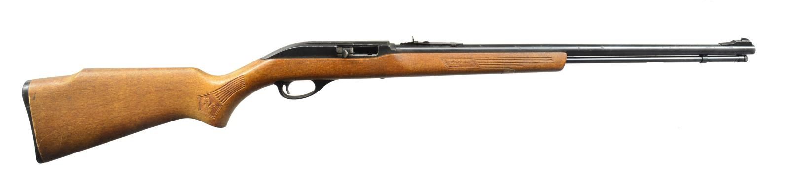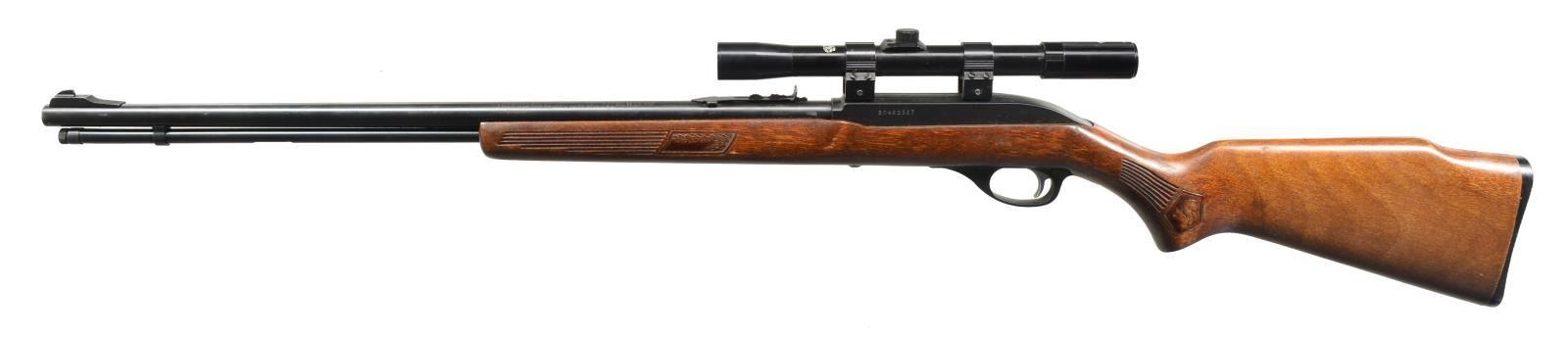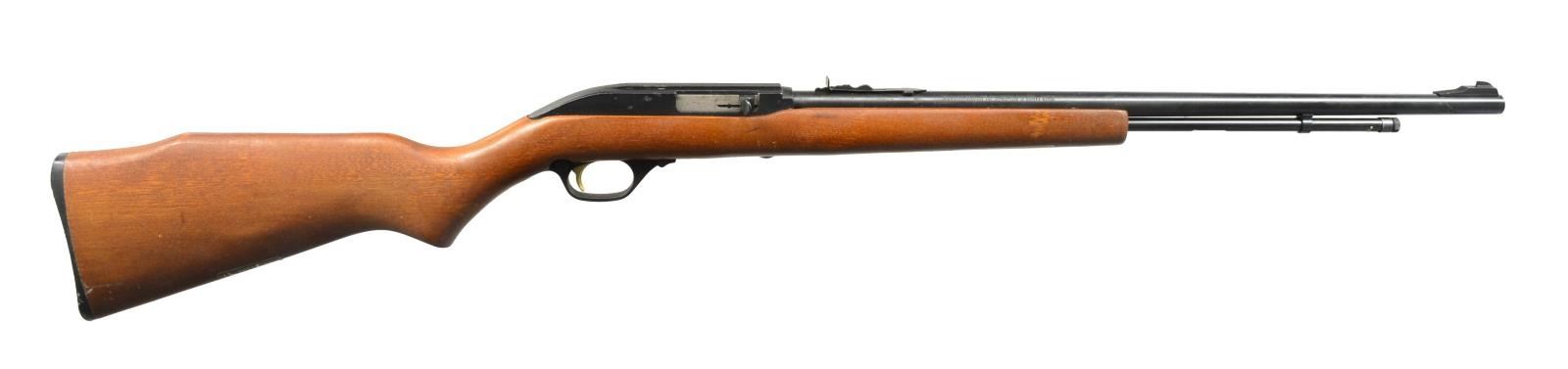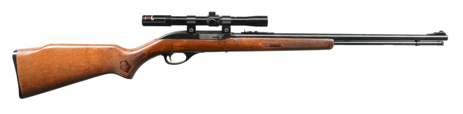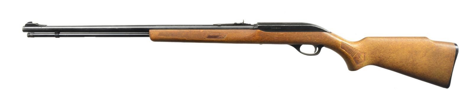 ALL: cal. 22 LR. 1) MARLIN GLENFIELD MODEL 60. S# 23518914. Bbl. 22" w/ Micro-groove rifling. Ramp mounted blade front sight w / sporting rear sight. Alloy action is grooved for tip off scope. Tubular mag. Hardwood Monte Carlo stock w/ pressed ornamentation & original buttplate. CONDITION: 80% metal finish showing scattered sm. spots of pitting & corrosion. Stock has lightly worn finish showing a few sm. marks. Bright bore w/ sound rifling. (20-2610/DS). MODERN. 2) CBC/FIE NYLON. S# GR40278. Bbl. 19 1/2". Blade front sight w/ sporting rear sight. Patterned after the Remington Nylon 66. Steel action cover is grooved for scope mt. attachment. Sliding top tang safety. Black nylon stock w/ checkering having white diamonds in forend. CONDITION: 70% blue w/ area of rust near muzzle & spots of surface corrosion on action cover. Stock shows scuffs & handling marks. Bright bore w/ strong rifling. (20-2632/DS). MODERN. 3) MARLIN MODEL 60. S# 06273349. Bbl. 22" w/ Micro-groove rifling. Ramp mounted blade front sight w/ sporting rear sight. Alloy action is grooved for tip off scope. Tubular mag. Hardwood Monte Carlo stock w/ original buttplate. CONDITION: over 90% metal finish showing spots of corrosion & finish loss. Original stock finish shows a few sm. marks. Bright bore retains sound rifling. (20-2633/DS). MODERN. 4) STEVENS MODEL 87D. NSN. Bbl. 24". Replacement bead front sight, filler in rear dovetail w/ Williams receiver sight. Tubular action is grooved for tip off scope. Hardwood pistol grip stock w/ buttplate. Added swivel bases. CONDITION: 70% dull thinning blue showing spots of corrosion & rust. Refinished stock shows scratches & handling marks. Bright bore retains sharp rifling. (20-2640/DS). CURIO. 5) MARLIN GLENFIELD MODEL 60. S# 20453327. Bbl. 22" w/ Micro-groove rifling. Ramp mounted blade front sight w/ sporting rear sight. Alloy action is grooved for tip off scope. Tubular mag. Hardwood Monte Carlo stock w/ pressed ornamentation & original buttplate. Ithaca Gun 4x20mm gloss finished scope w/ standard crosshairs on see through mts. CONDITION: 95% metal finish. Original stock finish shows a few marks. Bright bore retains strong rifling. Scope has clear optics. (20-2794/DS). MODERN. 6) MOSSBERG MODEL 377 PLINKSTER. S# M09033. Bbl. 20" sightless rnd. w/ Ac-Kru-Gruv rifling. Tubular receiver is grooved for tip off scope & has right side safety. Wood grain synthetic Monte Carlo, roll over cheekpiece, thumb hole stock w/ swivel bases & original buttplate. Tubular mag. loads through butt. CONDITION: 98% blue. Stock shows a few sm. marks. Bright bore w/ sharp rifling. (20-2849/DS). MODERN. 7) MOSSBERG MODEL 152. NSN. Bbl. 18 1/4" w/ Ac-Kru-Gruv rifling. Protected post front sight. Receiver sight is removed. 3/4" Tube 4x scope w/ standard crosshairs on tip off mts. Pistol grip Monte Carlo walnut stock w/ original buttplate having a folding walnut forend. MAGS: none. CONDITION: 70% dull blue, rifle & scope have general light surface corrosion. Sanded & refinished stock shows dents, marks & mildew spots w/ cracks on pistol grip. Bore retains sound rifling. (20-2860/DS). CURIO. $450-650.