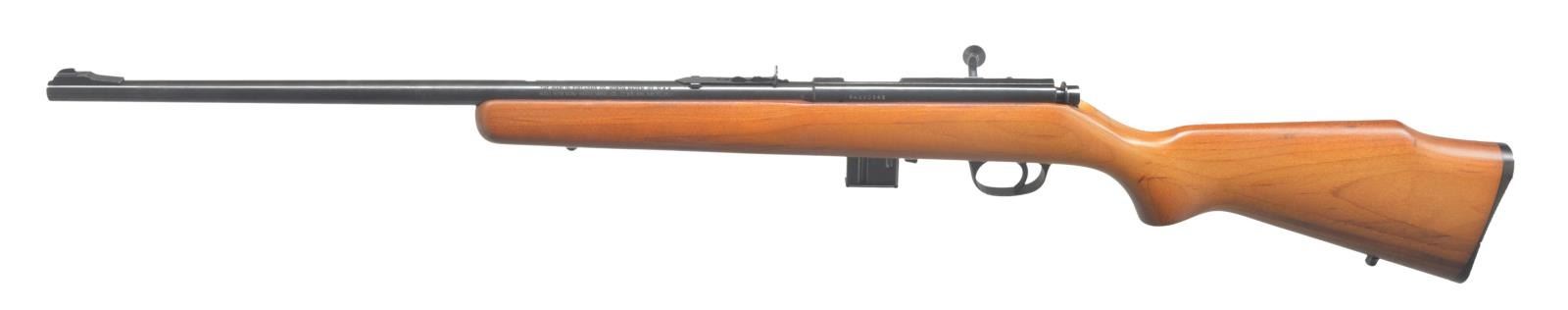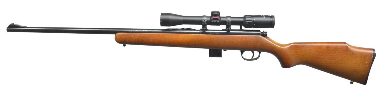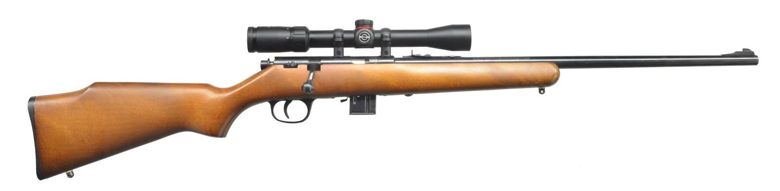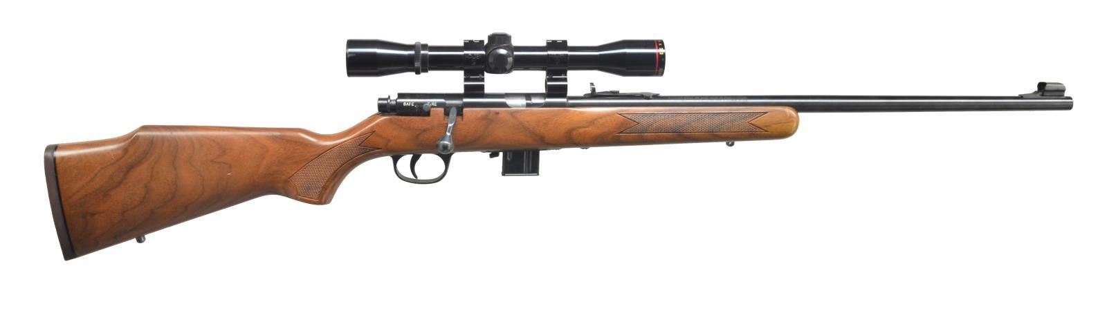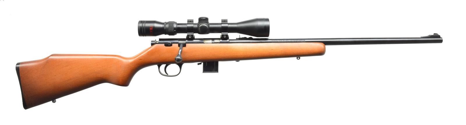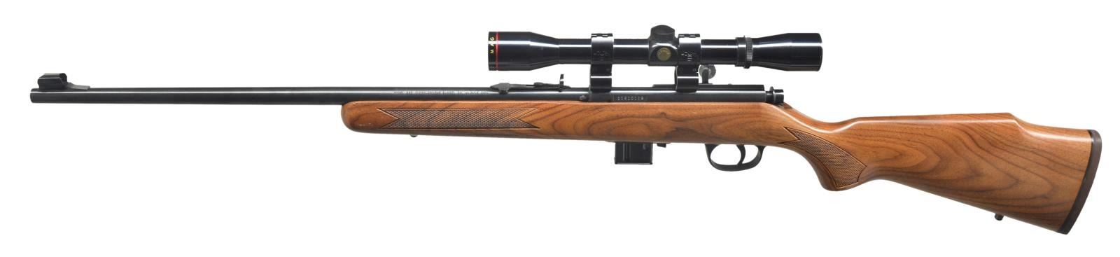1) MODEL 25MN W/ SCOPE. Cal. 22 WMR. S# 07610835. Bbl. 22" w/ iron sights. Bolt action w/ grooved top for scope. Birch Monte Carlo pistol grip stock w/ hard rubber buttplate & sling eyes. Rifle is fitted w/ Simmons 3-9 22 Mag. scope w/ duplex reticle & steel rings. MAGS: 7 rd. box mag. CONDITION: very fine, close to new w/ a few light handling marks. Scope is very fine, optics are clear. (20-3556/MGM). MODERN. 2) MODEL 925M W/ SCOPE. Cal. 22 Win. Mag. S# 93691851. Bbl. 22" w/ iron sights. Grooved bolt action receiver w/ 7 shot mag. Pistol grip Monte Carlo stock of birch, has hard rubber buttplate & sling eyes. Rifle is mounted w/ Traditions 3-9X scope w/ duplex reticle in alloy rings & Weaver type bases. CONDITION: very fine, nearly as new w/ only a few light handling marks. Mechanically fine. Scope is very fine, optics are clear. (20-3560/MGM). MODERN. 3) MODEL 925M. Cal. 22 WMR. S# 94690842. Bbl. 22" w/ iron sights. Grooved bolt action receiver. Laminated hardwood pistol grip Monte Carlo stock w/ hard rubber buttplate & sling eyes. MAGS: 7 shot detachable. CONDITION: very fine, very close to "as new" w/ only a few handling marks on all finishes. Mechanically fine. (20-3634/MGM). MODERN. 4) MODEL 882 W/ SCOPE. Cal. 22 WMR. S# 11510129. Bbl. 22" w/ iron sights. Grooved bolt action receiver. Checkered American walnut pistol grip Monte Carlo stock w/ rubber recoil pad, pressed checkering & sling eyes. Rifle is mounted w/ Simmons 22 Mag. 4X scope w/ duplex reticle in Holden "iron sighter" rings. MAGS: 7 shot detachable. CONDITION: very fine, very close to "as new" w/ a few minor handling marks. Mechanically fine. Scope is also "near new", optics are clear. (20-3635/MGM). MODERN. $700-1,000.