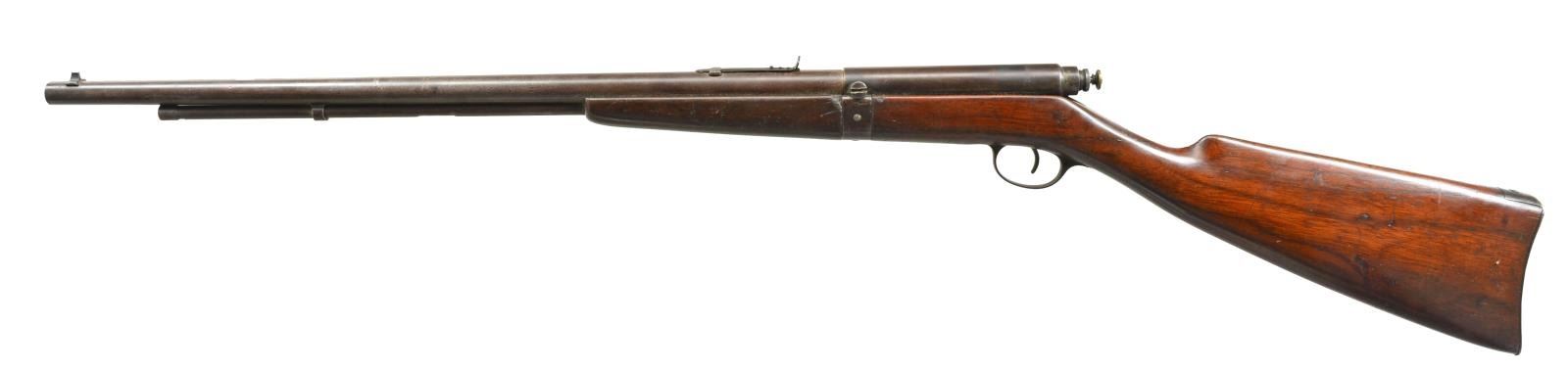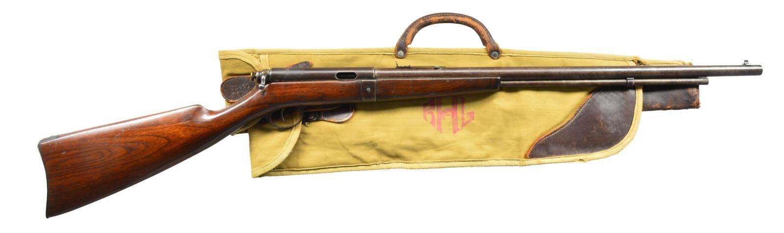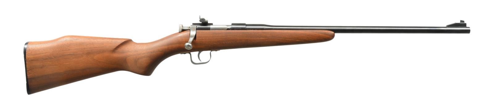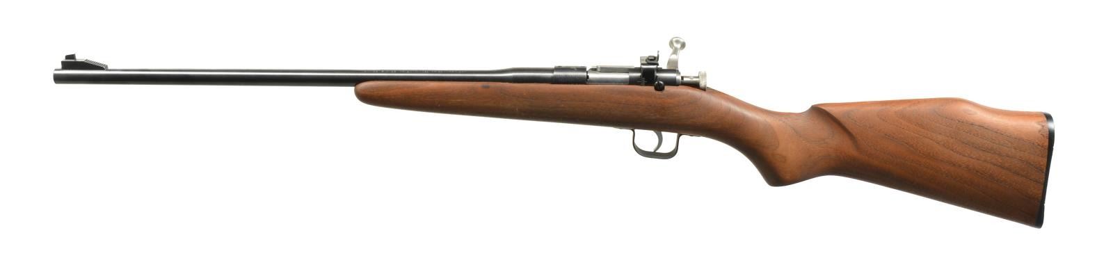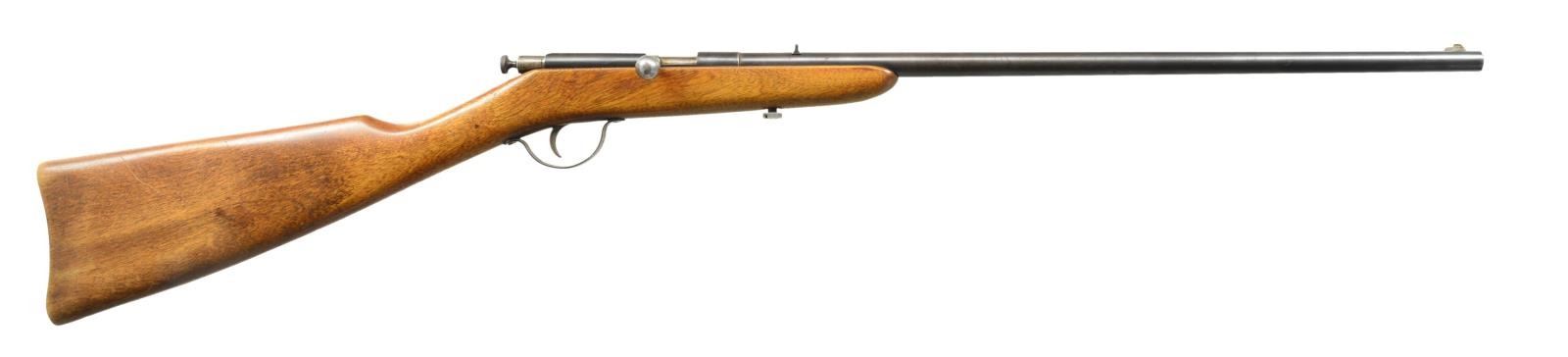 RIFLES. 1) PAGE-LEWIS RELIANCE MODEL D. Cal. 22 LR. S# 42677. Bbl. 20" rnd. w/ blade front sight & fixed square notch rear sight. Single shot manually cocked action. Straight grip walnut stock. CONDITION: 70% dull thinning blue. Stock has moderately worn finish showing numerous scratches & handling marks. Sound mechanics. Dark lightly worn bore. (20-2210/DS). CURIO. 2) HOPKINS & ALLEN TAKEDOWN REPEATER. Cal. 22 RF. S# 10726. Bbl. 22 3/8". 3/4 Length tubular mag. Bead front sight w/ elevator adj. U notch rear sight. Takedown style bbl. w/ attachment screw on left side of action. 2 Lug action has curled bolt w/ knurled knob handle that cocks on closing. Walnut forearm & perch belly walnut stock w/ crescent steel buttplate. UNATTACHED ACCESSORIES: Redhead brand canvas takedown case marked "RAL". CONDITION: action retains 60% dull blue fading to brown. Bbl. & mag. tube have faded to brown gray patina showing spots of light pitting w/ series of sm. dents at breach end. Wood has dark worn finish showing numerous scratches dents & marks. Sound action. Dark pitted bore. (20-2285/DS). CURIO. 3) ROGUE RIFLE CO. CHIPMUNK. Cal. 22 S, L, LR. S# 58504. Bbl. 16" w/ ramp mounted blade front sight & peep receiver sight. Action is drilled for scope attachment. Single shot manually cocked action. Walnut Monte Carlo stock, LOP: 11 1/2". Dainty youth sized rifle, overall length 29 3/4". CONDITION: over 98% wood & metal finish. Bright near excellent bore. (20-2286/DS). MODERN. $500-800.