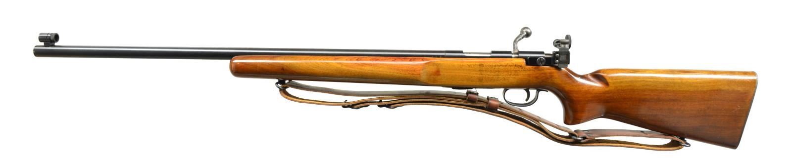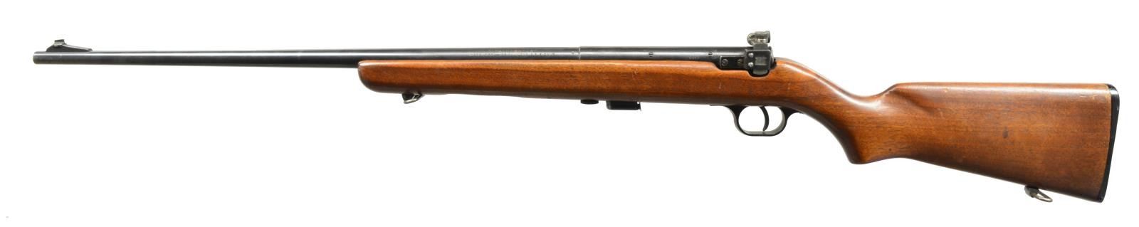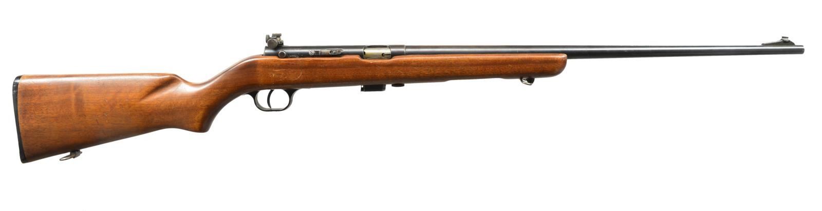 513T RIFLES. ALL: cal. 22 LR. 1) HARRINGTON & RICHARDSON MODEL 165 "LEATHERNECK" AUTOLOADING. S# 6543. Bbl. 23" tapered rnd. Ramp mounted blade front sight w/ Redfield M79 receiver sight. Blowback action w/ operating lever accessed through a slot at the bottom of the stock. Pistol grip walnut stock w/ steel buttplate. MAGS: 3 detachable 10 rd. CONDITION: 80% lightly worn blue. Stock shows numerous scratches & handling marks. Bolt stop is broken. Bore is bright w/ strong rifling. (20-2230/DS). 2) REMINGTON 513T MATCHMASTER BOLT ACTION. S# 144787. Bbl. 27" target weight. Globe front sight w/ Redfield M79 aperture receiver sight. Receiver grooved for tip off scope. Bbl. is drilled & tapped for scope blocks. Case colored bolt handle, cocking piece & trigger. Walnut target stock having accessory rail, military style leather sling on original swivels & checkered steel buttplate. Bbl. code indicates Nov. 1964 mfg. UNATTACHED ACCESSORIES: Remington instructions & parts list. 5 Front sight apertures. CONDITION: bbl. & action retain over 99% original blue. Bolt handle, cocking piece & trigger retain lightly faded case colors. Finish shows areas of peeling & light handling marks w/ light coat of added finish. Bright near excellent bore. (20-2241/DS). ALL CURIO. $600-900.