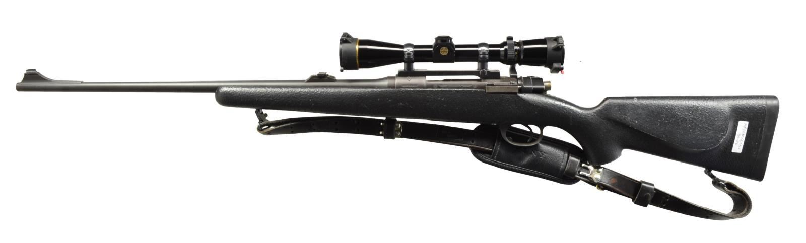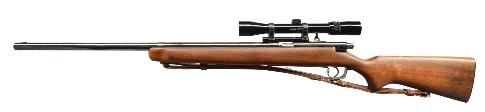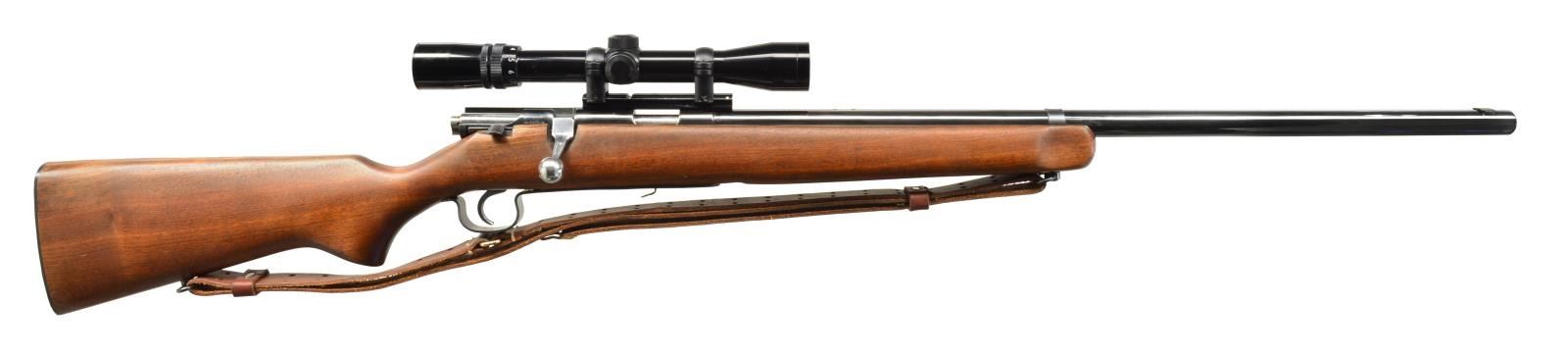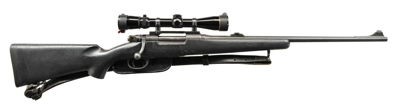 1) STEVENS 416 TARGET. Cal. 22 LR. NSN. Bbl. 26" heavy target weight w/ filler in front dovetail, plug screws & holes for rear sight. Bushnell Sportview 3-9x gloss finished scope w/ duplex reticle on Weaver style mt. Receiver is marked "U.S. PROPERTY". Walnut target stock w/ accessory rail in forearm, grooved steel buttplate & military sling on original swivels. MAGS: NONE. CONDITION: metal has brightly polished reblued finish. Stock has good refinish. Good mechanics. Bore retains lightly worn rifling showing scattered spots of very light pitting. Scope has good optics. (20-1857/DS). 2) INTERARMS WHITWORTH SEARCY ALPINER. Cal. 30-06. S# A276527. Bbl. 22 1/2" w/ ramp mounted bead front sight & folding leaf rear sight. Leupold VARI-X III 2.5x8 gloss finished scope w/ European style duplex reticle on Leupold mts. Bead blasted & blued metal finish. M98 action features Model 70 style safety, claw extractor, single stage trigger & hinged floorplate. Black crinkle finish synthetic stock w/ Uncle Mike's leather sling on QD swivels. LOP: 13" over solid black Pachmayr pad. CONDITION: over 90% metal finish. Stock shows scratches & marks. Good mechanics. Bore has lightly worn rifling. Scope has bright optics. (20-1862/DS). BOTH CURIO. $400-600.