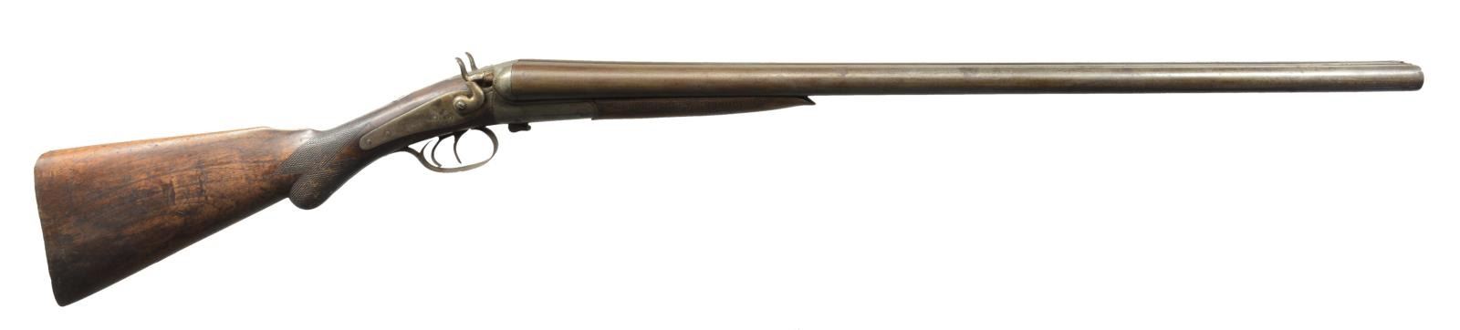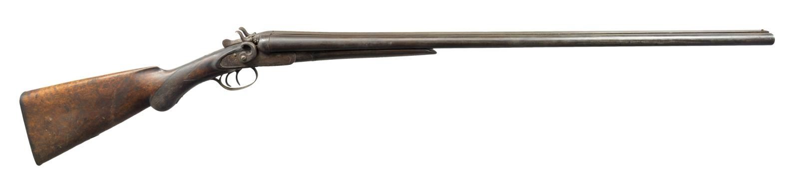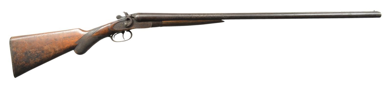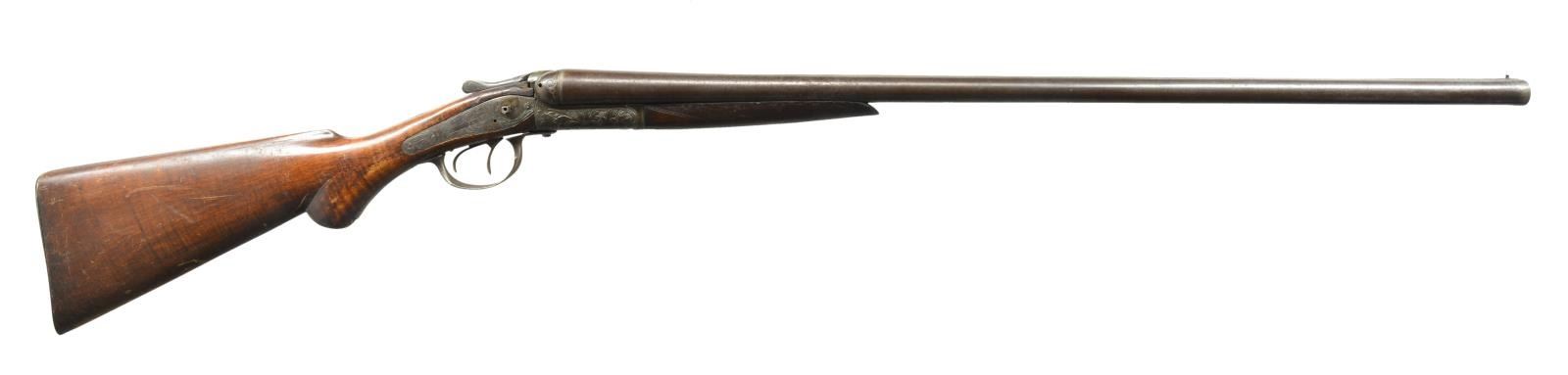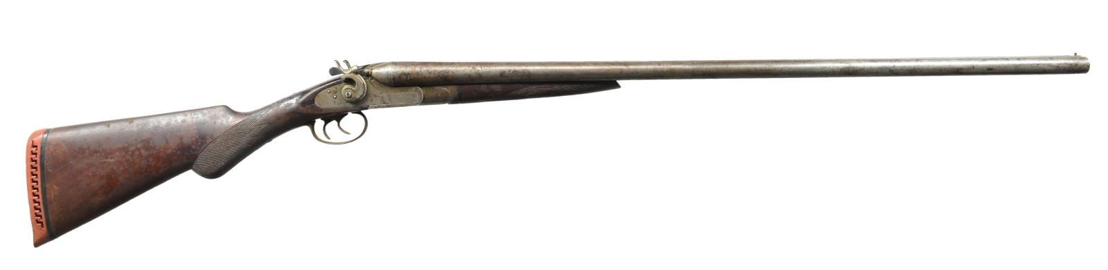 1) STANLEY ARMS CO. Cal. 12 Ga., 2 5/8". S# 731. Bbls. 30" of twist steel. Quarter & Half chokes. Brass front bead. Rnd. bodied top lever receiver w/ back action locks having full coverage foliate engraving. Dbl. triggers, extractors. Splinter forearm w/ replacement rnd. knob stock. LOP: 14" over steel buttplate. Belgium mfg. CONDITION: metal finish has faded to mottled gray brown showing spots of pitting. Forearm shows heavy wear. Replacement stock is poorly fit around action w/ sm. chips, scratches & handling marks. Hammers are missing. Bbls. are loose on frame. Lightly pitted bores. (20-2745/DS). 2) CRESENT FIREARMS. Cal. 12 Ga., 2 5/8". S# 397689. Bbls. 30" of fluid steel w/ Full & Full chokes & brass bead. Exposed hammer sidelock top lever action w/ dbl. triggers & extractors. Splinter forearm & rnd. knob walnut stock w/ hand checkering. LOP: 13 3/4" over aftermarket JC Higgins recoil pad. Mfg. in Norwich, CT. CONDITION: metal finish has faded to gray showing scattered surface corrosion. Wood has age darkened heavily worn appearance w/ scratches & handling marks. Stock is broken at head w/ chips around lock plates. Bores show some fouling. (20-2748/DS). 3) PIONEER ARMS. Cal. 12 Ga., 2 5/8". S# 6108. Bbls. 32" of Belgium laminated steel w/ Mod. & Mod. chokes. Brass bead. Exposed hammer sidelock top lever action w/ dbl. triggers & extractors. Walnut splinter forearm & checkered rnd. knob stock w/ steel buttplate having German silver name plate in toeline. Belgium mfg. CONDITION: metal has faded to brown patina showing surface corrosion. Stocks have dark worn appearance w/ numerous scratches & marks. Stock & forearm have sm. chips around iron. Bbls. are loose on frame. Dark pitted bores. (20-2781/DS). 4) ACME ARMS. Cal. 12 Ga., 2 1/2". NSN. Bbls. 30" of Belgium laminated steel. Cyl. & Cyl. bores. Brass bead. Exposed hammer sidelock top lever action w/ dbl. triggers & extractors. Splinter forearm & rnd. knob walnut stock w/ stele buttplate. Belgium mfg. CONDITION: metal has faded to brown showing scattered surface rust. Stocks have dark worn appearance w/ scratches & marks. Forearm is missing tip insert. Stock shows crack behind left lock plate. Bbls. are loose on frame. Pitted bores. (20-2783/DS). 5) H.J. STERLING. Cal. 10 Ga., 2 7/8". S# 6981. Bbls. 29 7/8" fluid steel w/ fixed Full & Full chokes. Round bodied sidelever action w/ exposed hammer side action locks. Dbl. triggers. Extractors. Splinter forearm & rnd. knob walnut stock w/ hand checkering having name plate in toeline. Metal buttplate is not present. Belgium mfg. CONDITION: bbls. fading to brown showing surface corrosion. Action has faded to gray brown showing spots of corrosion & rust. Wood shows heavy wear w/ numerous scratches, dents & marks. Forearm has sm. chips along bbl. channel. Stock is missing lg. chip at peak of comb. Buttplate is missing. Lightly pitted bores. (20-2785/DS). ALL CURIO. $400-700.