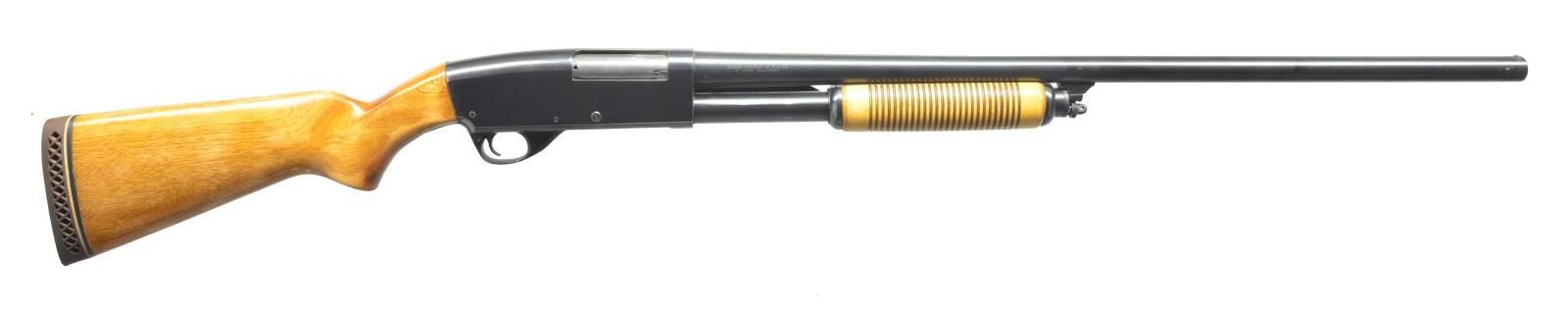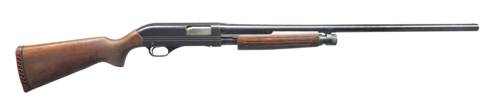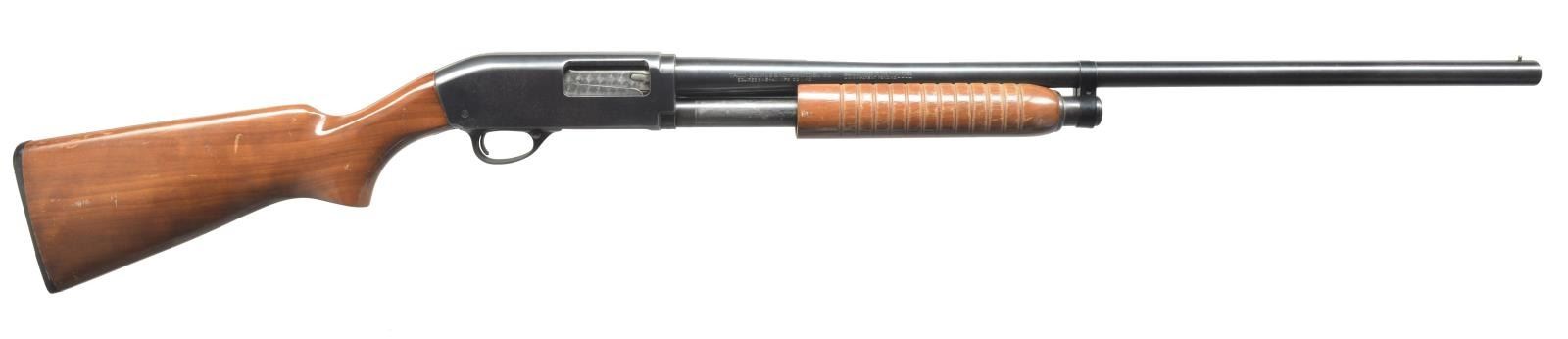 1) SQUIRES BINGHAM MODEL 30. Cal. 12 Ga., 2 3/4". S# 252264. Bbl. 28" plain w/ silver center sighting bead. Left side of receiver marked “SQUIRES BINGHAM”. Left side of bbl. marked “12 GA-2 3/4 CHAMBER PROOF TESTED / THE AMERICAN IMPORT CO SAN FRANCISCO, CALIF.” Forend has 12 half rings on each side. Uncheckered pistol grip. Black hard rubber buttplate w/ lg. “S”. CONDITION: bbl. retains most of its original blue w/ minor surface oxidation near muzzle & slight rub line at chamber. Receiver has most of original blue w/ a couple spots of fine surface oxidation. Forend has original finish w/ minor scuffing. Buttstock has original finish w/ some handling marks & light scratches. Bore is good. (20-3431/BT). MODERN. 2) SEARS MODEL 200. Cal. 12 Ga., 2 3/4". S# 14394. Bbl. 28" plain. Full choke w/ silver center sighting bead. Receiver has 3 parallel lines on each side. Forend has 3 parallel lines on each side. Uncheckered pistol grip stock w/ red vented recoil pad. 2 3/4" Chamber w/ full choke. CONDITION: bbl. has original blue w/ minor surface oxidation near muzzle & few minor scratches. Receiver has original black finish w/ minor scratches. Forend has original finish w/ minor hand wear. Buttstock has original finish w/ numerous handling marks. Bore is good. (20-3476/BT). CURIO. 3) SPRINGFIELD MODEL 67F. Cal. 12 Ga., 3". NSN. Bbl. 28" plain. Silver front sighting bead. Left side of receiver marked “SPRINGFIELD MODEL 67F SAVAGE ARMS CORPORATION WESTFIELD, MASS. U.S.A.”. Forend has 26 rings. Uncheckered pistol grip buttstock w/ brown vented Empire Sports recoil pad. CONDITION: bbl. retains original blue w/ minor handling marks. Mag. tube has original blue w/ few rub marks. Receiver has good original blue w/ a few scratches. Forend has a light coat of added finish. Buttstock has a coat of added finish w/ hand wear in grip area. Bottom of grip cap has vacant screw hole. Bore is bright. (20-3494/BT). CURIO. 4) STEVENS MODEL 77E. Cal. 410, 3". NSN. Bbl. 26" plain. Silver front sighting bead. Forend has 12 rings. Uncheckered pistol grip stock w/ unmarked solid black recoil pad. CONDITION: bbl. retains most of its original blue w/ minor muzzle wear. Receiver has most of its original blue w/ a sm. rub mark from forend on right side. Forend has a coat of added finish w/ minor handling marks. Buttstock has added finish w/ a 1 1/2" added length. Bore is good. (20-3495/BT). CURIO. $1,000-2,000.