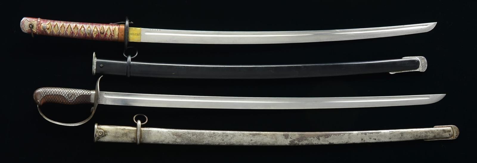 1) M1899 TYPE 32 SABER. Overall length: 37". Blade length: 30 1/4". M1899 sabers were used by both the cavalry & the army. This example is for an army NCO & is known as the Otsu pattern. It was produced in Tokyo by the Hohei Kosho Arsenal. This type of saber saw use during the Russo-Japanese War, WWI & WWII. Single fullered blade marked at the ricasso, “90004”. 1 Piece steel guard & knuckle bow w/ checkered steel backstrap. 1 Piece checkered wood grip. Iron scabbard w/ a single suspension ring. CONDITION: both sword & scabbard show light wear overall w/ some mottled oxidation on the surface of the scabbard. 2) SHIN-GUNTO KATANA. Overall length: 38". Blade length: 27 1/4". Blade has a full length hi & no discernible hamon. The number “66235” is stamped above the hi near the gilded brass habaki. Plain iron tsuba w/ 1 seppa above & below. Copper fuchi w/ a stamp for the Kokura Arsenal. Painted aluminum tsuka w/ simulated 3 cherry blossom menuki on each side. Kabuto-gane is complete w/ lanyard ring. Black painted steel saya. CONDITION: blade shows light wear. Tsuka shows light to moderate wear w/ some finish loss. Saya may have been repainted. (02-14637/BF). $400-700.