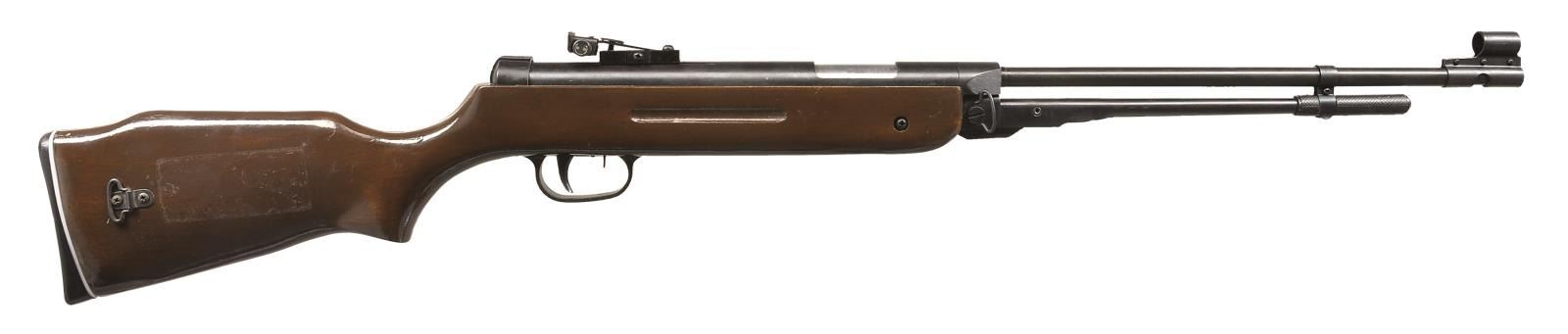 Cal. .177. NSN. Bbl. 17 1/2". Underlever cocking spring action. Hooded post front sight w/ square notch adj. rear sight. Finger groove hardwood Monte Carlo cheekpiece stock w/ sling swivels & plastic buttplate. CONDITION: 90% blue. Stock shows scratches & marks. Bore retains strong rifling. Action has good compression. (02-14535/DS). $25-50.