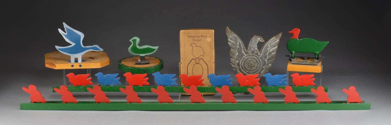 TARGETS. Targets include “Spinning Bird Target” by Chas. M. Biddle Co. Quail shaped target is painted red & white w/ stand, original cardboard shipping box & reprinted pages from earlier Rifleman Magazines w/ ads showing the target. Target appears to have seen little, if any, use, but may have been repainted. Box has wear, scuffing & sm. tear on cover but reinforced corners are tight. / Cast iron standing eagle target w/ upraised wings. Target is approx. 14" tall & 10" wide. Approx. 1/2" thick. Center circles are approx. 4" in dia. 3 Drilled mounting holes. Gray patina like finish has staining. Target shows sign of use, but is in good serviceable condition. / 3 Cast iron bird targets mounted on oak display boards. 1 Is sitting duck w/ cast iron base, approx. 8" long. 1 Is sitting duck on circular wooden base, approx. 6" long. 1 Is flying duck, approx. 9" long w/ uplifted wings. Targets fold down onto bases for storage. / 9 Sitting duck silhouettes on angle iron base. Ducks are approx. 3x4" painted alternately red & blue. Green angle iron base is approx. 50" long. / 11 silhouettes, which appear to be a soldier w/ his rifle at port arms, overall length at 61" long. “Soldiers” are painted red. Frame is green. Targets appear to be used, but in good serviceable condition w/ light wear, scattered spots of flaking paint. (02-13928/RW). $300-500.