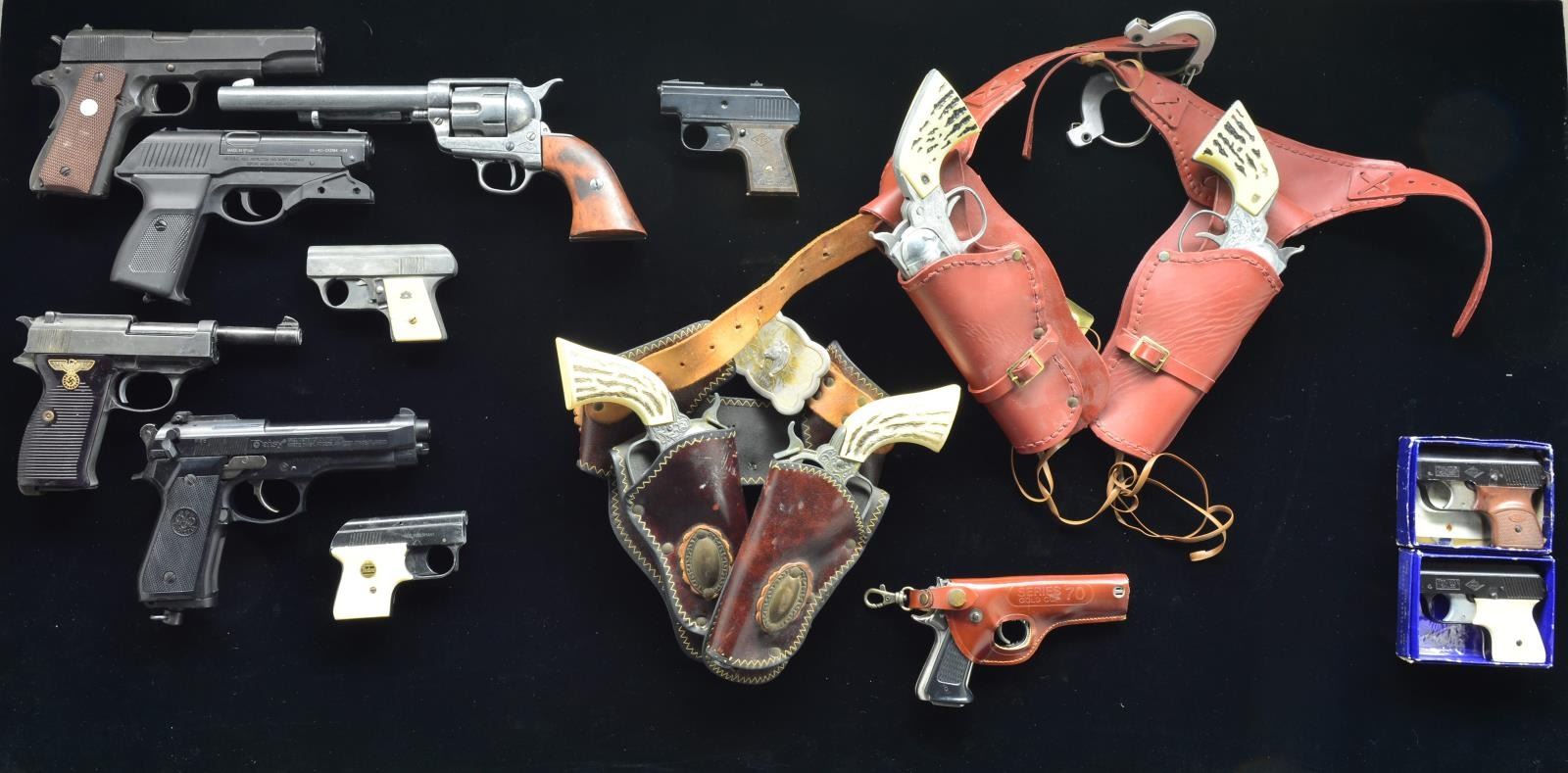 CAP GUNS: 1,2) TONY BOY 2 GUN SET. 2 Die cast cap guns w/ 1 piece plastic grips. Set includes a naugahyde belt w/ 2 holsters. Belt contains cartridge loops w/ 6 plastic cartridges. Nickel finished stamped belt buckle showing horse's head & horseshoe. Belt is ornamented w/ 2 stamped medallions. Holster is ornamented w/ stamped oval plate. CONDITION: Revolvers are missing side plates & retain some chrome finish in protected areas. Grips show wear & cracks. Belt & holster show moderate wear. 3,4) 2 Daisy cap guns. Single Action revolver of die cast construction w/ chrome finish & 2 piece plastic grips. Plastic gun belt w/ 2 plastic loop style holsters. Also includes toy hand cuffs. CONDITION: guns retain 80% chrome finish w& have internal corrosion making operation difficult. Belt & holster show light wear. 5) DYNA-MITE DERRINGER STYLE CAP GUN. Chrome finish w/ ivory appearing plastic grip. Utilizes toy cartridge w/ cap stuck to its base. Includes plastic holster w/ belt loops & total of 3 toy cartridges. STARTER GUNS: 6) MONDALE MODEL 19X. 6 Shot pistol for crimped 22 cal. blanks. Includes 2 piece box, instruction sheet, & 6 rd. die cast mag. CONDITION: 90% finish. Action functions. 7) MONDALE MODEL 1900. A 6mm blank gun w/ 6 rd. mag. Includes 2 piece box. CONDITION: 98% finish. Action functions. 8) THALSON 22 CAL. STARTER PISTOL. 6 Rd. mag. CONDITION: 70% painted finish. Grips are chipped at corners. Action is functioning. 9) MONDALE BREVETTATA 22 CAL. BLANK. STARTER PISTOL. 6 Rd. mag. CONDITION: finish has faded to gray showing corrosion. Plastic grips show cracks & chips. Action is not functioning. 10) RTS 22 CAL. BLANK STARTER PISTOL. Includes 6 rd. mag. CONDITION: 95% painted finish. Brown plastic grips show light wear. Action functions. AIR GUNS: 11) DAISY POWERLINE MODEL 92. Cal. 177. CO2 powered air gun styled like a Beretta 92 FS pistol. Action is not functioning. 12) GAMO MODEL P-23. Cal. 177. S# 04-4C-013194-03. CO2 powered air pistol styled to look like semi auto pistol. 13) WESTERN ARMS NON FUNCTIONING TOY PISTOL. Styled like Colt Gold Cup National Match. Includes leather holster. NON WORKING REPLICAS.: 14) RMI JAPANESE 1911AI-67. Die cast construction w/ working slide & action. Checkered plastic grips. CONDITION: 90% parkerized appearing finish. Mag. base is missing. 15) MGC 67, P38 REPLICA # 00695. Die cast replica w/ 2 piece plastic grips. Right grip panel has WWII style eagle marking. Removable mag. CONDITION: action is not functioning. 70% metal finish. Grips show light marks. 16) BKA 98 COLT SAA REPLICA. die cast construction w/ antique gray finish. 2 Piece wood grips. Removable 6 shot cyl. & functioning action. (02-14103/DS). $200-400.