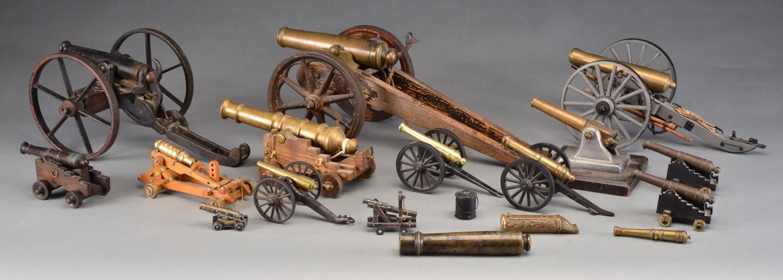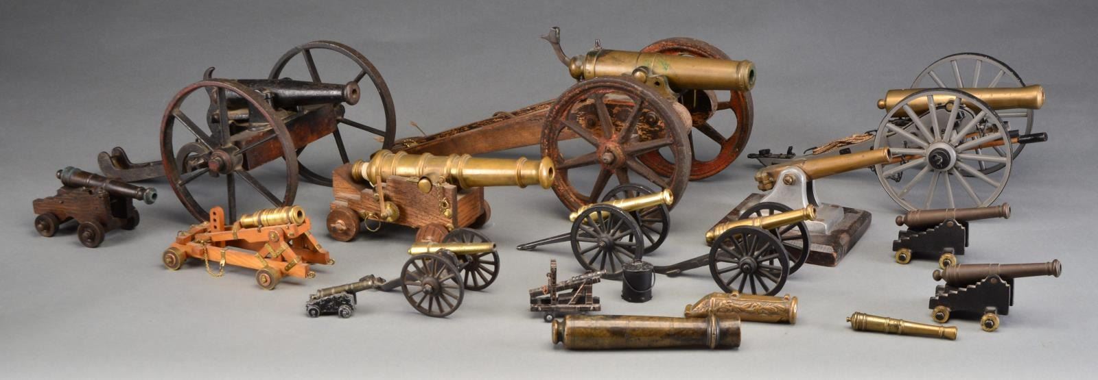 CANNONS. This group of cannons represents examples from the mid 1800s to present day. A wide representation of sizes & styles w/ some being operative & others purely decorative. 1) Iron tube, iron & wood carriage & iron wheels. 17” Overall w/ a 7 1/2” tube. 7 3/4" Spoked wheels. Cannon appears able to fire a projectile. 2) Brass tube, iron & wood carriage, iron & wood wheels. 15 1/2" Overall w/ an 8 1/2" tube. 6 1/2" Spoked wheels. Cannon does not appear functional. 3) Brass tube, iron carriage, iron wheels. 8 1/4" Overall w/ a 5 1/4" tube. 3 3/8" Spoked wheels. Cannon does not appear functional. 4) Brass tube, wooden naval carriage, wood wheels. 11" Overall w/ a 10 1/2" tube. Solid wooden wheels. Cannon appears able to fire a projectile. 5) Brass tube, iron carriage, iron wheels. 8 1/2" Overall w/ a 5 1/4" tube. 3 1/2” Spoked wheels. Cannon does not appear functional. 6) Brass tube, wooden naval carriage, wooden wheels. 6 3/4" Overall w/ a 6" tube. Solid wooden wheels. This cannon has a tag that states it is a model of a cannon used on the ship Royal George that was sunk in 1840. Cannon does not appear functional. 7) Brass tube, wooden carriage, brass & wood wheels. 7 3/4" Overall w/ a 3 1/4" tube. Brass cased wooden wheels. Cannon does not appear functional. 8) Brass tube, iron carriage, iron wheels. 7 1/4" Overall w/ a 4" tube. 3” Spoked wheels. Cannon does not appear functional. 9) Brass tube. 7 1/2" Overall. Bbl. has turned lineal decoration w/ approx. a 1/2" bore. Cannon bbl. appears able to fire a projectile. 10) Brass tube. 4 1/2" Overall. Bbl. has cast in floral decoration w/ approx. a 3/4" bore. Cannon bbl. appears able to fire a projectile. 11) Brass tube. 4 1/2" Overall w/ approximately a 1/4" bore. Cannon bbl. does not appear functional. 12) Brass tube, aluminum carriage on a wooden base. 8" Overall w/ a 6 1/2" tube. A stationary Coast Artillery type cannon. Cannon does not appear functional. 13) Brass tube, iron naval carriage, brass wheels. 5 1/4" Overall w/ a 5" tube. Solid brass wheels. Cannon does not appear functional. 14) Brass tube, iron naval carriage, brass wheels. 5 1/4" Overall w/ a 5" tube. Solid brass wheels. Cannon does not appear functional. 15) White metal tube, carriage & wheels. 3" Overall w/ a 2 3/4" tube. A toy from Colonial Williamsburg. 16) White metal tube & carriage, plastic wheels. 3" Overall w/ a 1 1/2" tube. A “Play Me” toy. 17) Brass tube, wooden carriage, iron wheels. 21 1/2" Overall w/ a 9 3/4" percussion tube. 7 1/2" Spoked wheels. Cannon appears able to fire a projectile by means of musket cap & percussion ignition system. Bore is approximately 3/4". CONDITION: as expected condition varies greatly. Most of the smaller & toy cannons show light wear. The larger signal & model cannons show wear but appear completely functional. We do not guarantee the operation of any cannon & do not recommend loading or firing any of the above operable cannons. PROVENANCE: From the Collection of John "Tim" Breth Jr. (02-13817/BF). $500-800.