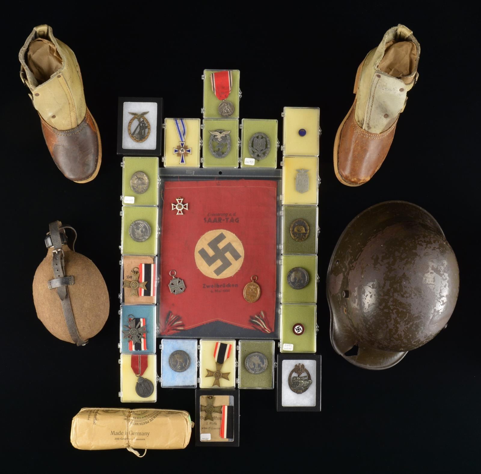 FIELD GEAR & MORE. This varied group includes 2 War Merit Crosses w/out swords including original issue envelopes. / 1 War Merit Cross w/ swords. / 1 Russian Front medal. / 1 Silver Wound badge. / 1 Enameled Party pin produced in Austria. / 1 Black Wound badge. / 4 Tinnies that read “Groszdeutschland ist unser - 10.April 1938 -“ w/ the country of Germany in the center along w/ a Party symbol. / 1 War Merit Cross w/out swords. / 1 Original bundle of what appears to be 4 strand twine. / 1 Luftwaffe Air Sea Rescue Badge of post WWII mfg. / 1 Luftwaffe Ground Assault badge. / 1 Army General Assault badge. / 1 Army Tank Assault badge for 25 assaults of post WWII mfg. / 1 Mother’s Cross in bronze w/ ribbon. / 1 Westwall medal w/out ribbon. / 1 WWI Service Cross w/out ribbon. / 1 Anschluss medal w/ ribbon. / 1 WWI Italian lapel pin. / 1 WWI enameled War Merit Cross w/out ribbon. / 1 Early Party pennant measuring 11 1/2" x 8 3/4" that reads, “Erinnerung a.d. SARR-TAG Zweibrucken 6. Mai 1934”. / 1 Canteen w/ felt cover & leather suspension straps but no cup. / 1 Pair of wooden soled, leather boots in size 26 captured in Holland & brought back by a vet. / 1 WWI relic German helmet w/ shrapnel damage to the front visor (no liner). CONDITION: most items in this lot show light to moderate wear & occasionally show some oxidation. Pins are mostly intact. Enameled decoration is mostly undamaged. Some ribbons have staining. Boots show storage wear only. (02-14032/BF). $800-1,200.