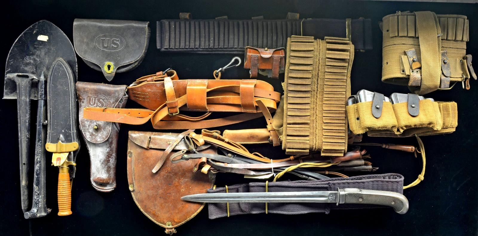 This varied lot of American military equipment includes 16 washers likely removed from an M1913 Patton saber. / 9 Leather sword knots from an M1913 Patton saber. / Dyer cartridge box. / M1880 Hunting knife & scabbard numbered “2387”. / Sm. russet leather pistol cartridge box holding 12 cartridges in a wood block. / Blue canvas Mills type cartridge belt w/ “C” closure. Belt appears to hold 30-40 Krag ammo & has 4 open pockets likely for clips/packages. / Blue canvas Mills type cartridge belt w/ “C” closure. Belt appears to hold 30-40 Krag ammo & has 4 pockets w/ leather thong closures & a brass button on the front of the pocket. / Empty scabbard for an M1880 hunting knife. / Holster for an M1911 Automatic marked on the reverse, “CLINTON 1918 F.W.T.”. / M1917 revolver ammunition pocket for six 3 rd. charges in 3 divided sections. / 2 WWI era entrenching shovels utilizing a picket pin as the handle & shaft. Shovel blade is removable to facilitate use as a picket pin/hammer. / 5 Canvas rope lanyards w/ brass spring clips marked “PAT. FEB-20-17”. / Sm. leather pouch w/ WWI button style closure marked on the reverse, “R.I.A.1915.W.Mc”. / Leather scabbard for a WWI picket pin. / Leather scabbard for a WWI entrenching shovel marked “ROCK ISLAND ARSENAL”. / Cut down 21 1/2" M1913 Patton saber w/ guard removed & no scabbard. / Leather & iron swivel attachment to attach an M1913 Patton saber to a saddle. / Leather Patton saber holder marked “R.I.A.1916”. CONDITION: most items show light to moderate wear. The leather M1913 saber saddle attachment shows heavy wear & minor losses. (02-13690/BF). $1,600-2,600.