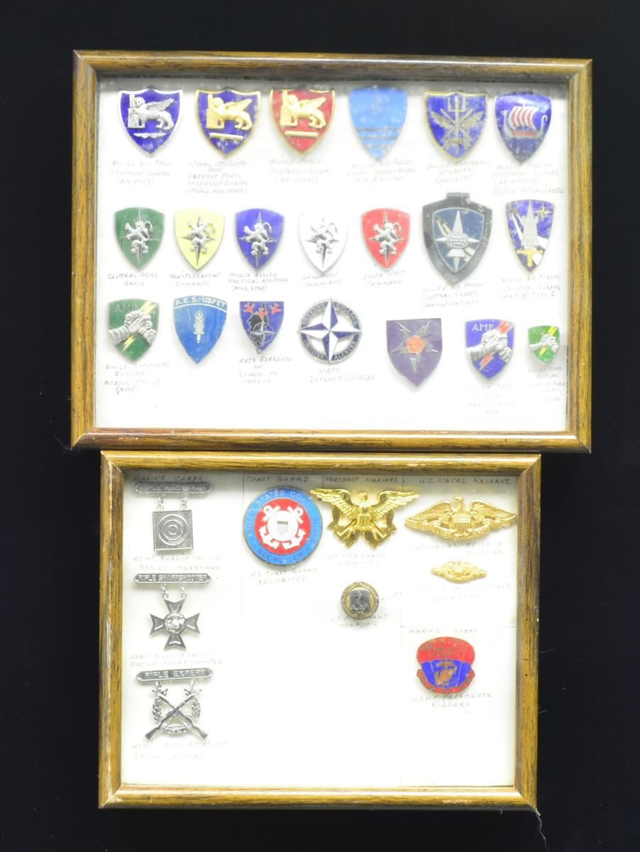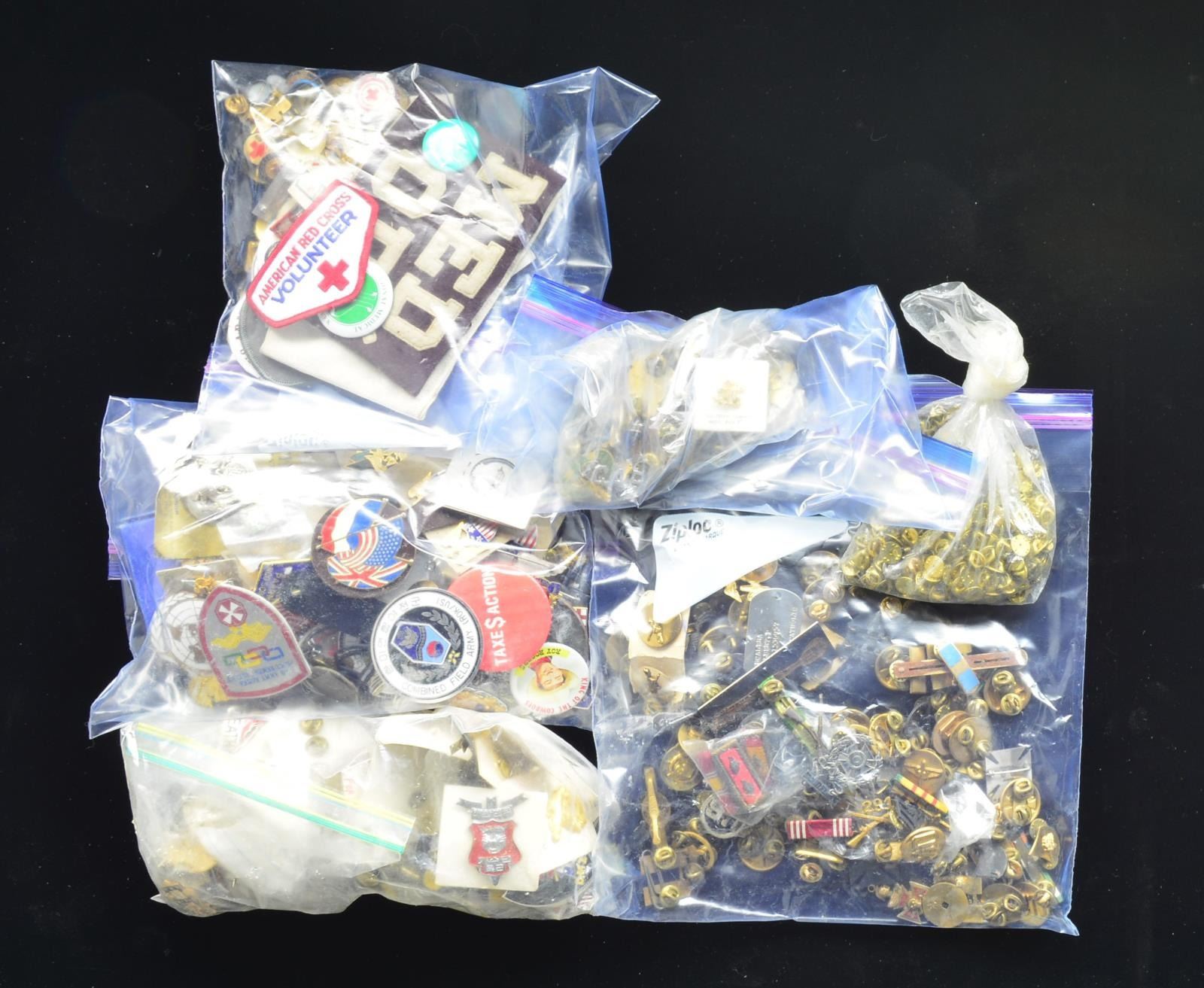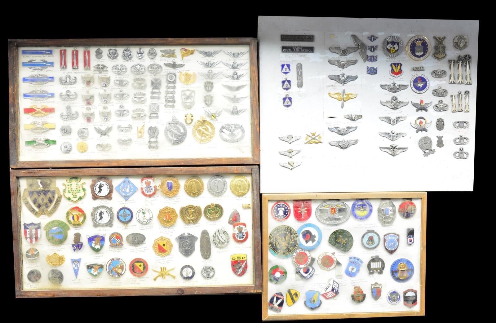MILITARY INSIGNIA. This huge lot includes, but is not limited to, a lg. variety of wings, Air Force missile command badges, recruiting command badges, parachute badges, air traffic wings, enameled uniform badges, expert infantry badges, Air Borne badges, marksmanship awards, glider badges, hat insignia, Merchant Marine badges & insignia, collar disks, medal ribbons, divisional insignia, buttons, arm bands, rank devices & hundreds more to be discovered. CONDITION: most items are unissued, a few show slight wear. (02-14050/BF). $1,000-1,500.