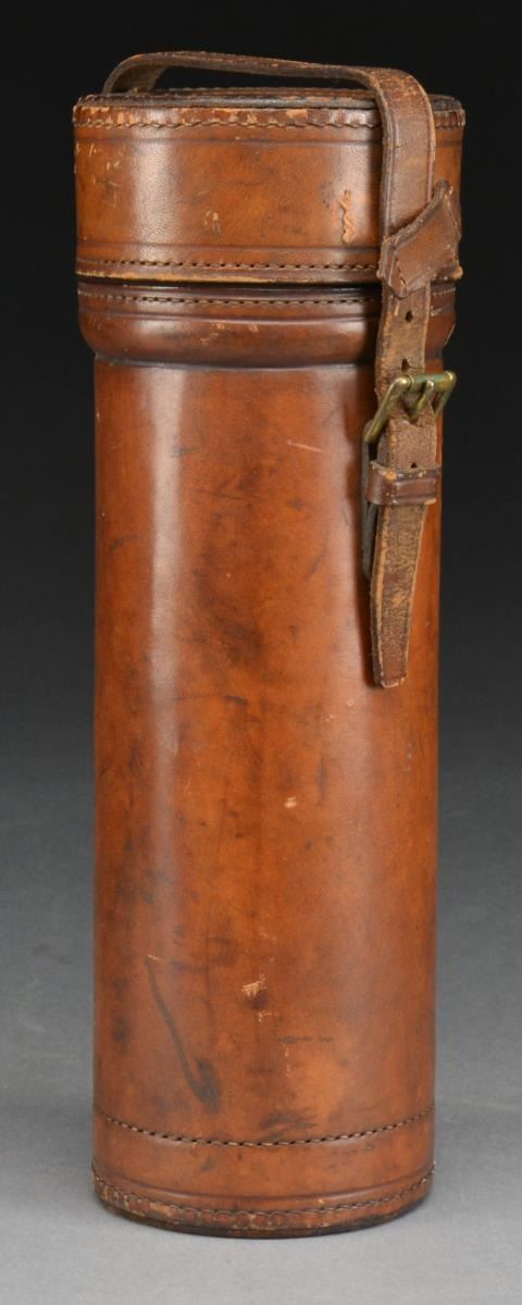 Tubular Russet leather case measuring approx. 4" diameter, 12" height. Top is secured w/ leather strap & buckle. Mustard colored wood lining. CONDITION: leather & wool shows light wear, scuffing & staining. Stitching is generally tight except for retaining strap on cover. (02-14092/RW). $75-150.
