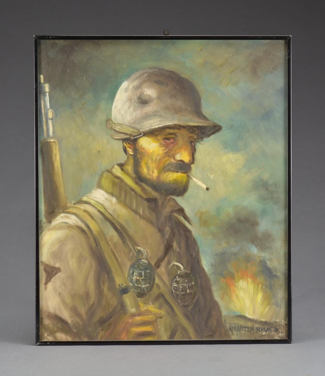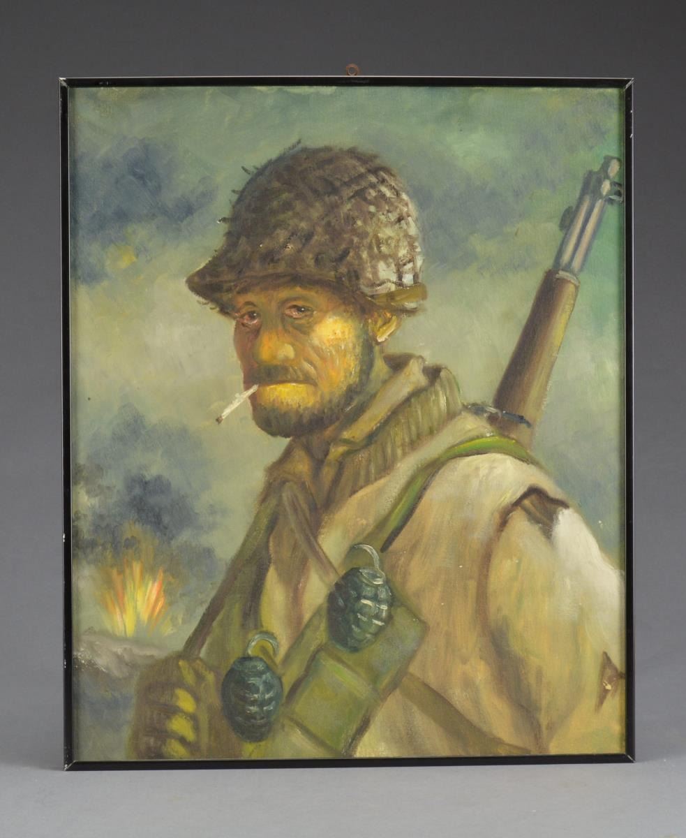 LAUTENSCHLAGER. Robert Lautenschlager, 1920-1975, of Oshkosh, Wisconsin, was a popular artist amongst Oshkosh residents during the 1960’s & 70’s. Internet research indicates that though he dated his murals, Lautenschlager’s paintings were rarely dated. Lautenschlager was drafted into the army in WW2 & served in North Africa. While in service, he drew cartoons that were published. After the war, he returned home & w/ the help of the GI Bill, enrolled in the Layton School of Art. The portraits in this lot may be based on Willie & Joe, cartoon characters created by Bill Mauldin for “Stars and Stripes” & later published in Mauldin's book “Up Front”. It’s possible that Mauldin may have met Lautenschlager while serving in North Africa. Subject depict the reality of American GIs as they looked after long periods of weary frontline combat. Paintings are approx. 20 1/2" x 24 1/2”, including black metal frames. Paintings have nice appearance. CONDITION: paintings are in generally nice, attractive condition w/ occasional flecks of missing paint & sm. spots of staining. Frames have light wear & scattered scratches. (02-14110-4/RW). $400-600.