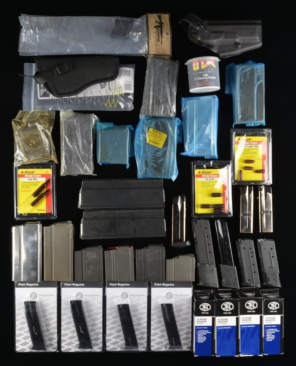 & ACCESSORIES. 1) 2-30 rd. M1A. 2) 8-20 rd. M1A. 3) 4-10 rd. M1A. 4) 2-5 rd. M1A. 5) 2-10 rd. FNP-45 & 2-10 rd. FNP-45 body only. 6) 1-15 rd. FNP-45. 7) 4-20 rd. Five-Seven. 8) 1-10 rd. w/ extension Five-Seven. 9) 2-20 rd. Five-Seven IOM or USG 5.7x28mm. 10) 4-10 rd. Magpul CZ 75/85 9mm. 11) 1-20 rd. Magpul CZ 75/85 9mm. 12) Springfield Armory M1A 4th Gen Alum. Scope Mount. 13) Two 1903 bolts. 14) 2 Modern holsters. 15) 3 Packs snap caps. (02-13947/ZAL). $300-500.