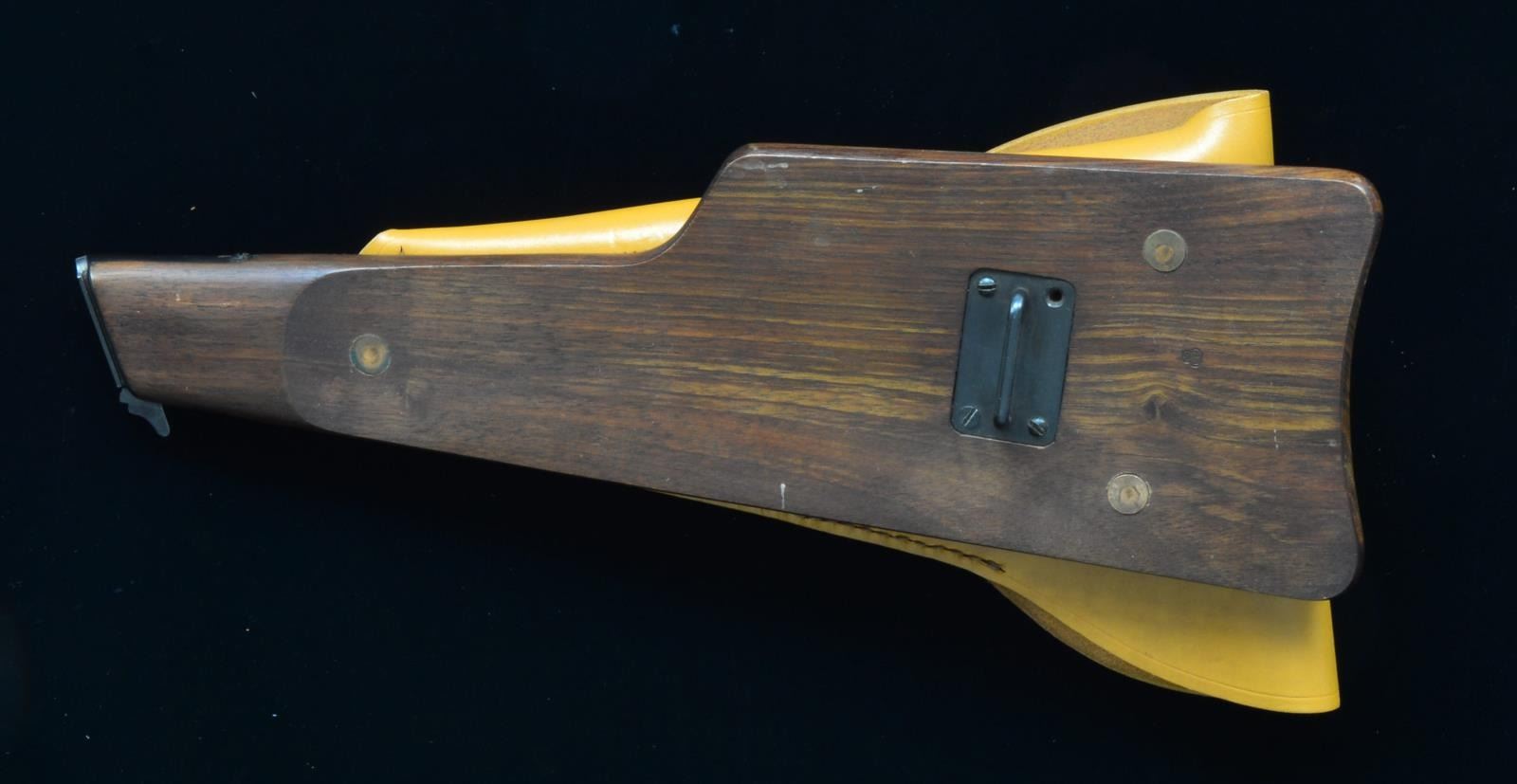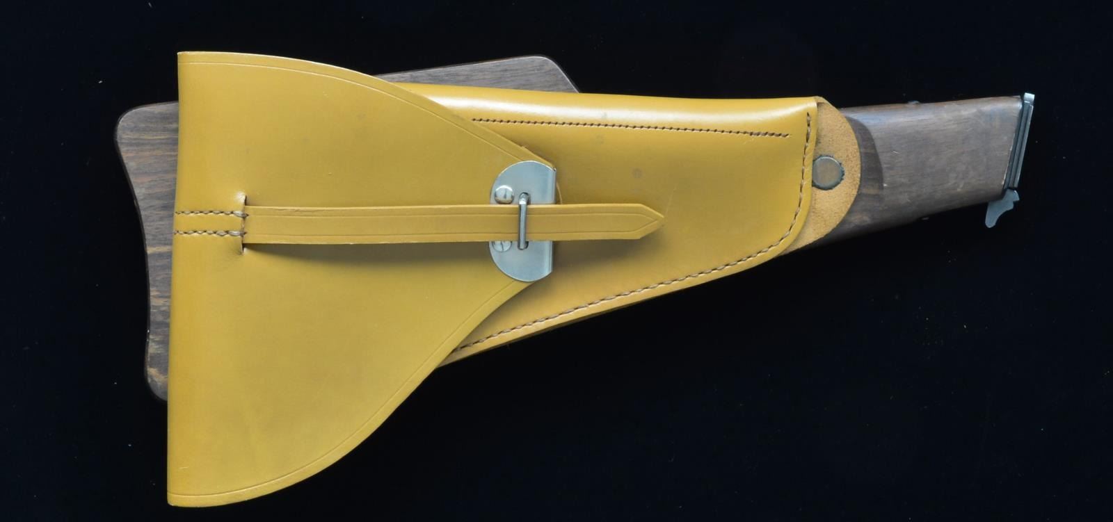 These stocks were finished in the postwar era utilizing undelivered Belgian military stocks w/ newly made leather holsters. Featuring a rnd. stock contour around holster, sm. Belgian military acceptance marking, flush rivets & nickel finish holster hardware w/ 2 rivets. Purchased directly from the FN factory by our consignor. REFERENCE: illustrated in Anthony Vanderlinden's book. CONDITION: overall near excellent w/ only a few minor scuffs & handling marks. Sharp crisp cartouche. (02–13748/ZAL). $600–800.