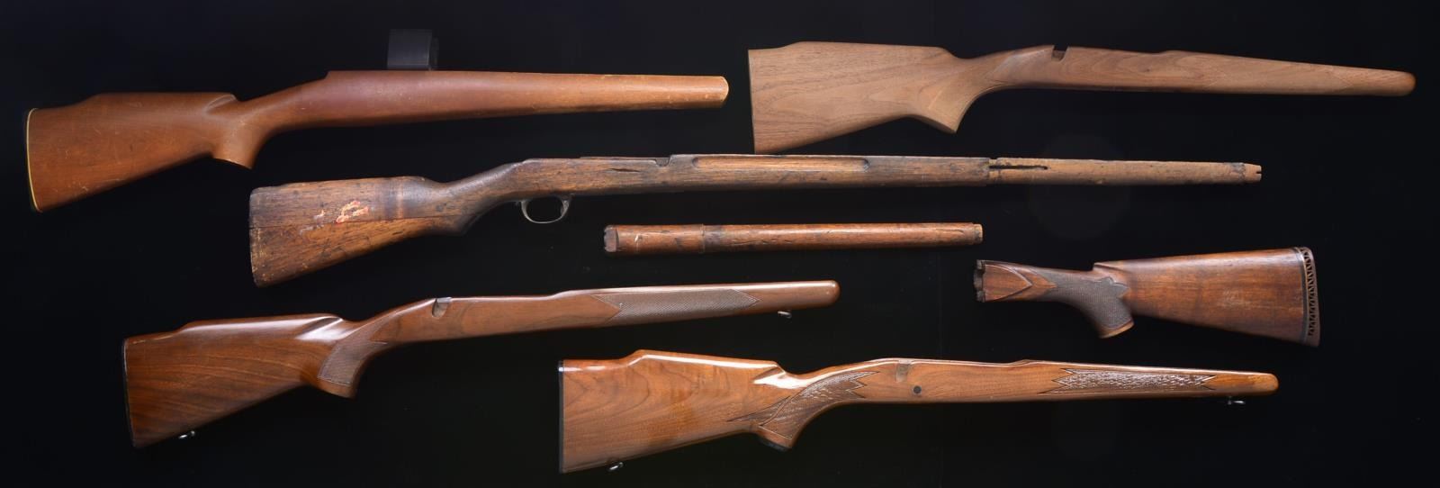 DEMONSTRATION STOCK. 1) WINCHESTER MODEL 70 PRE 64 MONTE CARLO STOCK. Checkered walnut w/ sling swivels & original checkered plastic buttplate. CONDITION: very good original finish showing sm. dents & marks. 2) WINCHESTER PRE 64 MODEL 70 MONTE CARLO STOCK. Checkered black walnut. Cut to approx. 1" shorter than standard length w/ no buttplate included. CONDITION: stripped & lightly sanded ready for finishing showing some light marks. 3) WINCHESTER POST 64 MODEL 70. Monte Carlo cheekpiece w/ pressed checkering, sling swivels , red "W" steel grip cap & checkered steel buttplate. CONDITION: original finish shows wear spots w/ scattered scratches & handling marks. 4) JAPANESE ARISAKA STOCK & HANDGUARD. For approx. 28" bbl. Includes trigger guard. CONDITION: dark worn appearance w/ numerous dents, scratches & handling marks. Having sm. cracks at front of forearm. 5) STEVENS SXS TENITE STOCK REPLACEMENT. American walnut w/ contrasting grip cap & hand checkering. Overall length from action to end of aftermarket pad 15 5/8". CONDITION: finish shows light wear. Pad has hole for through bolt attachment. 6) SCOPE DEMONSTRATION STOCK. Monte Carlo cheekpiece of walnut construction w/ rubber scope holding block on top. Overall length to Bishop buttplate 32 1/4". CONDITION: lightly worn finish showing numerous scratches & marks. (02-14081 (6) /DS). $250-500.