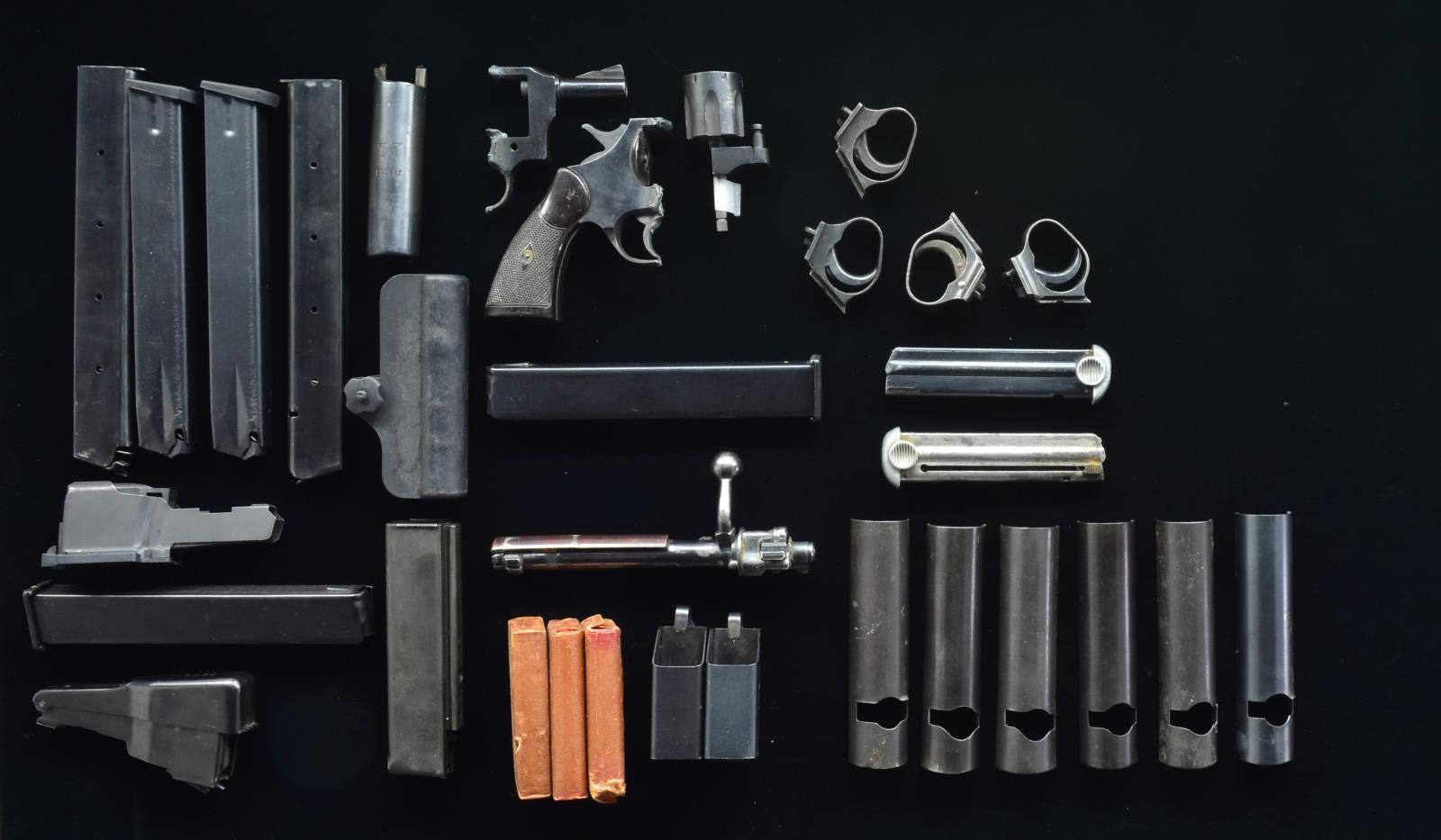Lot includes: torch cut Miroku revolver. / Remington 500 series bolt. / Mauser 98 bolt. / 1-10 Rd. SKS integral mag. / 1-5 Rd. removable SKS mag. / 3-20 Rd. 1 Tula arsenal marked 1951 SKS top cover. 30 Carb. Mags. still in oil paper. / 2 Cobray 45 ACP Mac mag. loaders. / 1-9mm Cobray mag. loader. / 2-30 Rd. Hi Power mags. / 2-15 rd. 1911 mags. / 1 “Auto Ordnance Corp” marked 20 rd Thompson mag. / 2 Unidentified 45 ACP 30 rd. mags. / 5 Unidentified 30 rd. 9mm mags. / 6 Arisaka dust covers. / 4 Unknown trigger guards w/ triggers. / 2 Type 14 Nambu mags. / 1 Miniature 8"x12" telescopic Japanese pilot bail out flag. CONDITION: overall ranges from fair to good. (02-14109/JZ). $200-400.